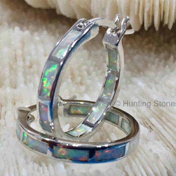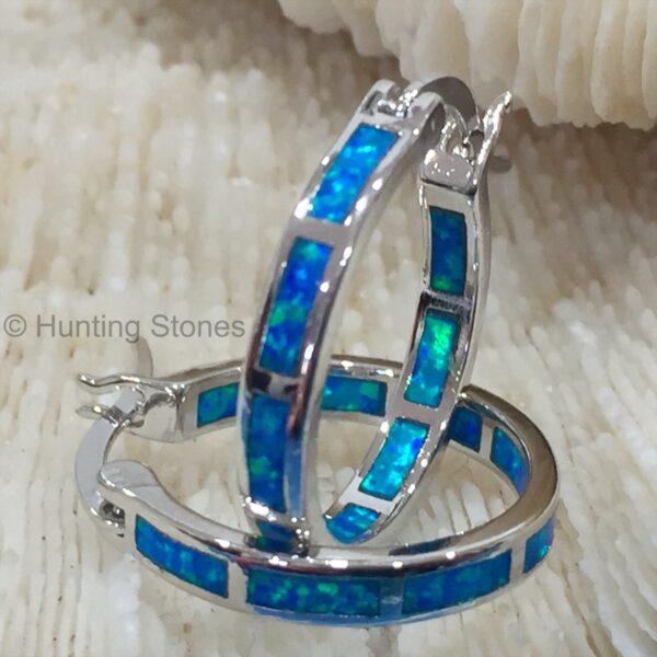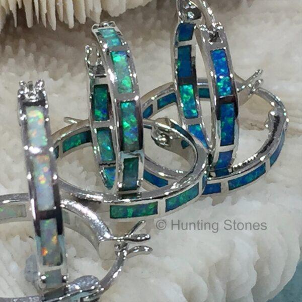 Beautiful silver inlay Fire Opal Hoop Earrings in your choice of 3 colours – Blue, white or Green
