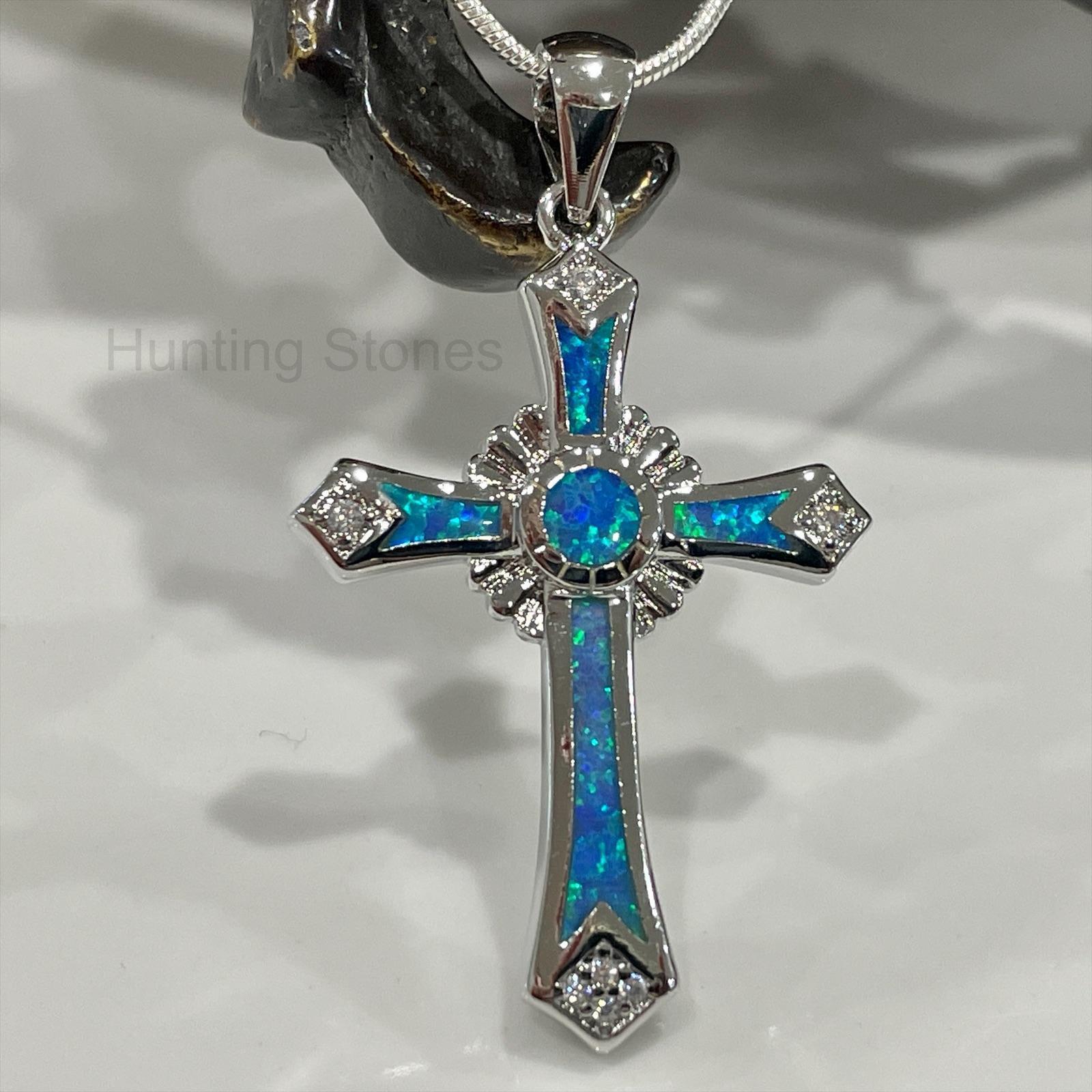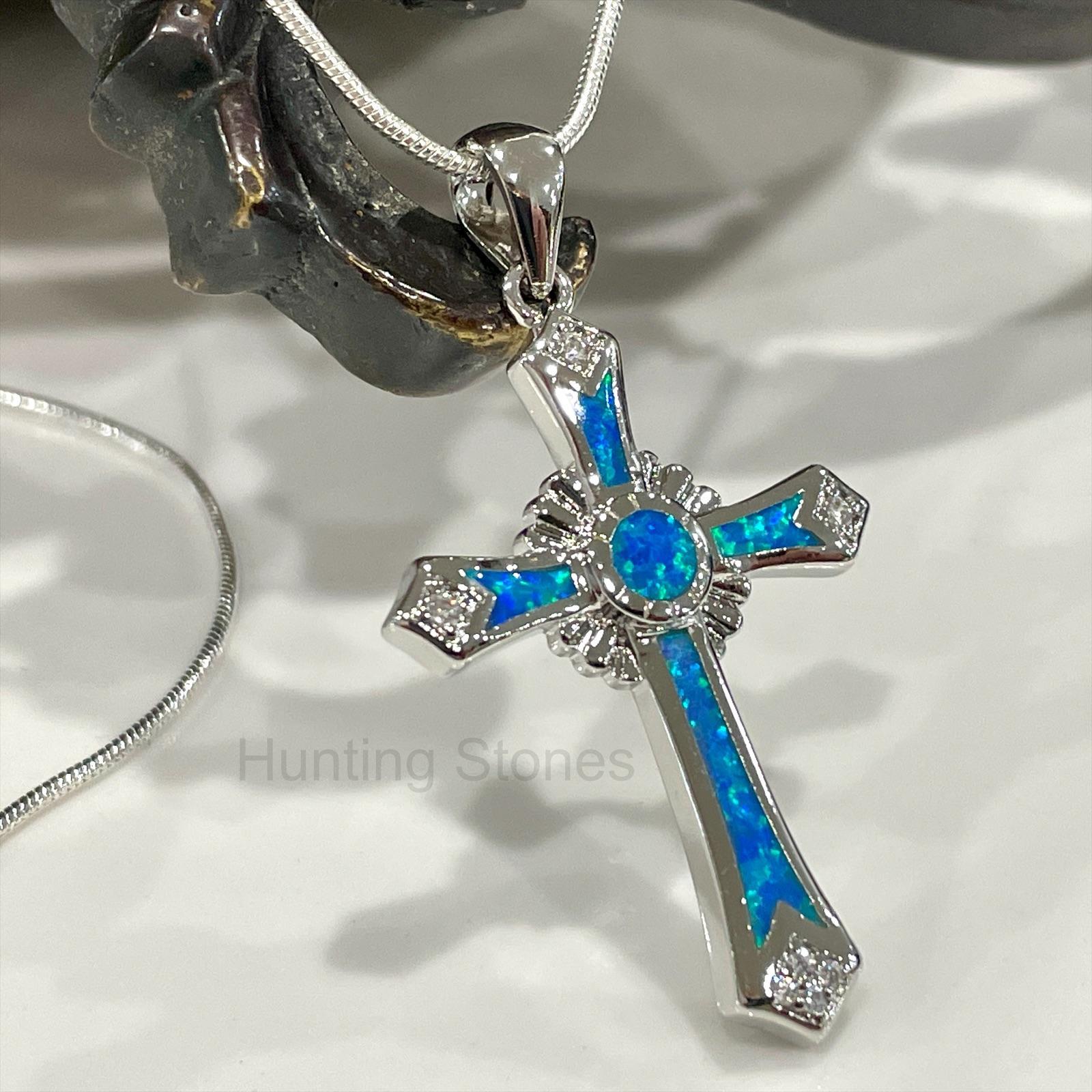 Stunning Fire Opal Cross Crystal Necklace – Silver inlay Blue 35 mm