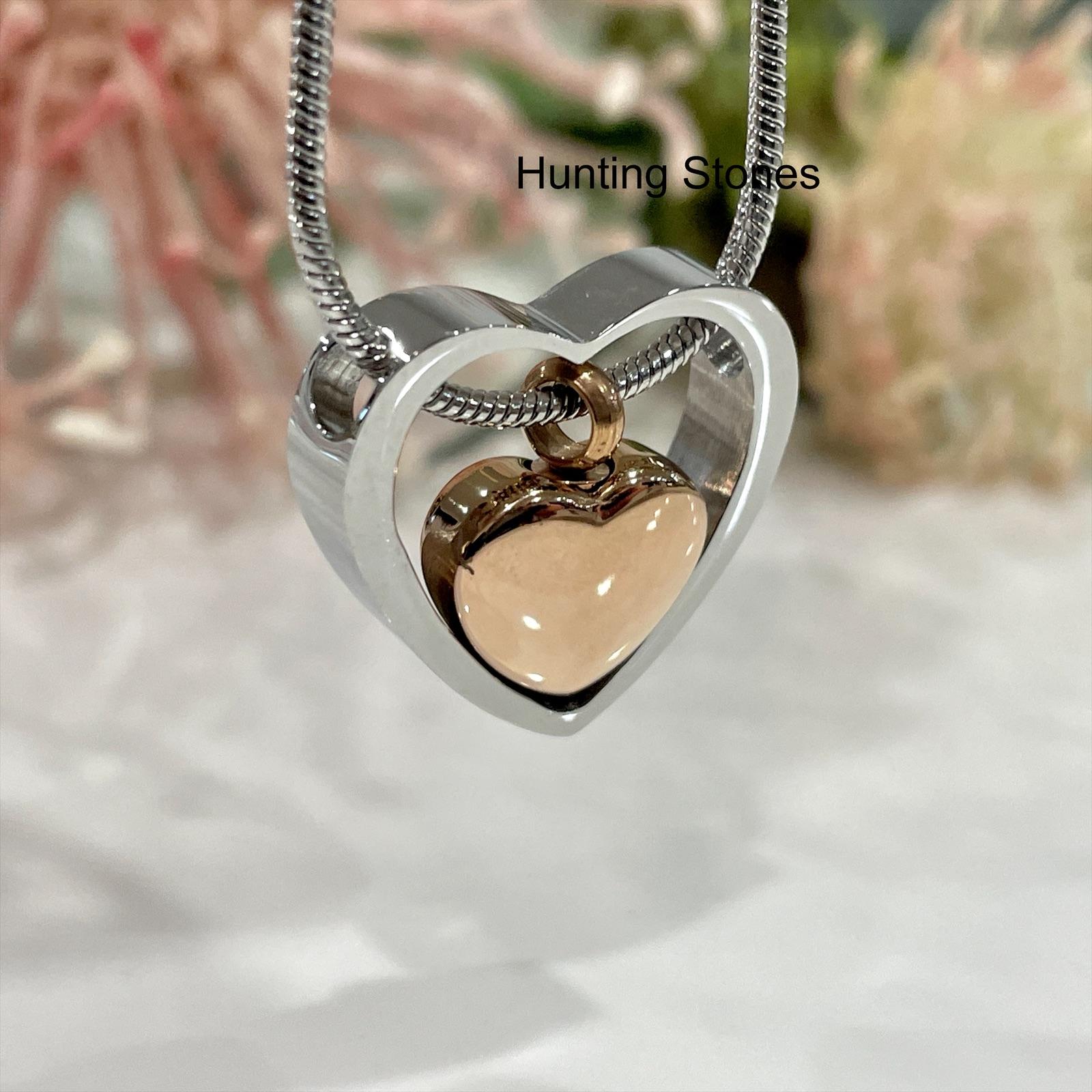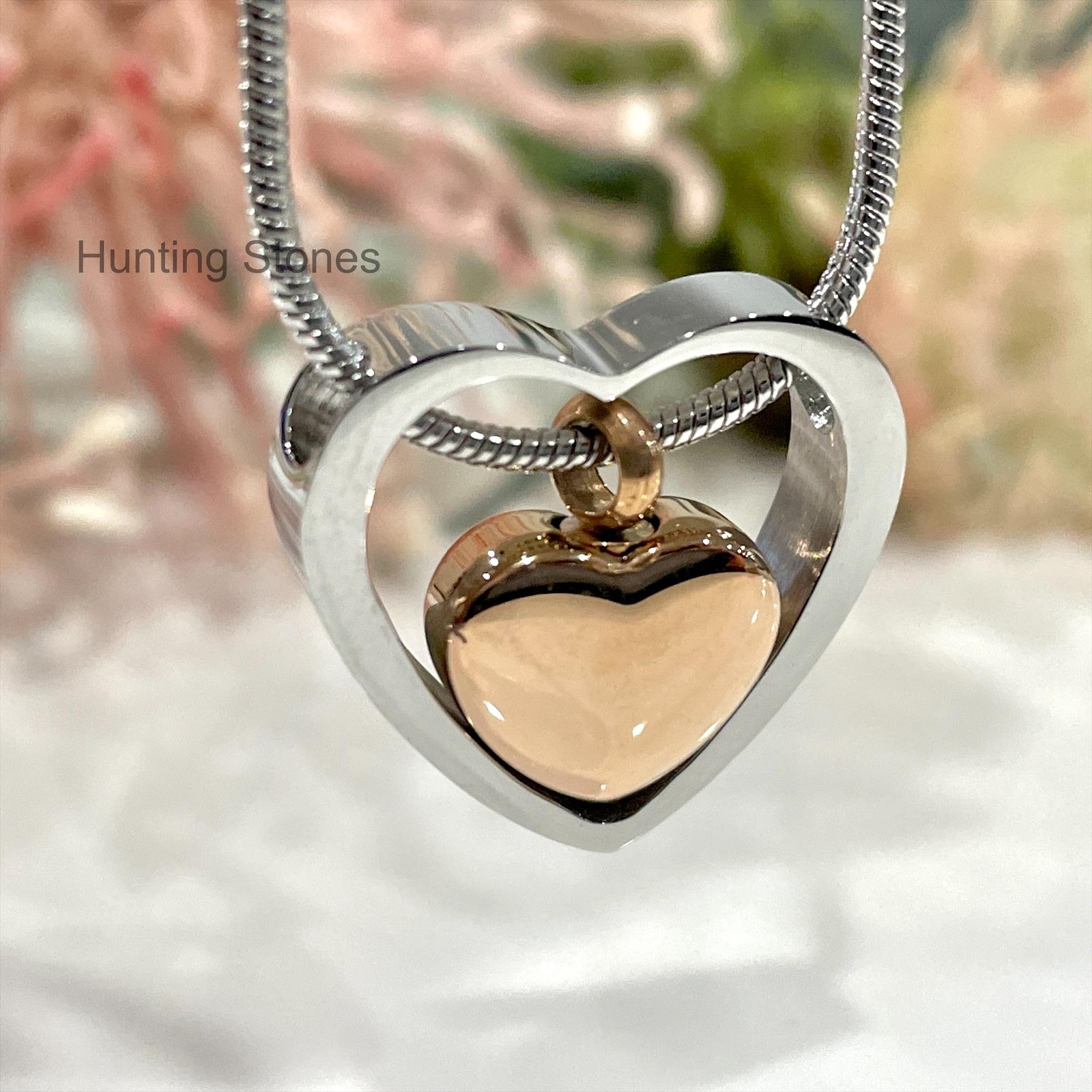Beautiful polished stainless steel heart pendant with smaller floating stainless steel heart urn plated with Rose Gold . The centre floating heart is designed to hold a small amount of cremation ashes of a loved one, or you can place a small lock of hair. It can also be used to hold crushed flower petals or carry with you a small amount of soil or sand or petals from a memorable location.