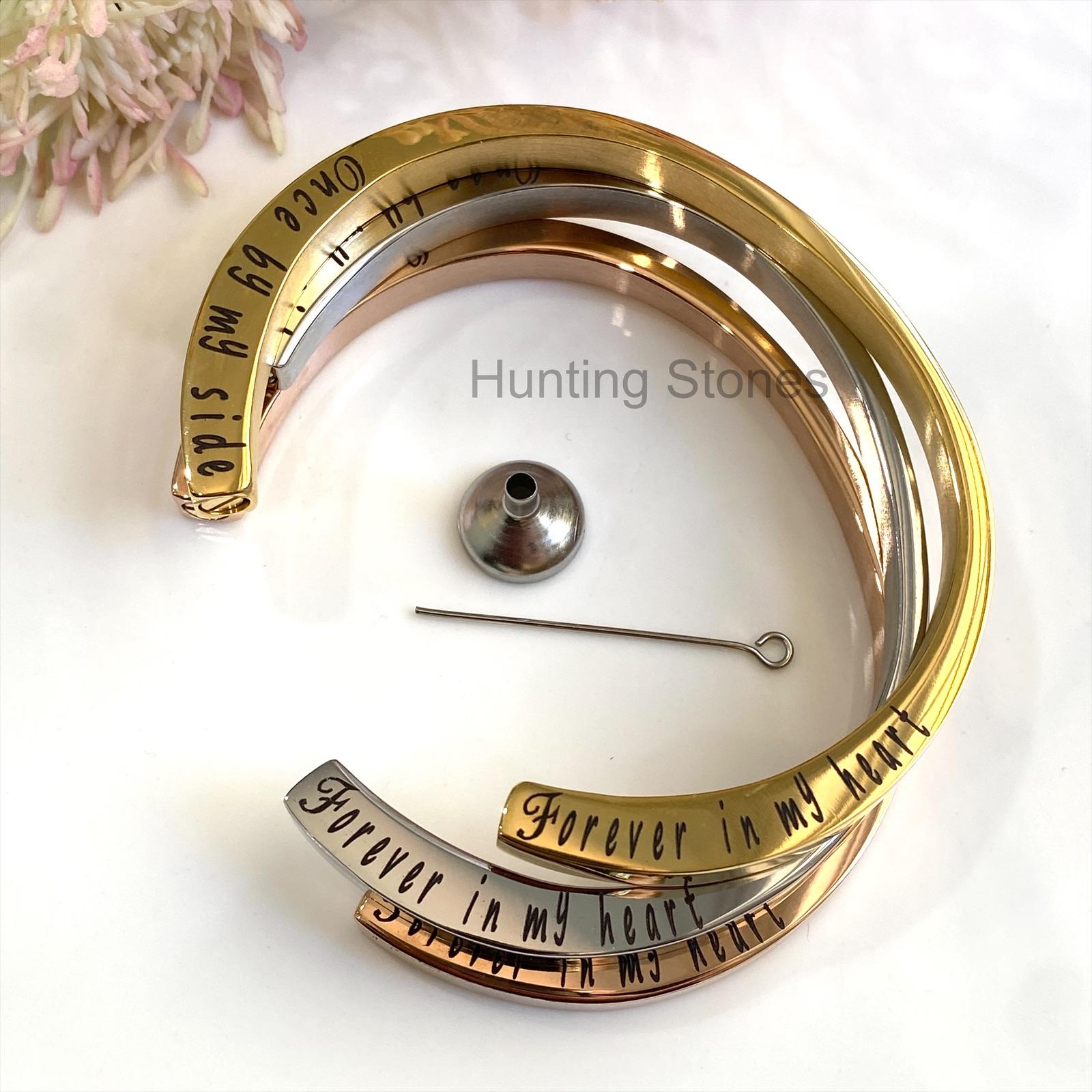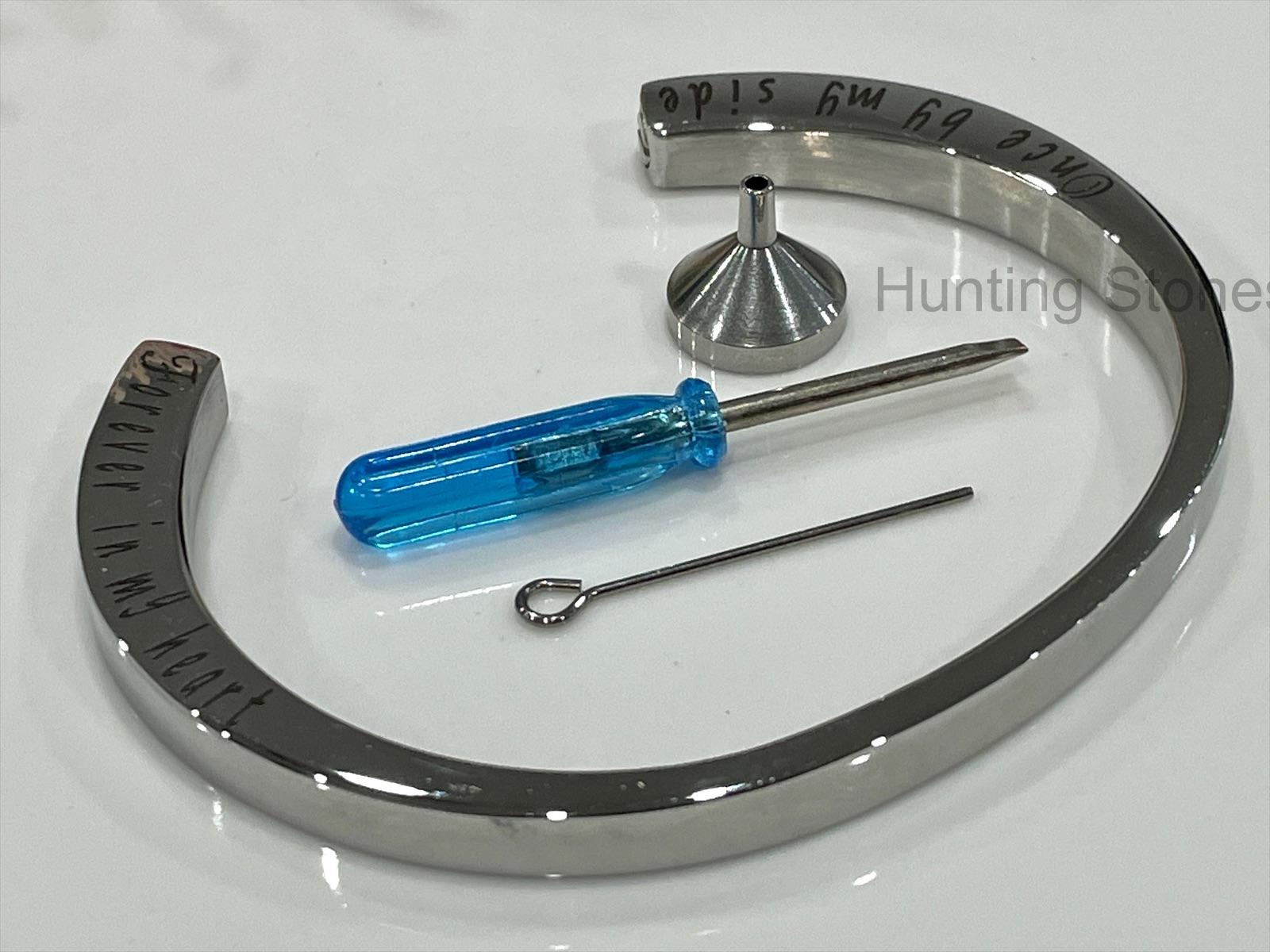 Beautiful polished stainless steel bracelet designed to hold a small amount of cremation ashes of a loved one, or you can place a small lock of hair. It can also be used to hold crushed flower petals or carry with you a small amount of soil or sand or petals from a memorable location.
