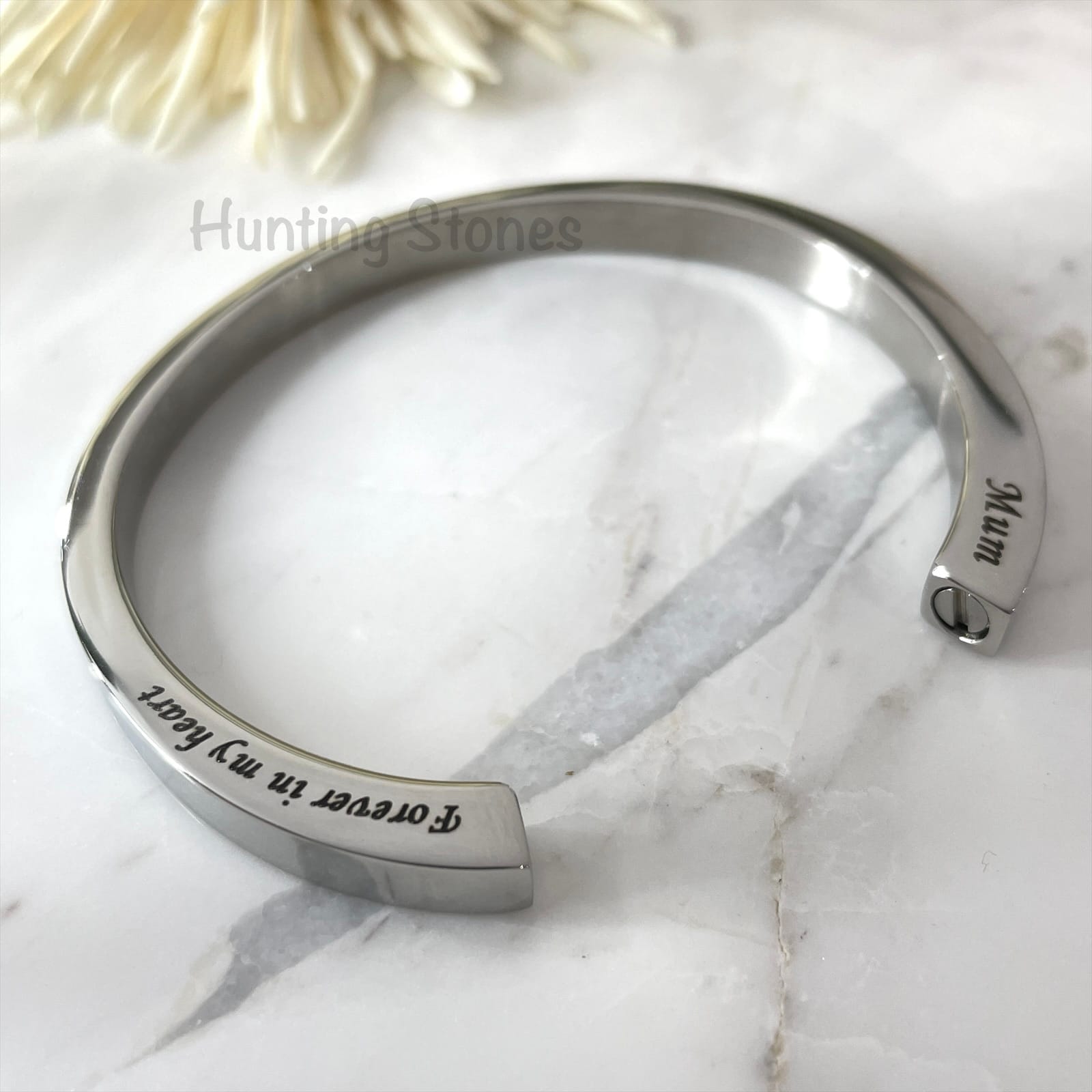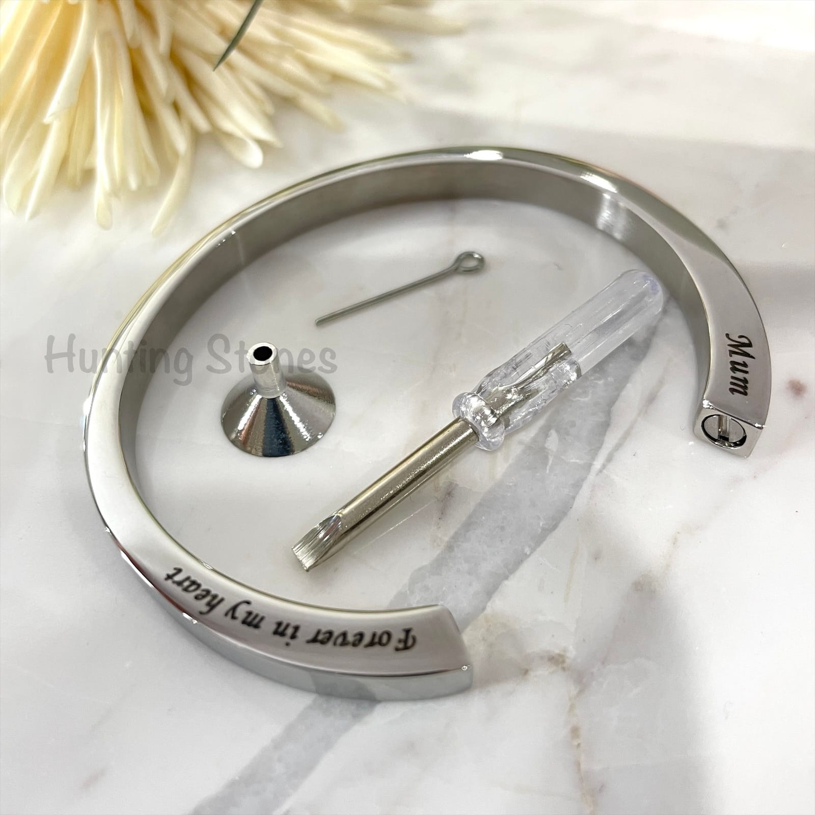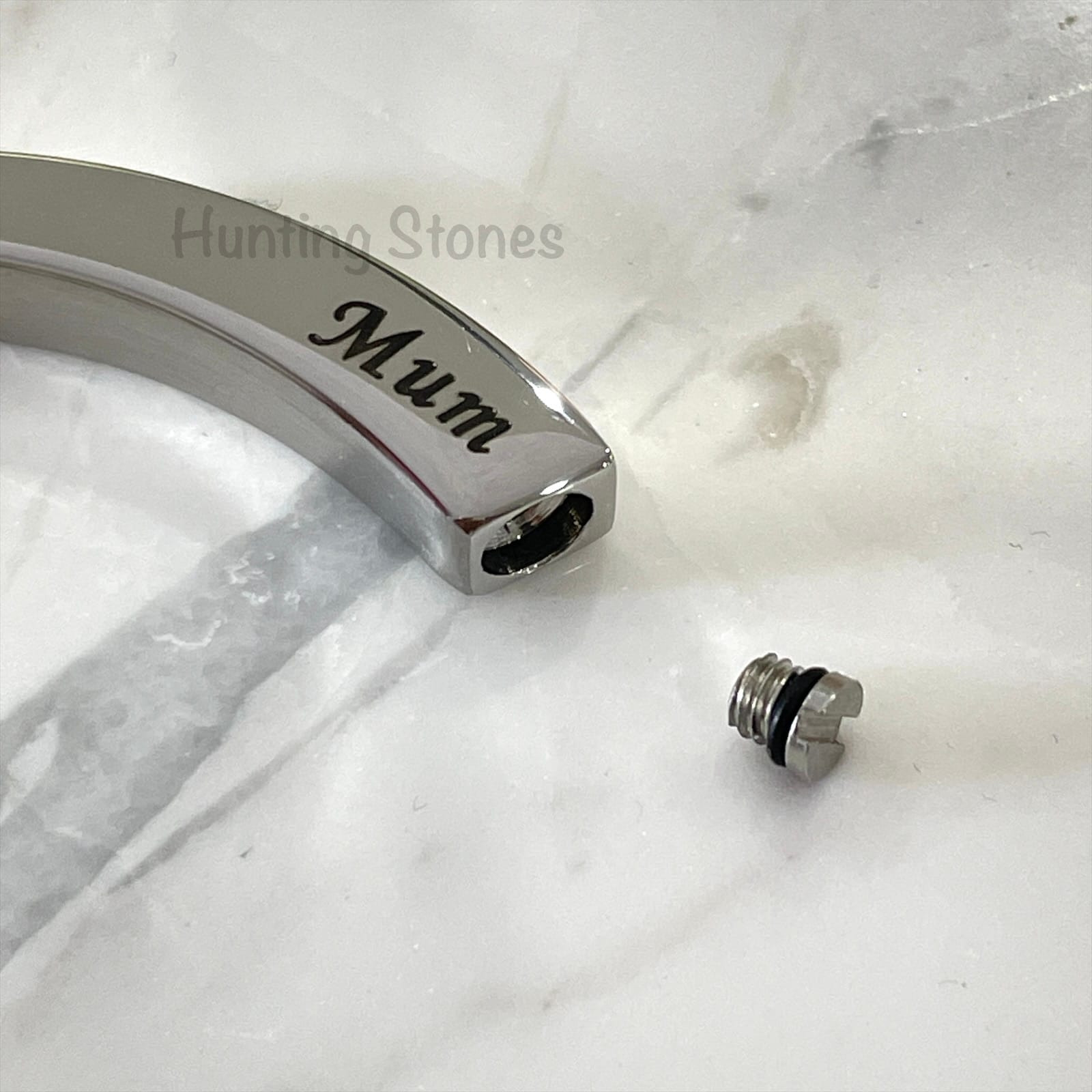 Beautiful polished stainless steel bracelet designed to hold a small amount of cremation ashes of a loved one, or you can place a small lock of hair. It can also be used to hold crushed flower petals or carry with you a small amount of soil or sand or petals from a memorable location.