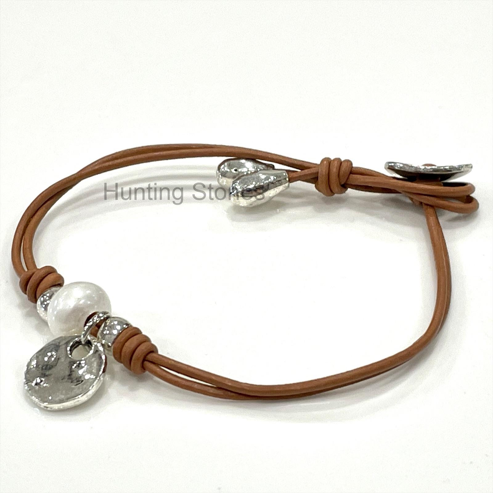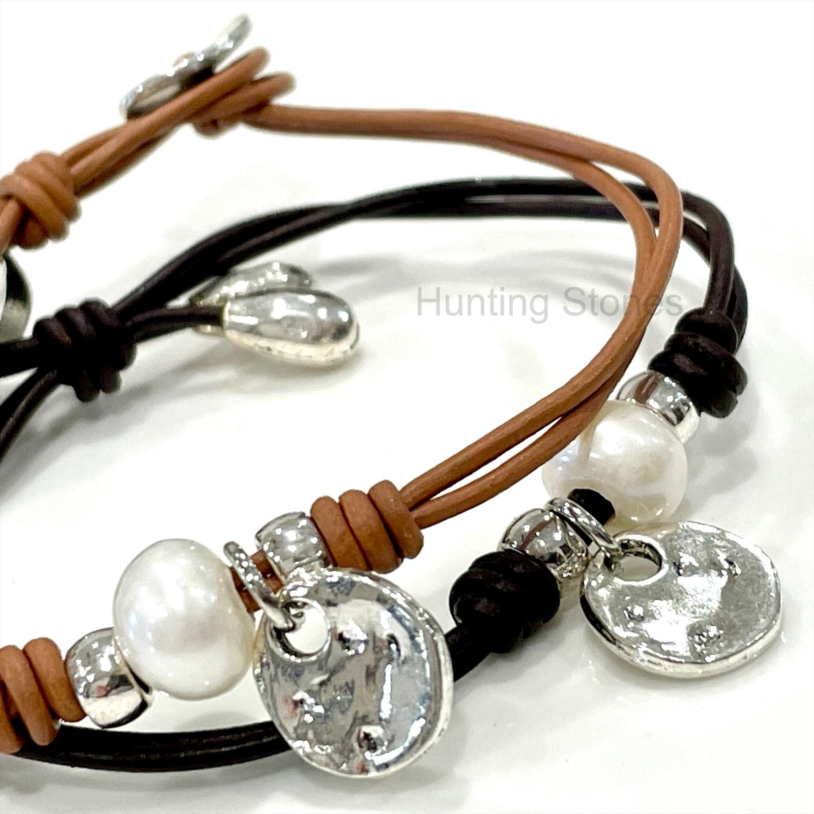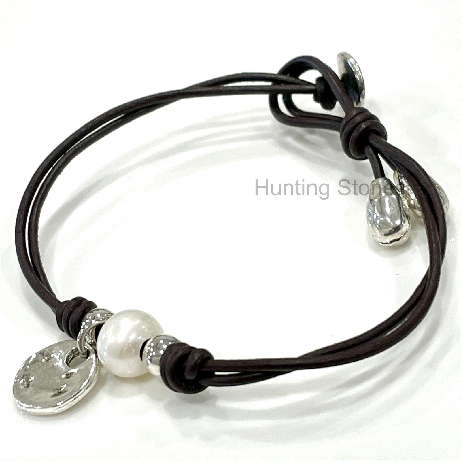 Genuine leather and imitation pearl with dangle disc charm bracelet