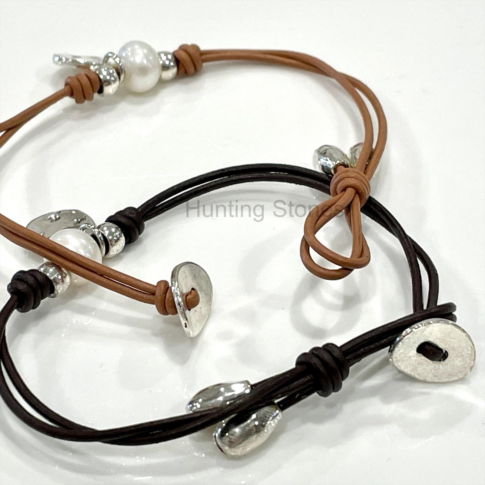 Genuine leather and imitation pearl with dangle disc charm bracelet 7.5 inch