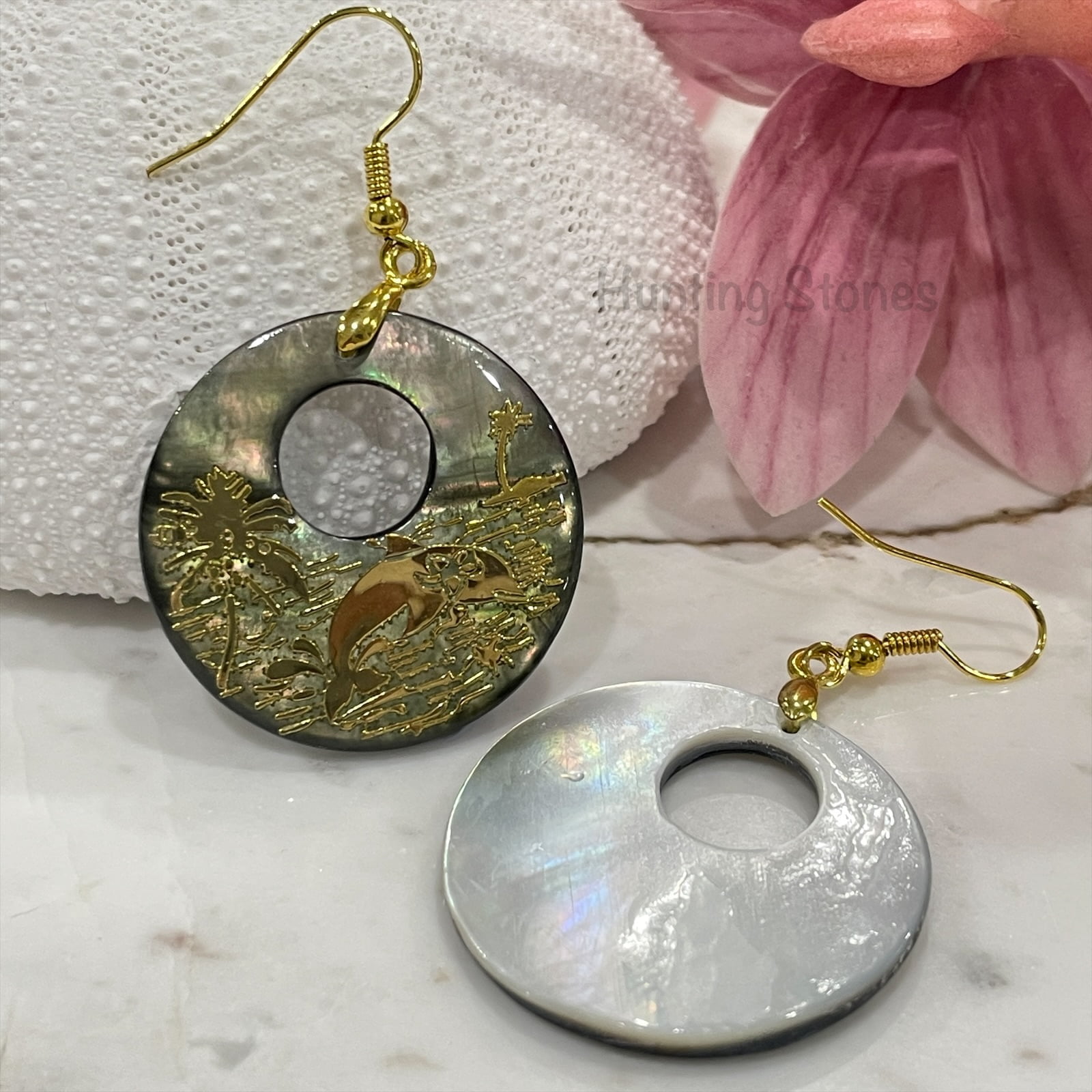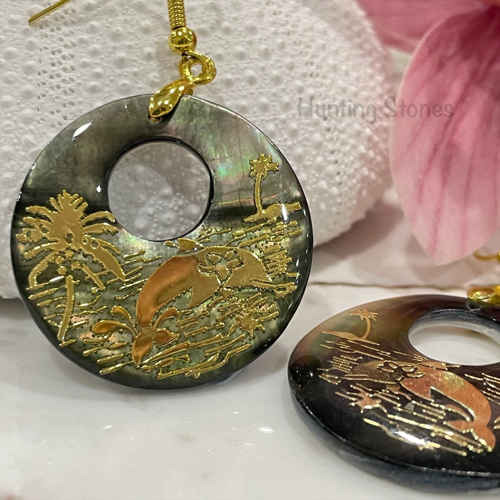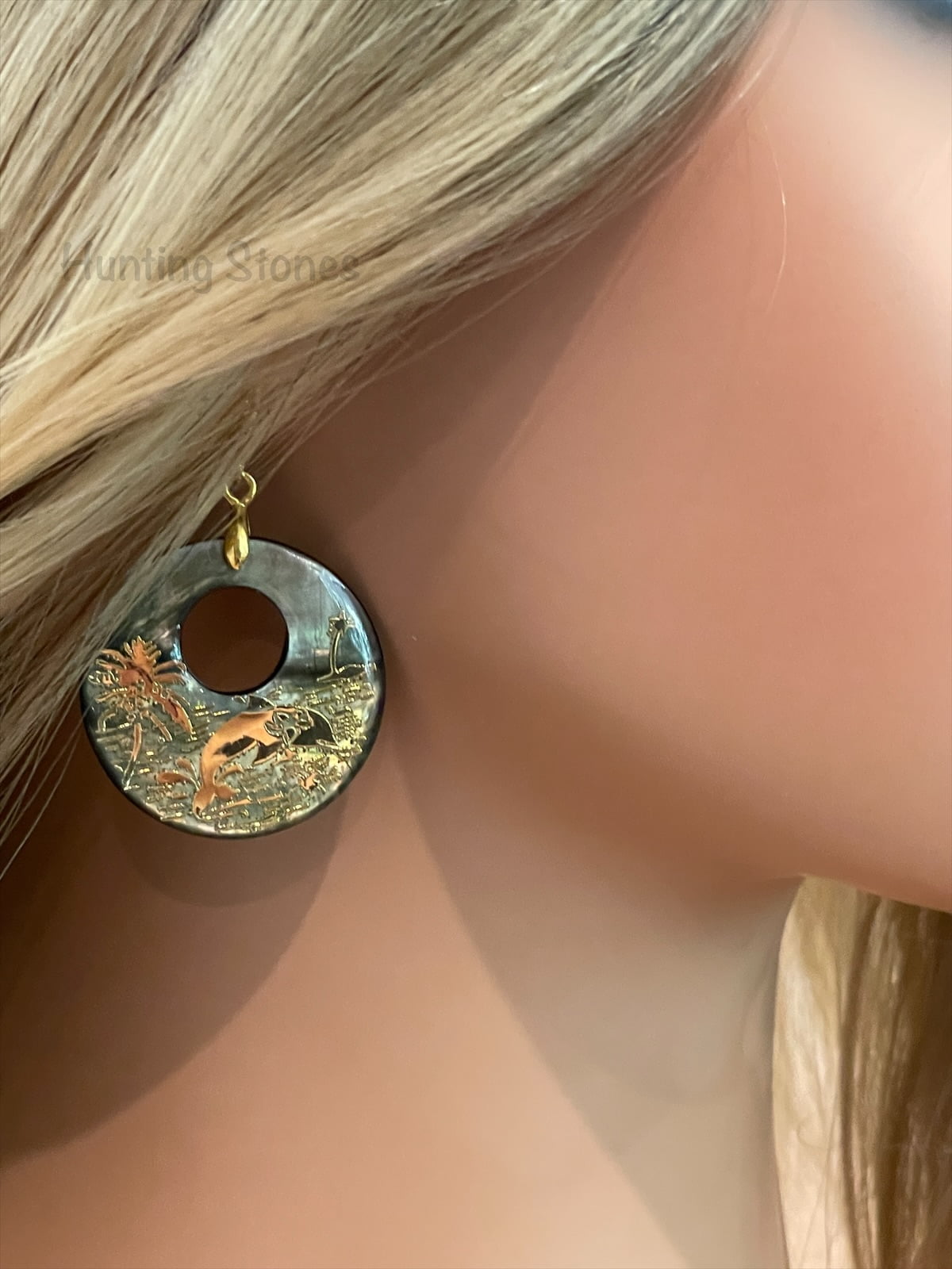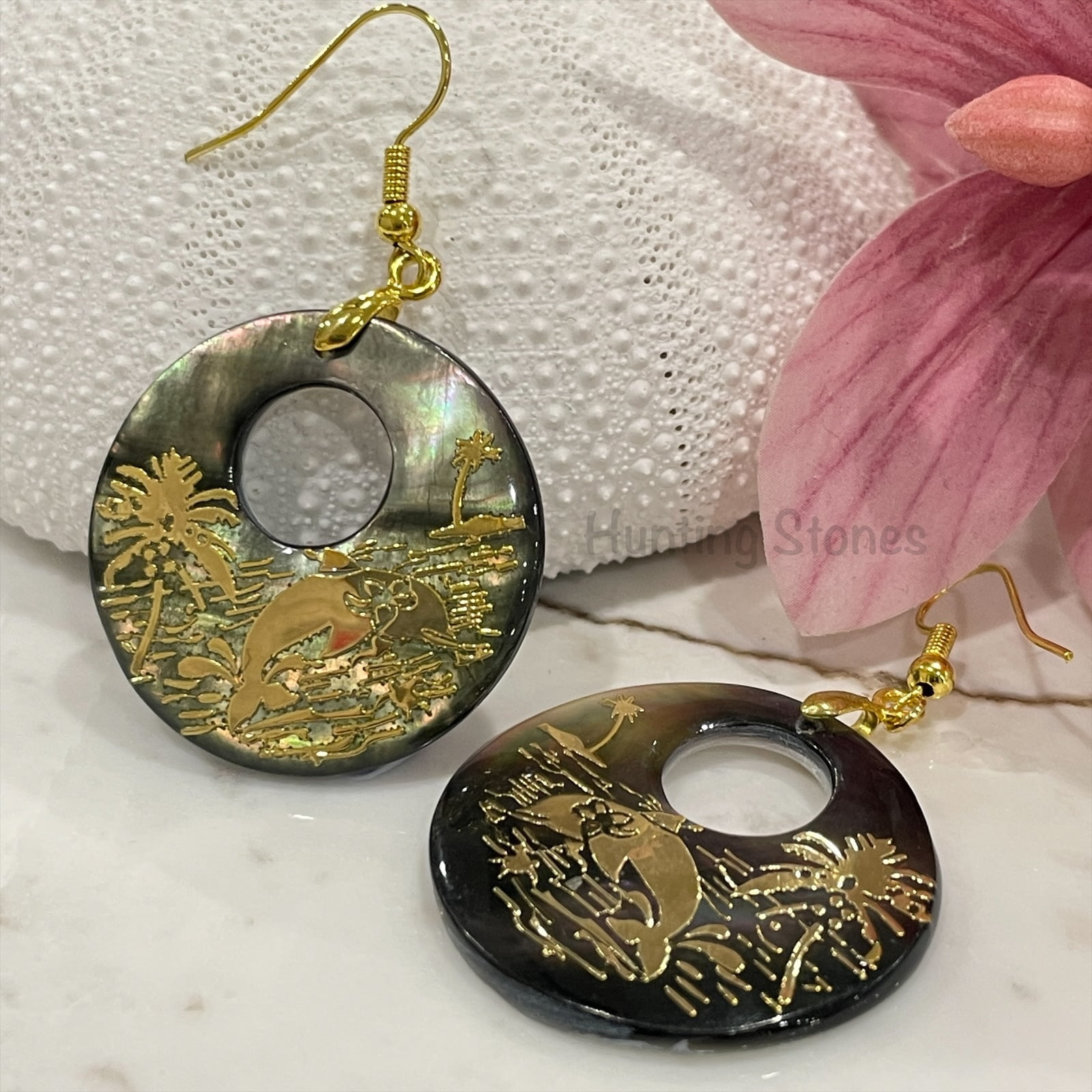 Beautiful handmade natural shell with gold foil dolphin tropical scene that has been sealed on the front to protect and provide a quality smooth finish