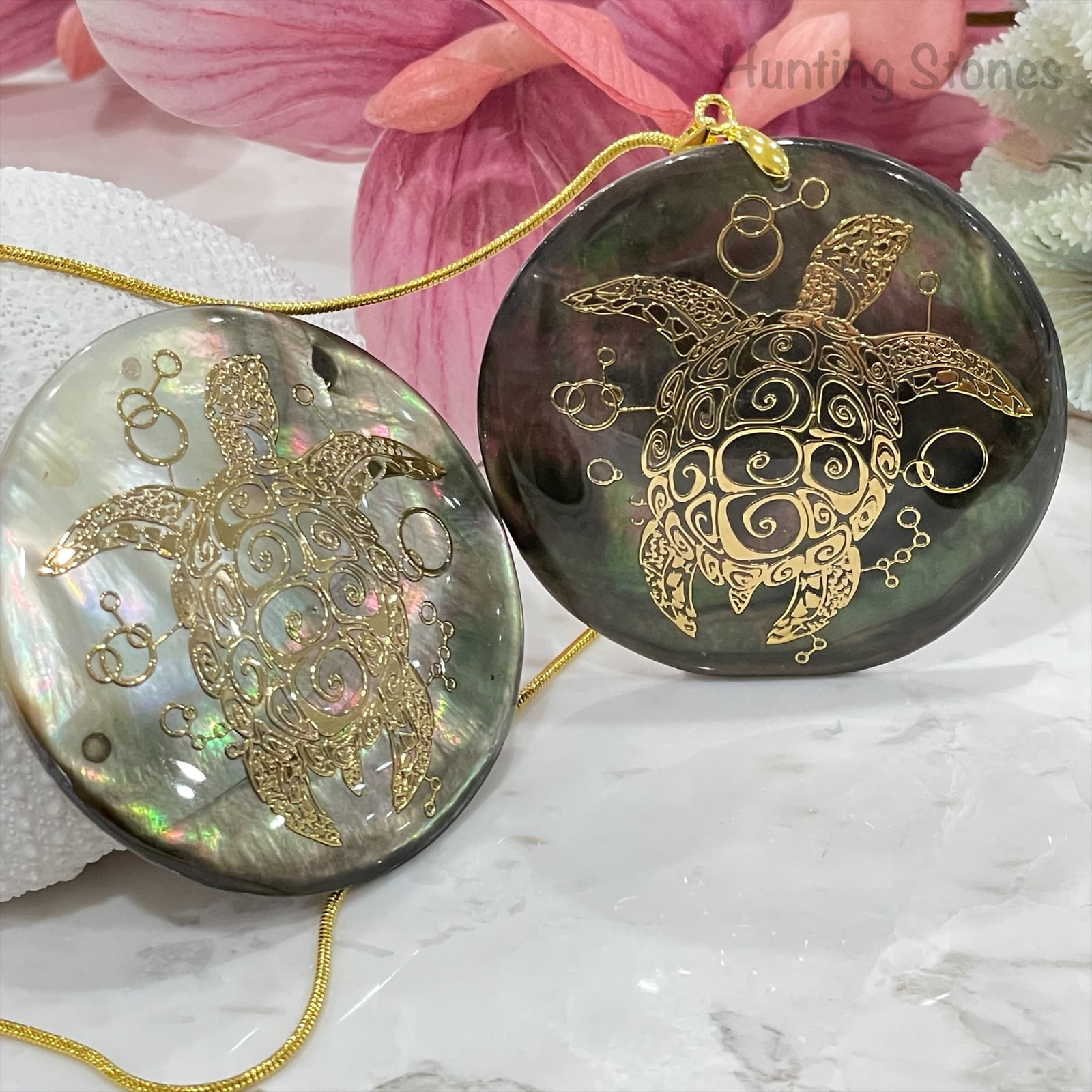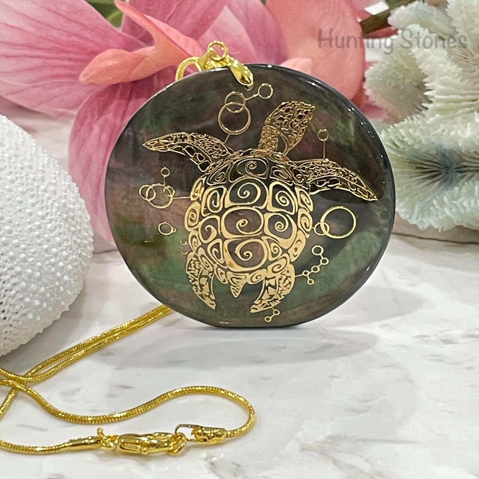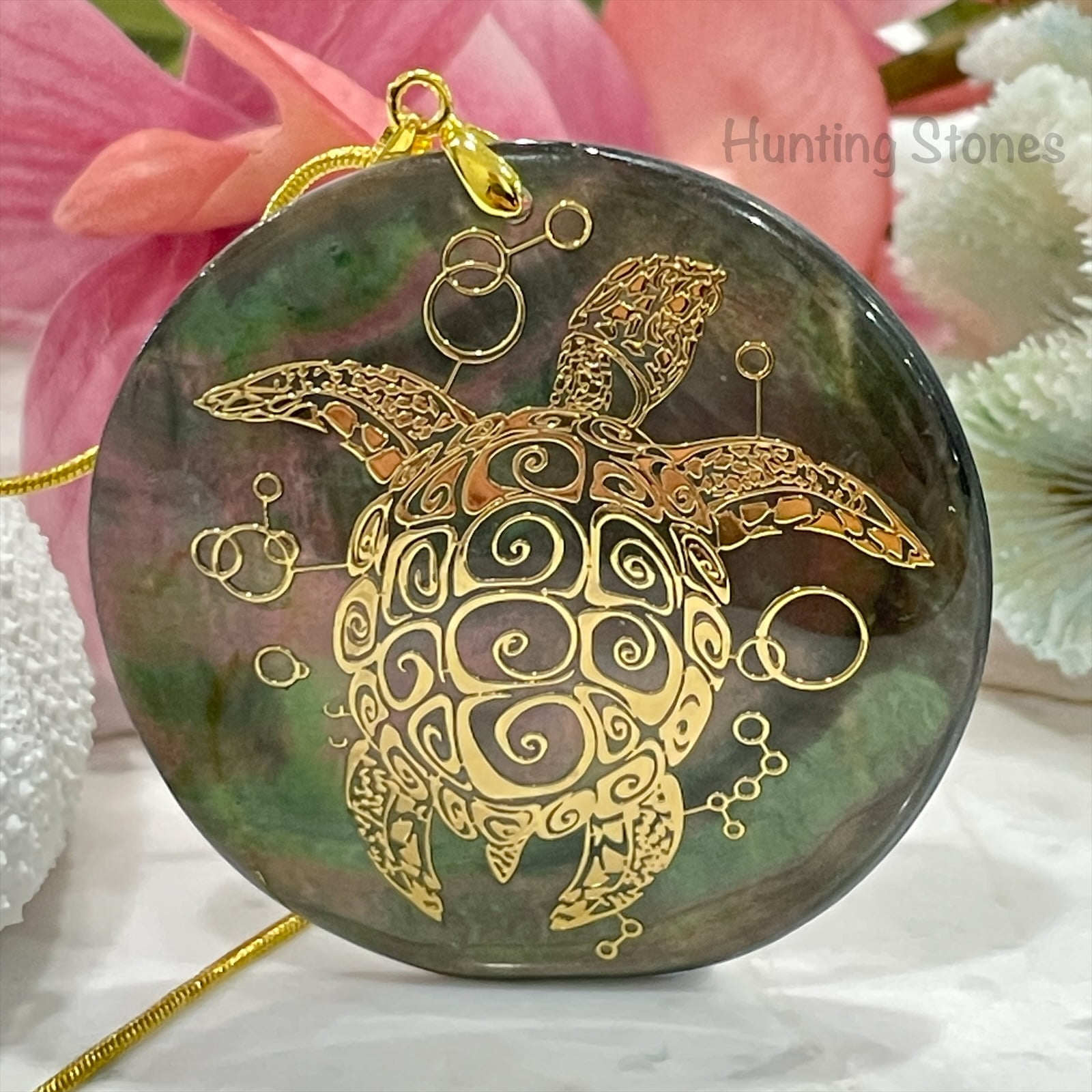 Handmade Natural Abalone Shell Honu Sea Turtle Necklace Gold 50mm