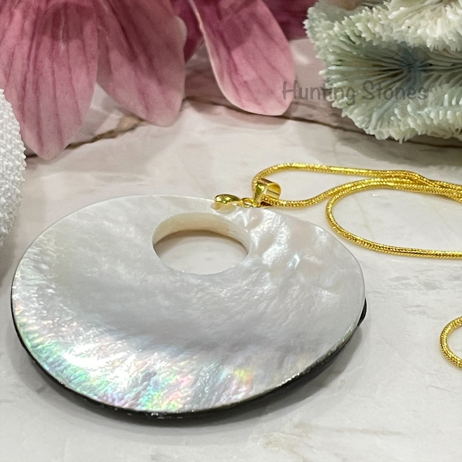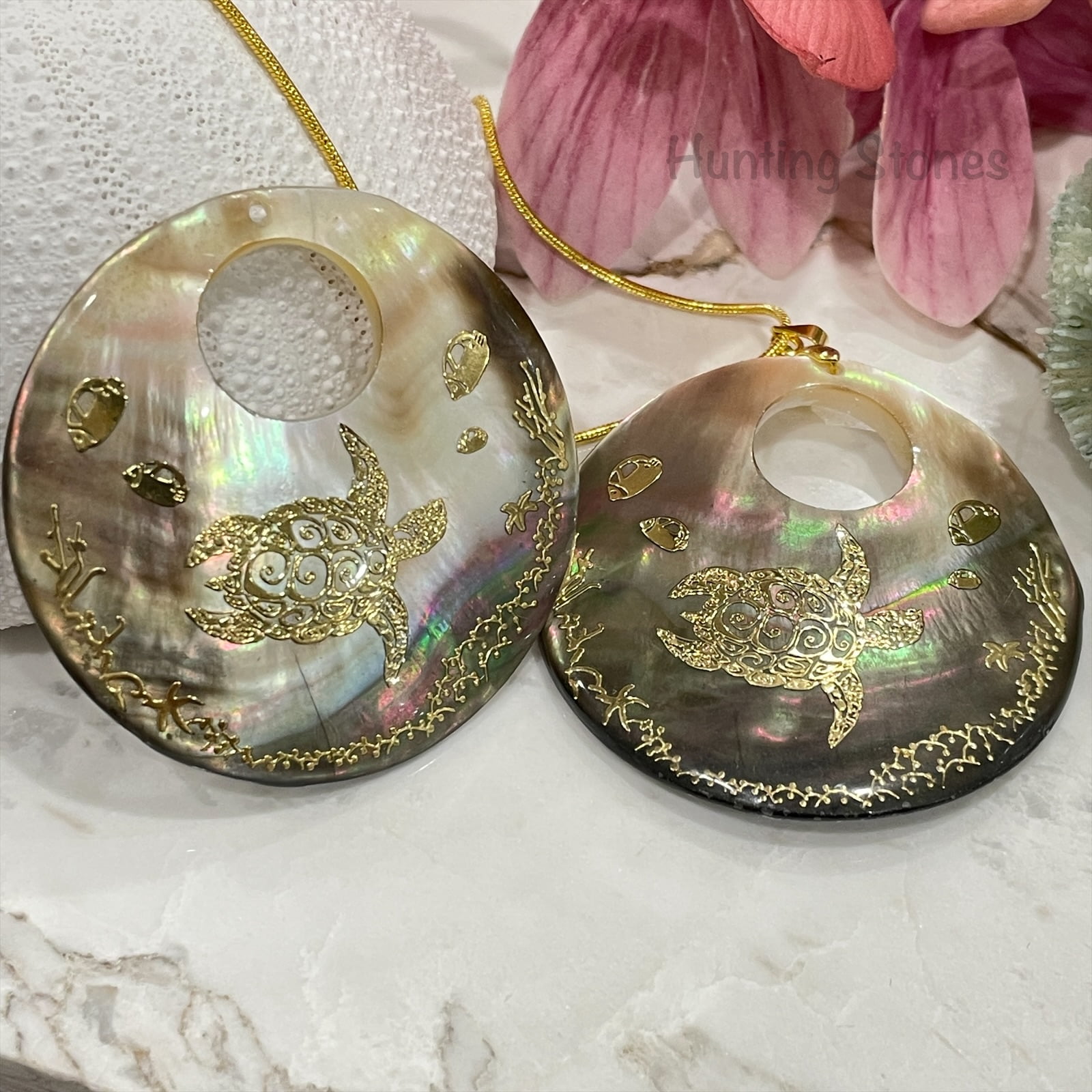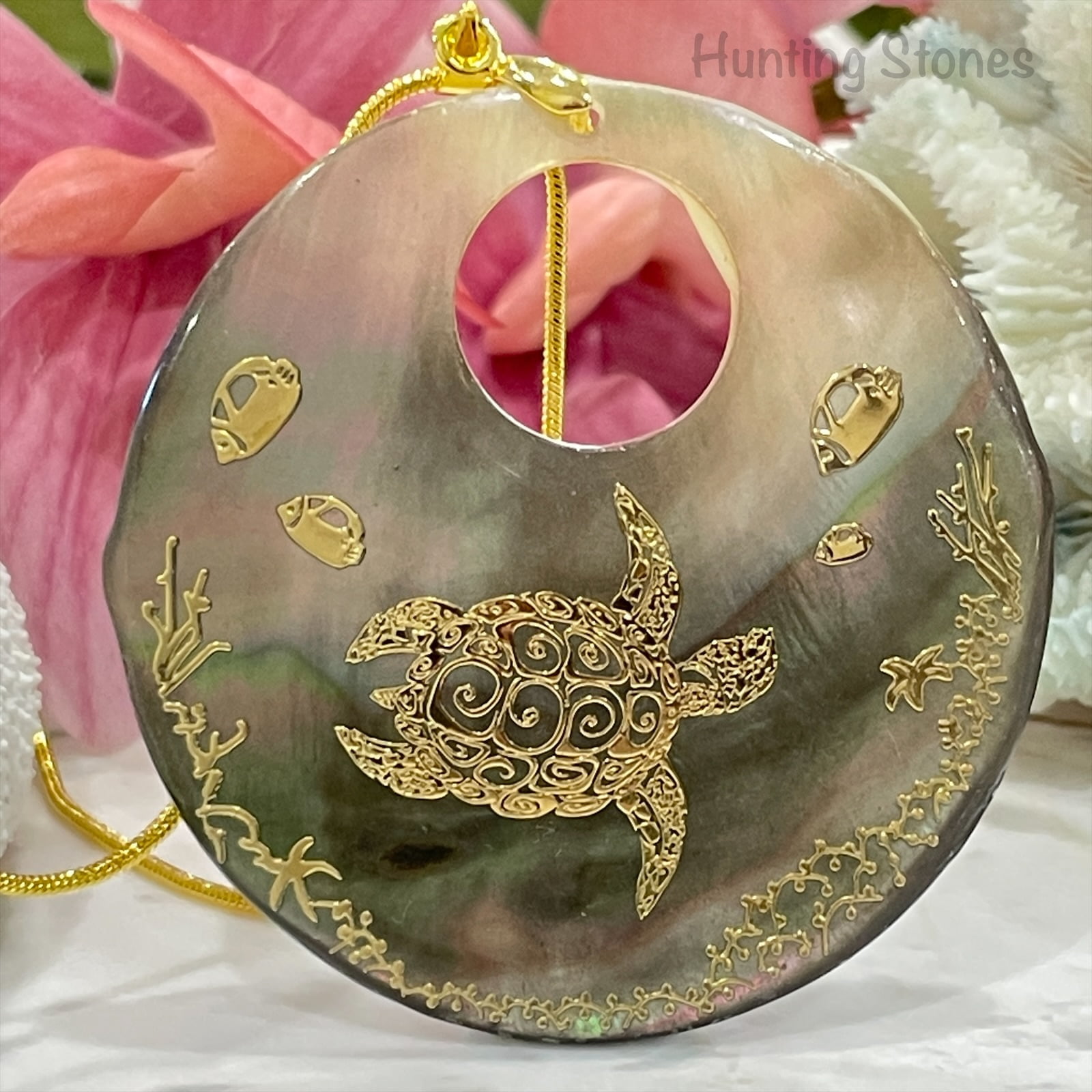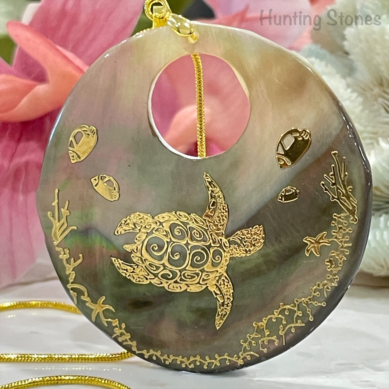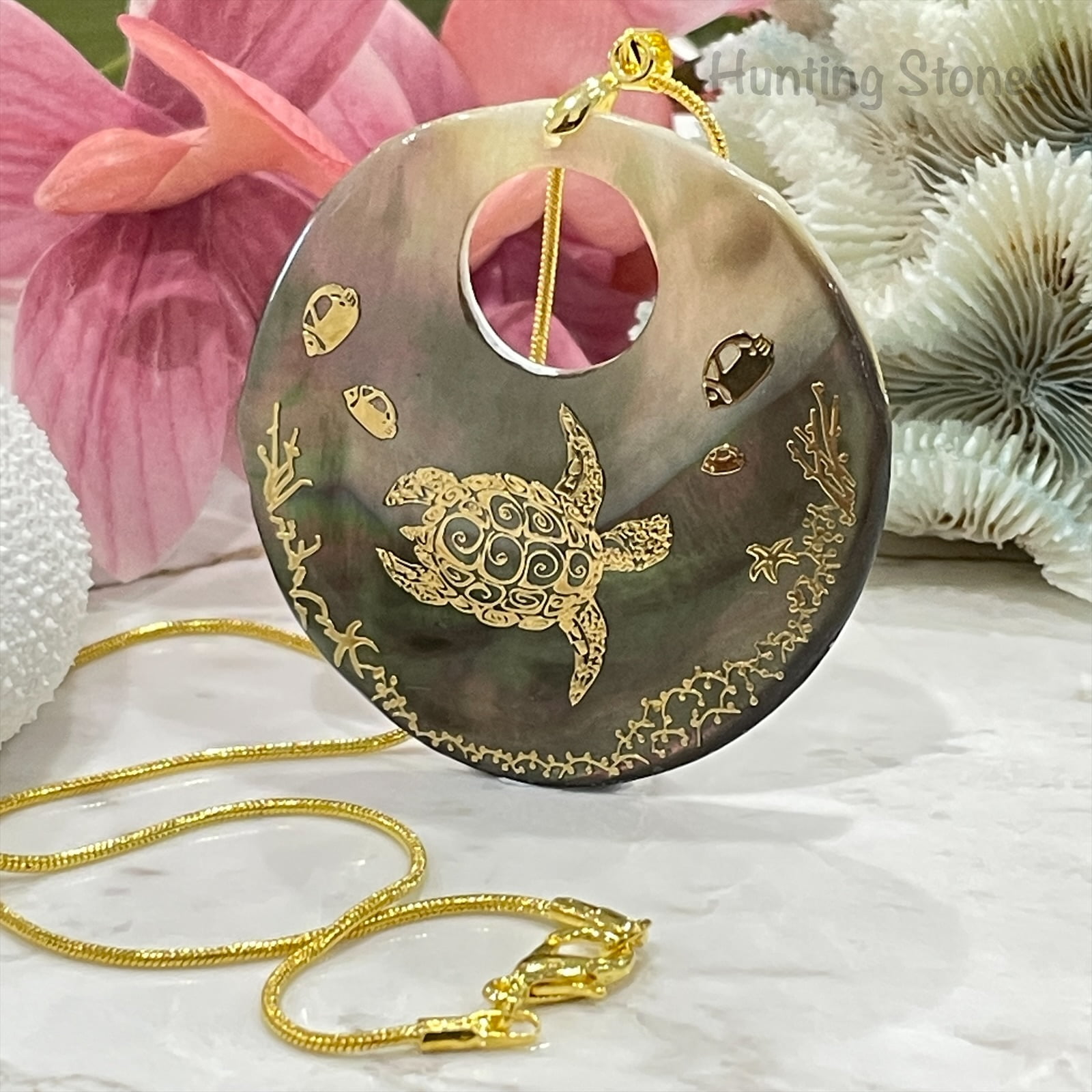 Beautiful handmade natural shell pendant with a gold foil sea turtle with spiral design on back design – reef scene that has been sealed on the front to protect and provide a quality smooth finish