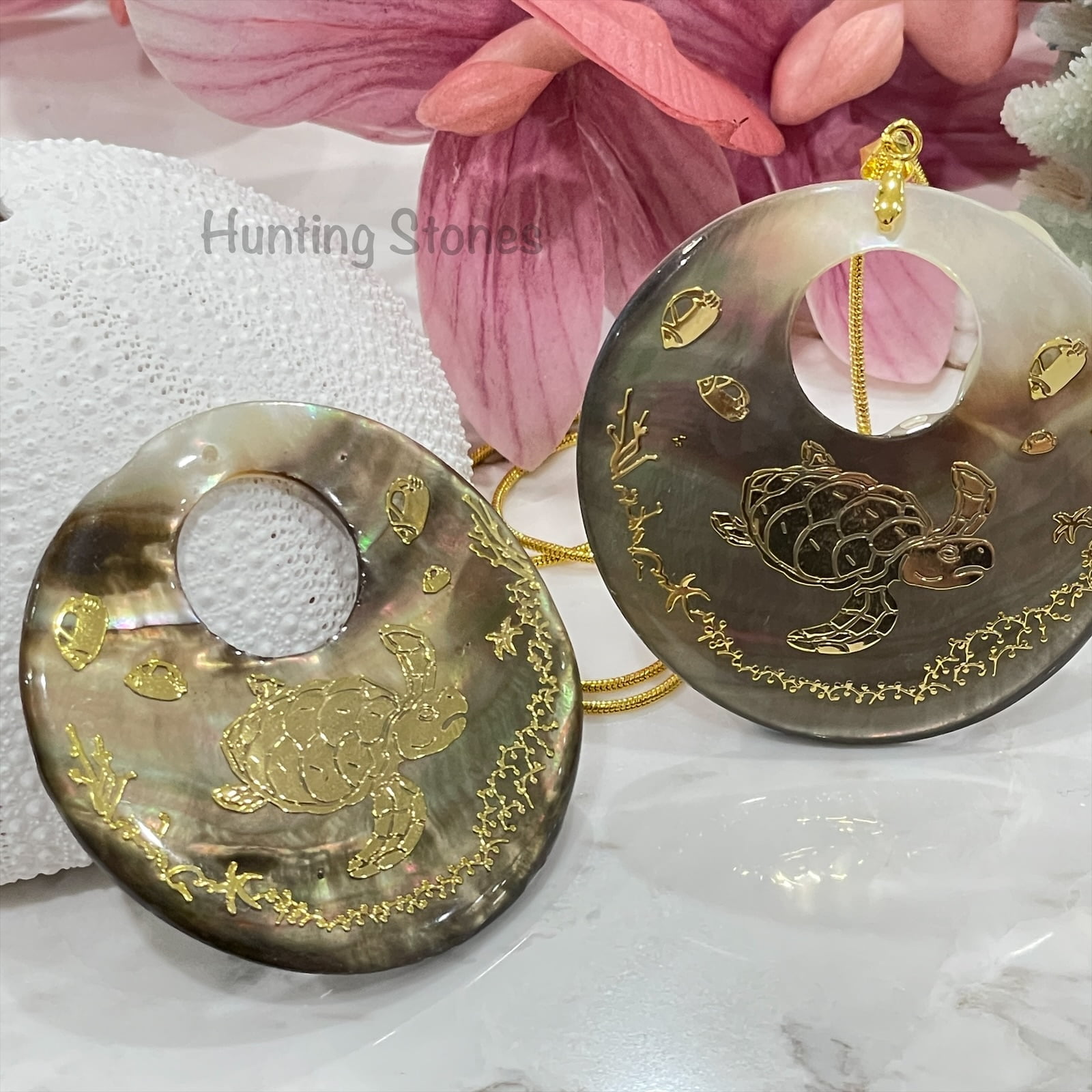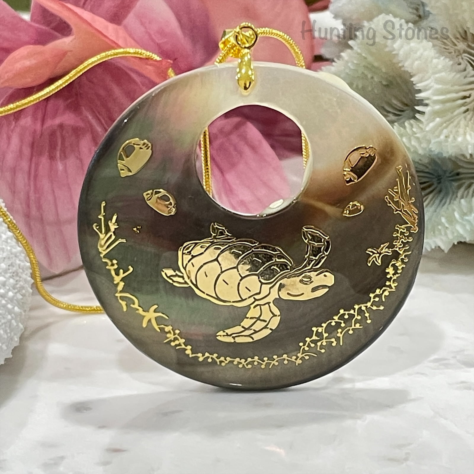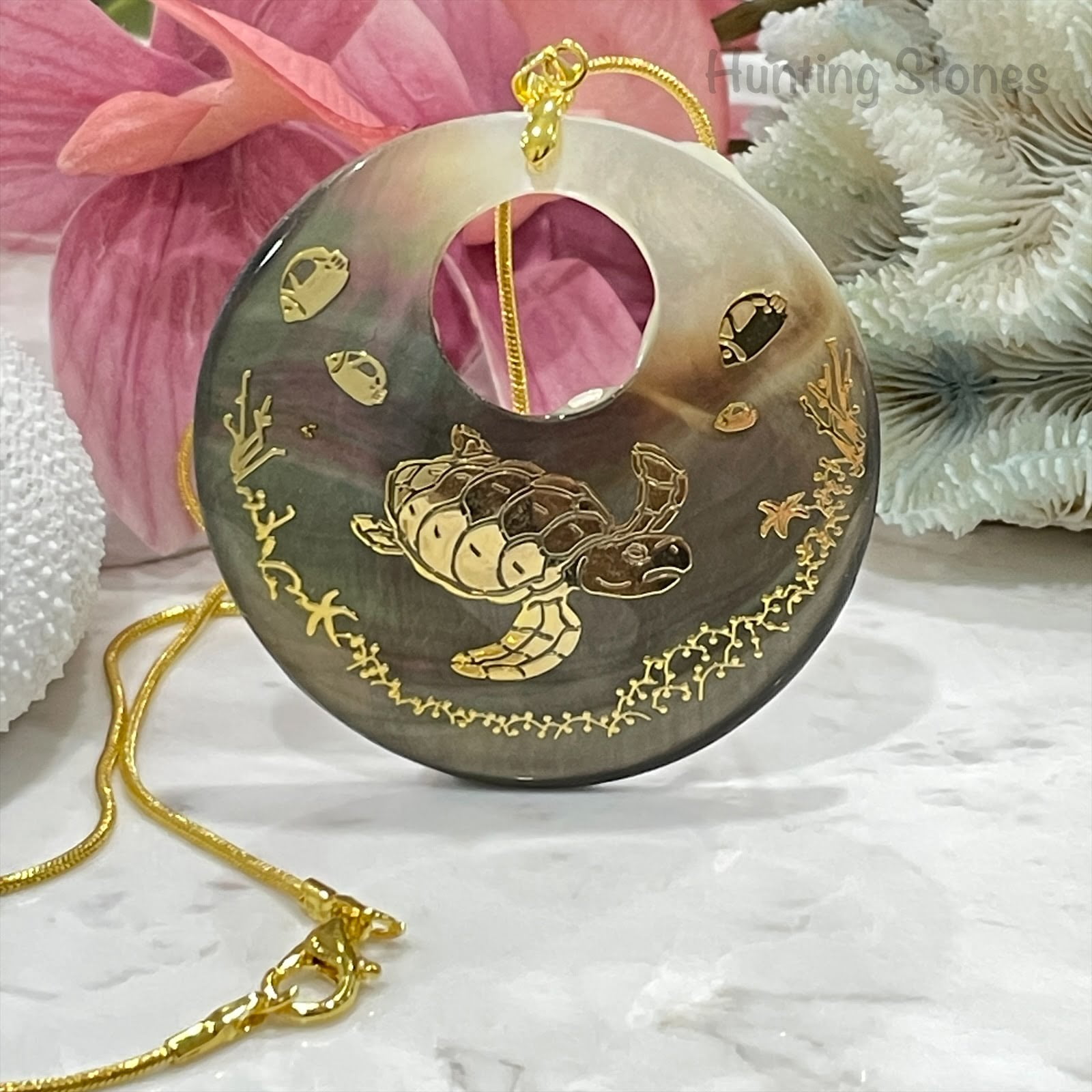 Handmade Natural Abalone Shell Honu Sea Turtle Reef Necklace Gold 50mm