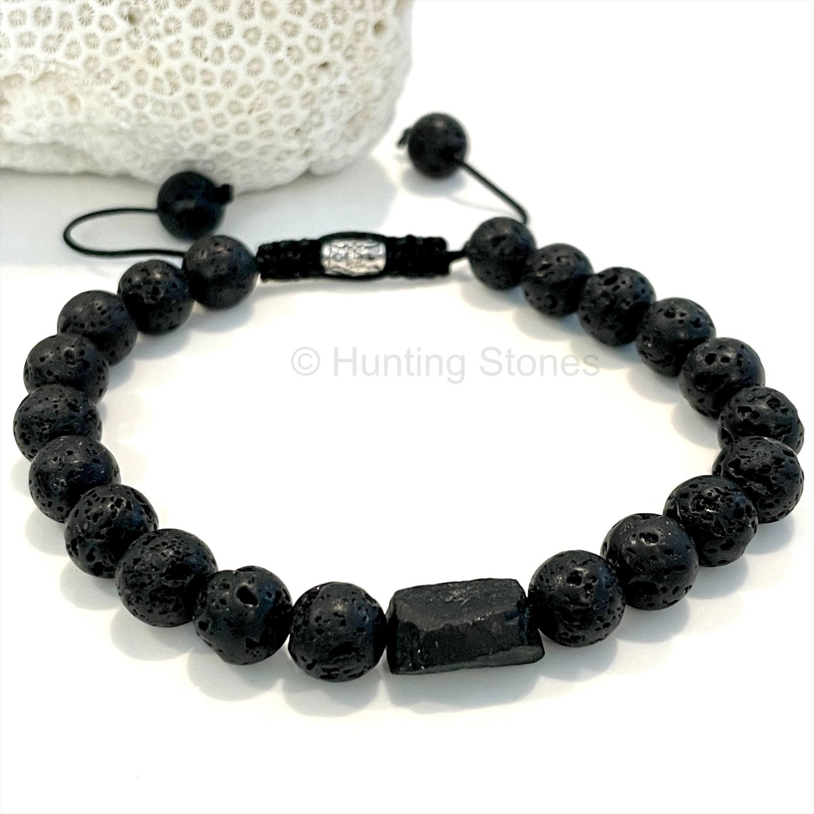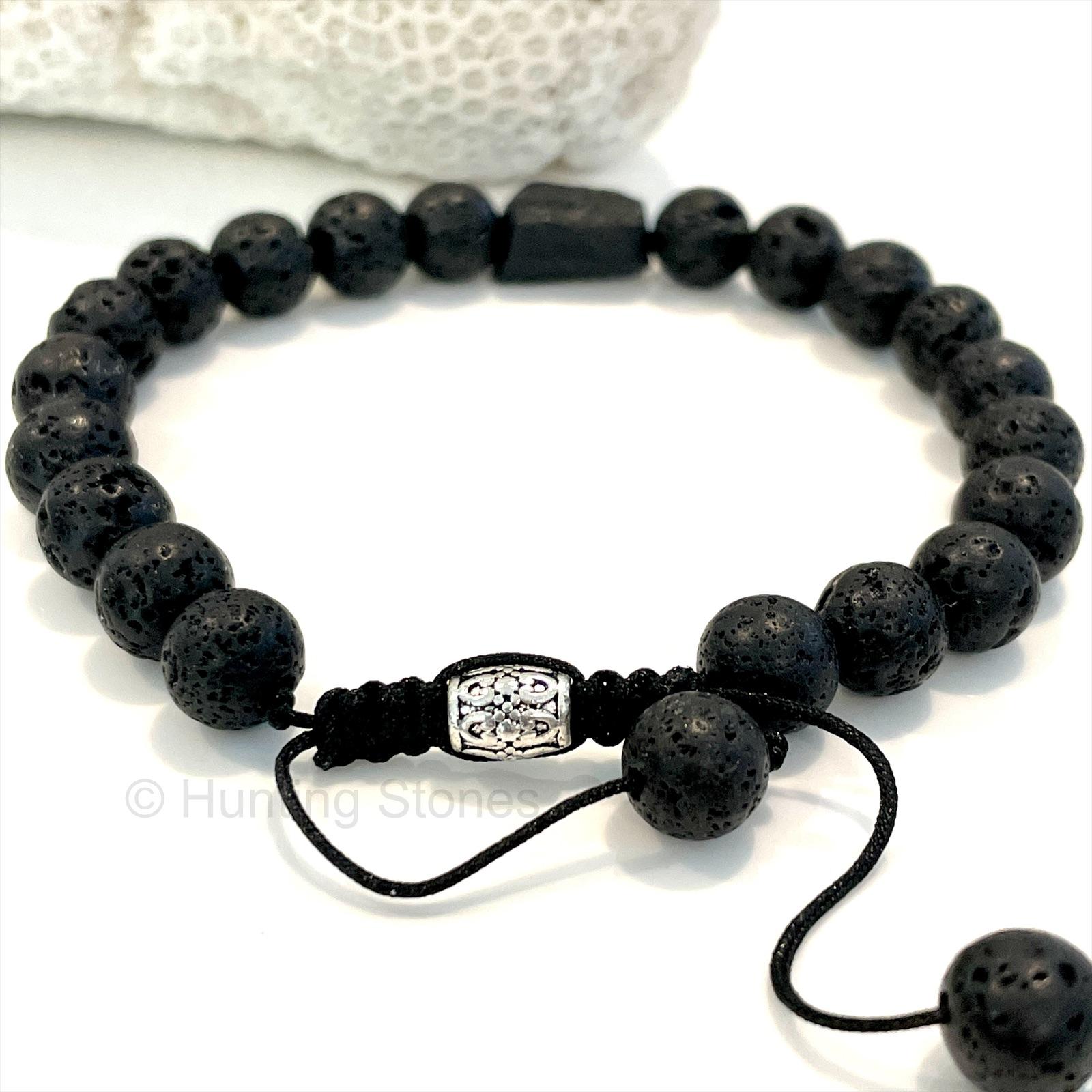 Tourmaline crystal and Lava natural gemstone Unisex bracelet slide adjustable – 16.5 to 24cm – Protection Focus Cleansing