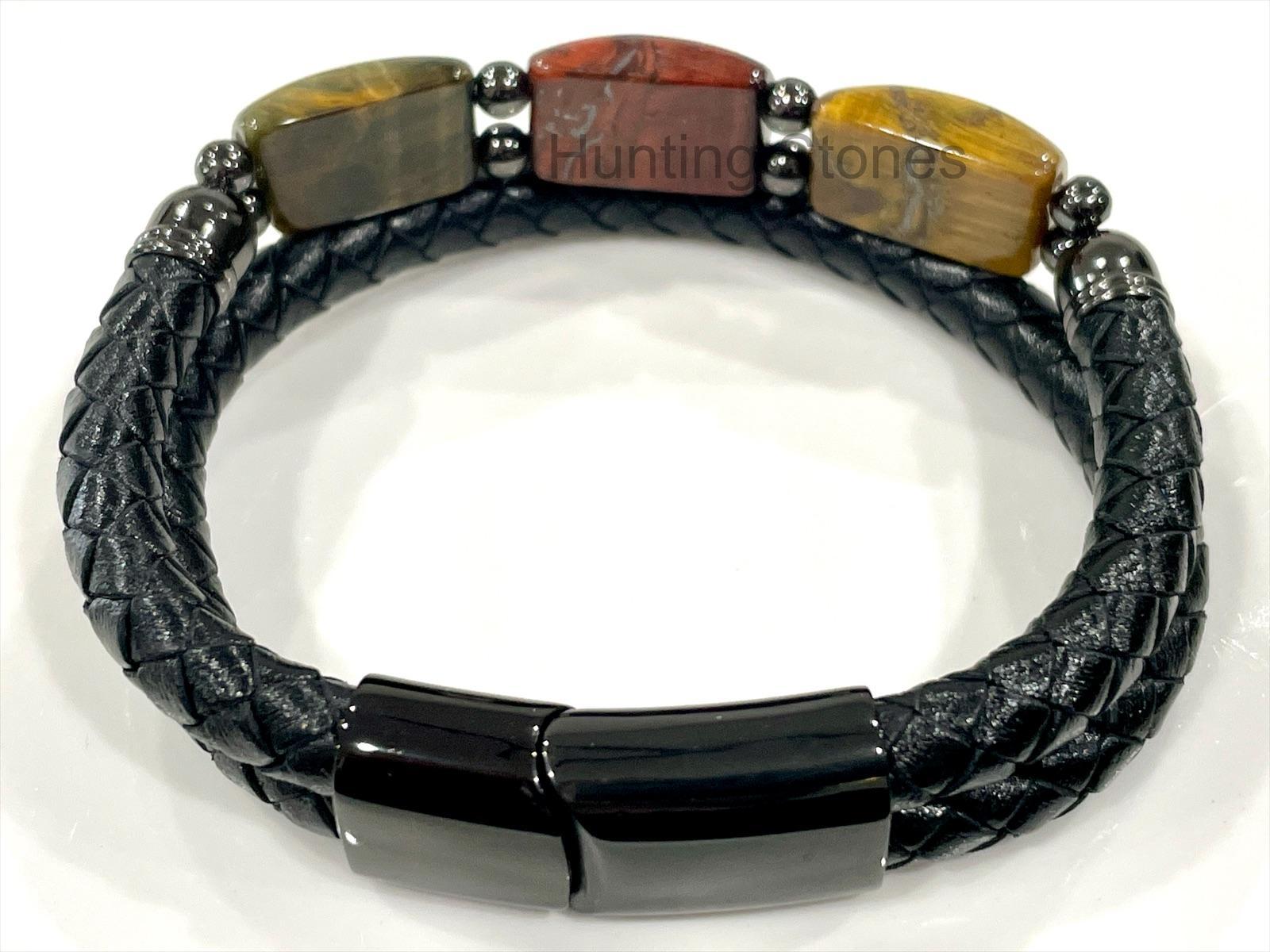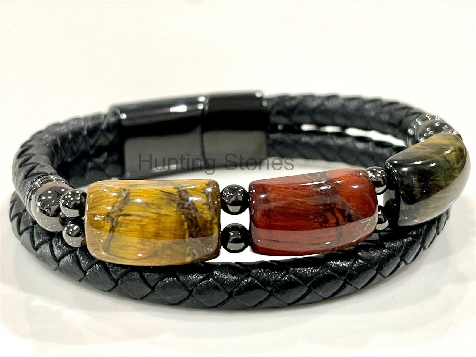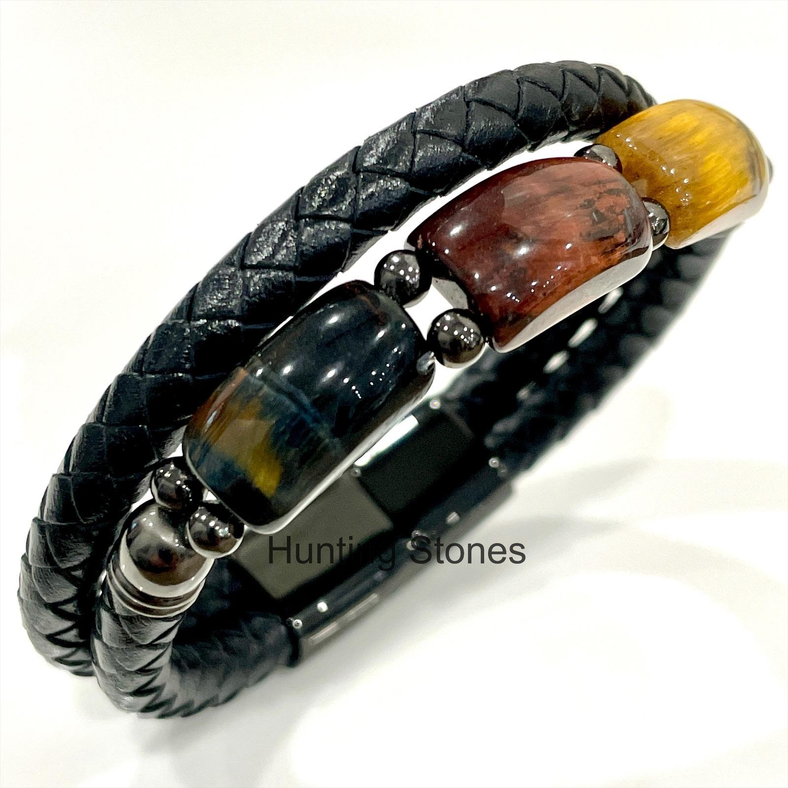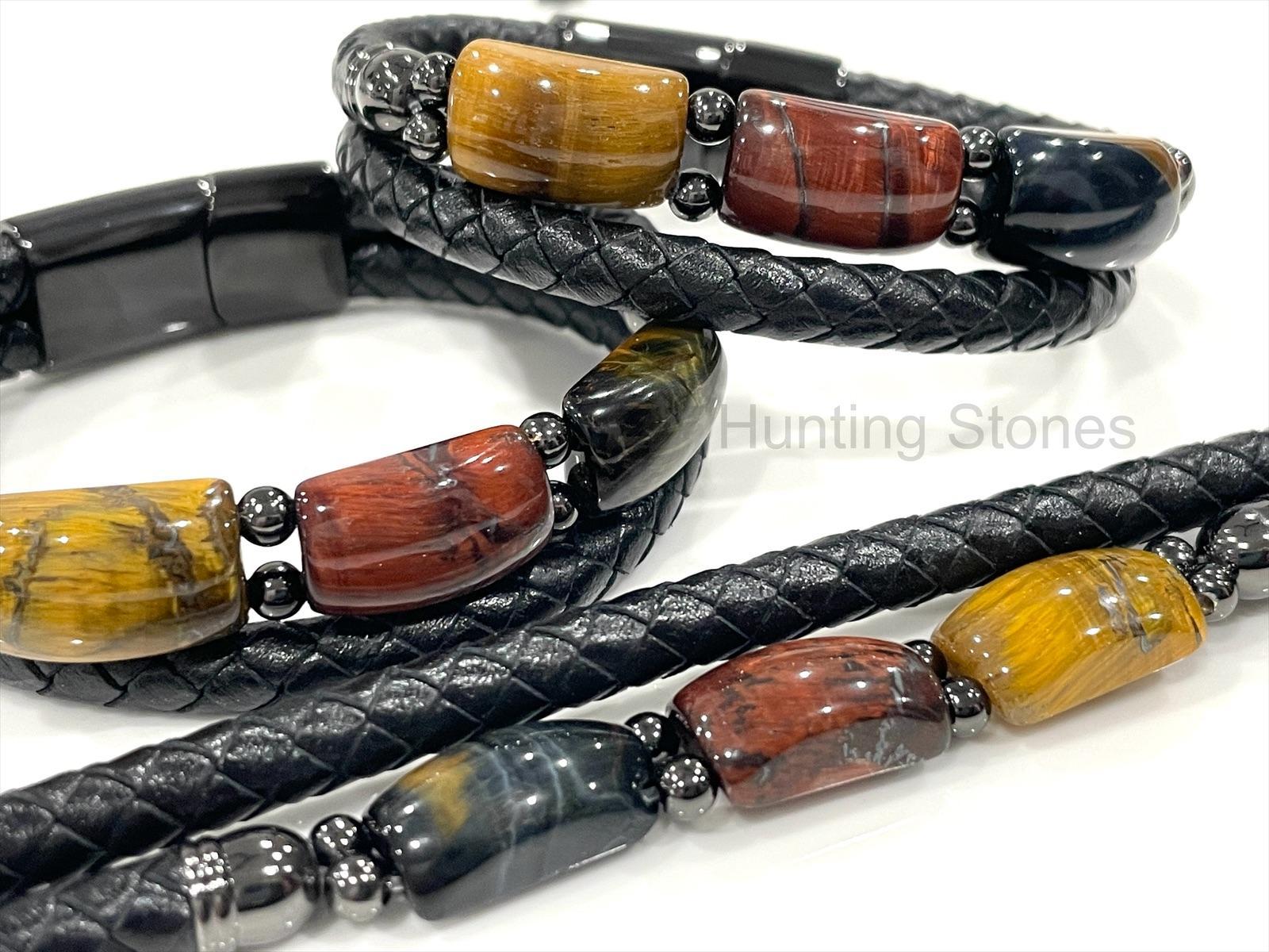 Men’s Mixed Tiger Eye and Braided Genuine Leather Bracelet – 19cm or 21cm Strength Protection Focus Grounding Calming