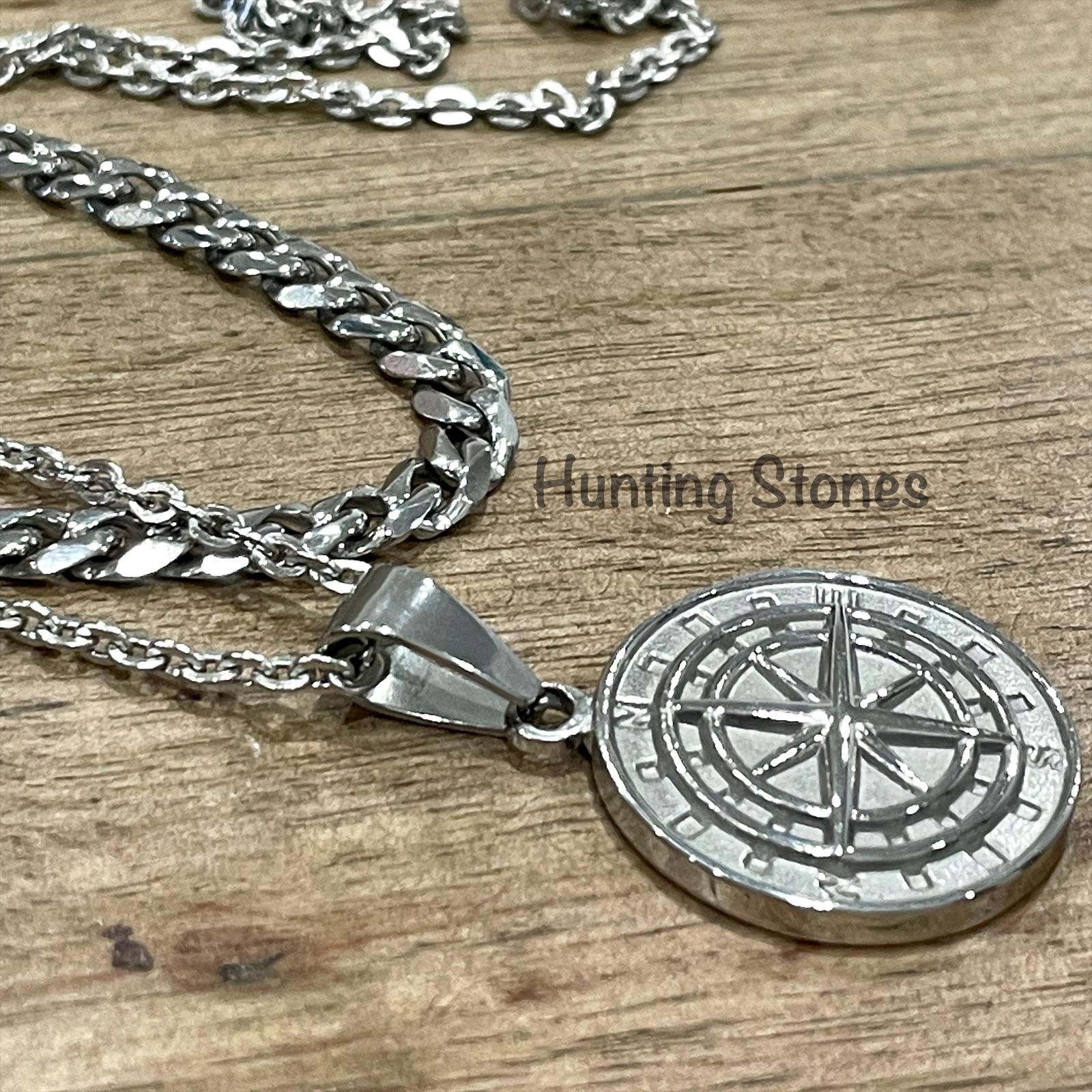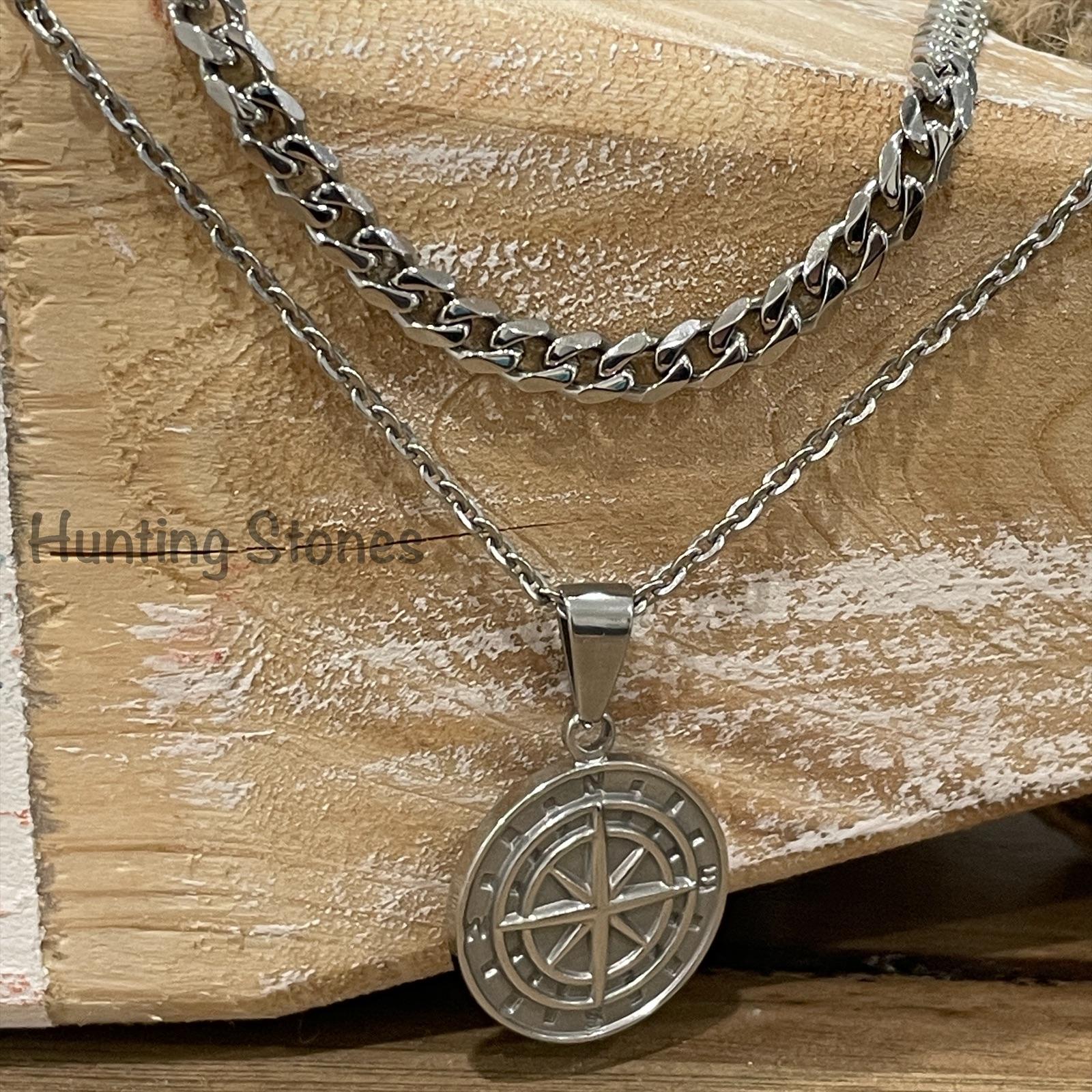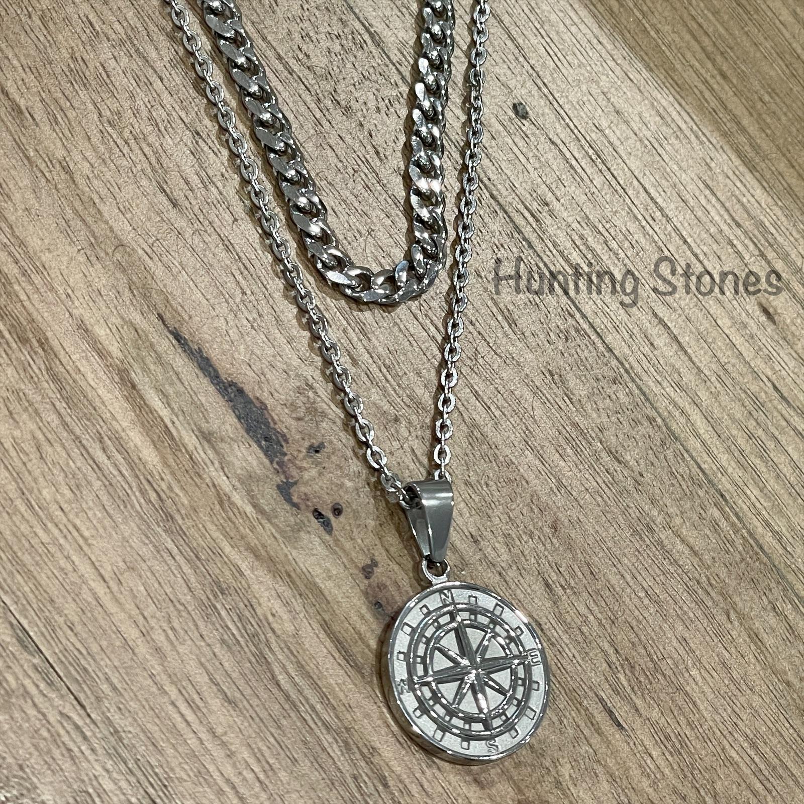 Men’s Quality Stainless Steel Compass Necklace and Cuban Chain Set