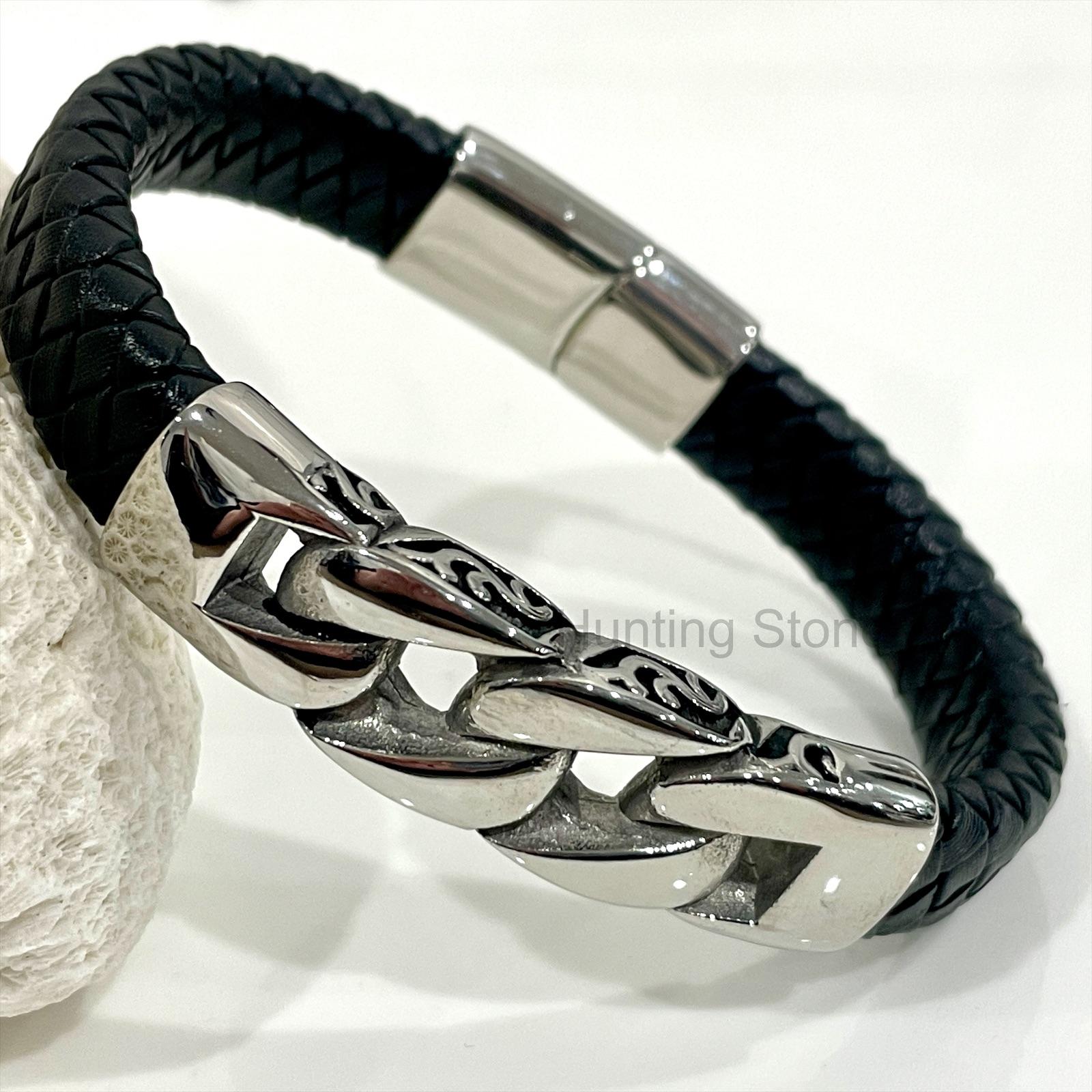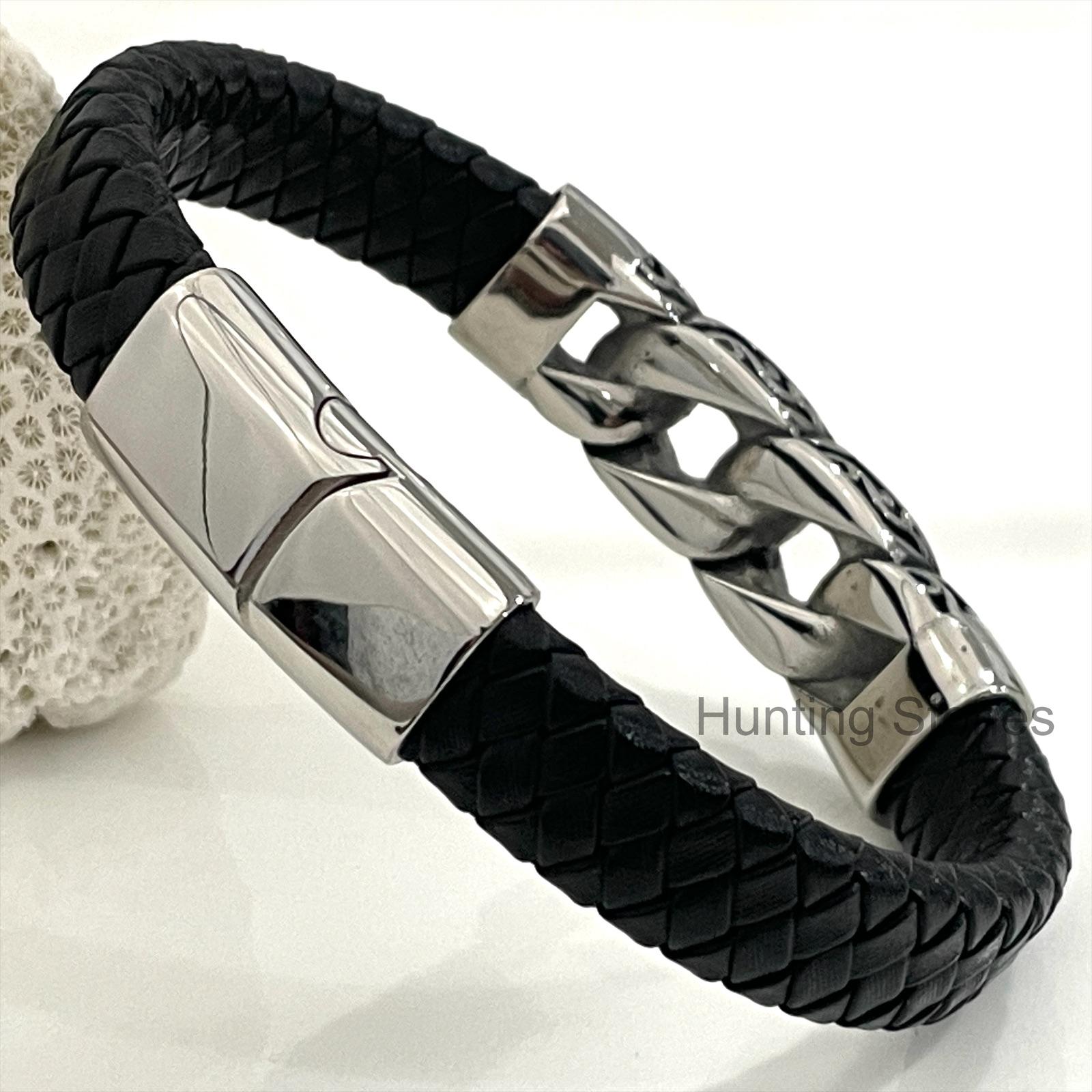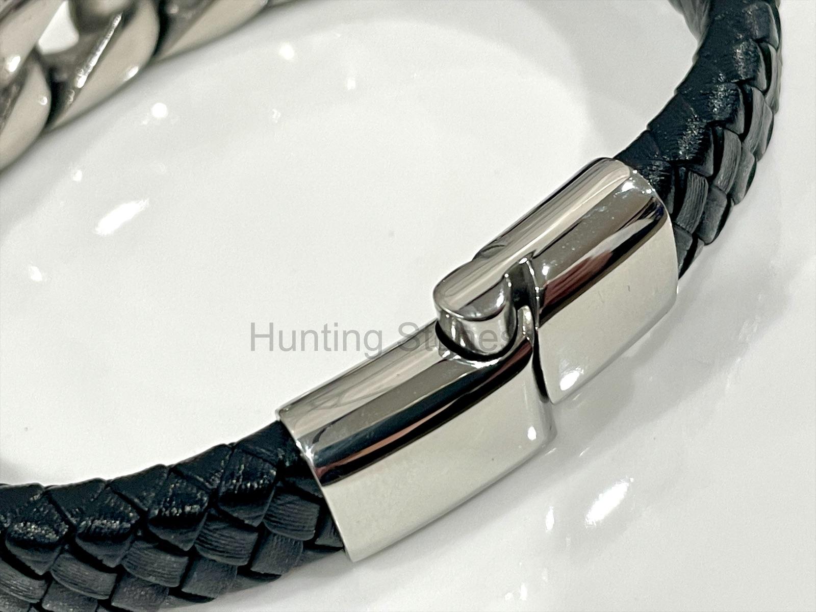 Men’s Stainless Steel and Genuine Leather Braided Bracelet 21.5cm