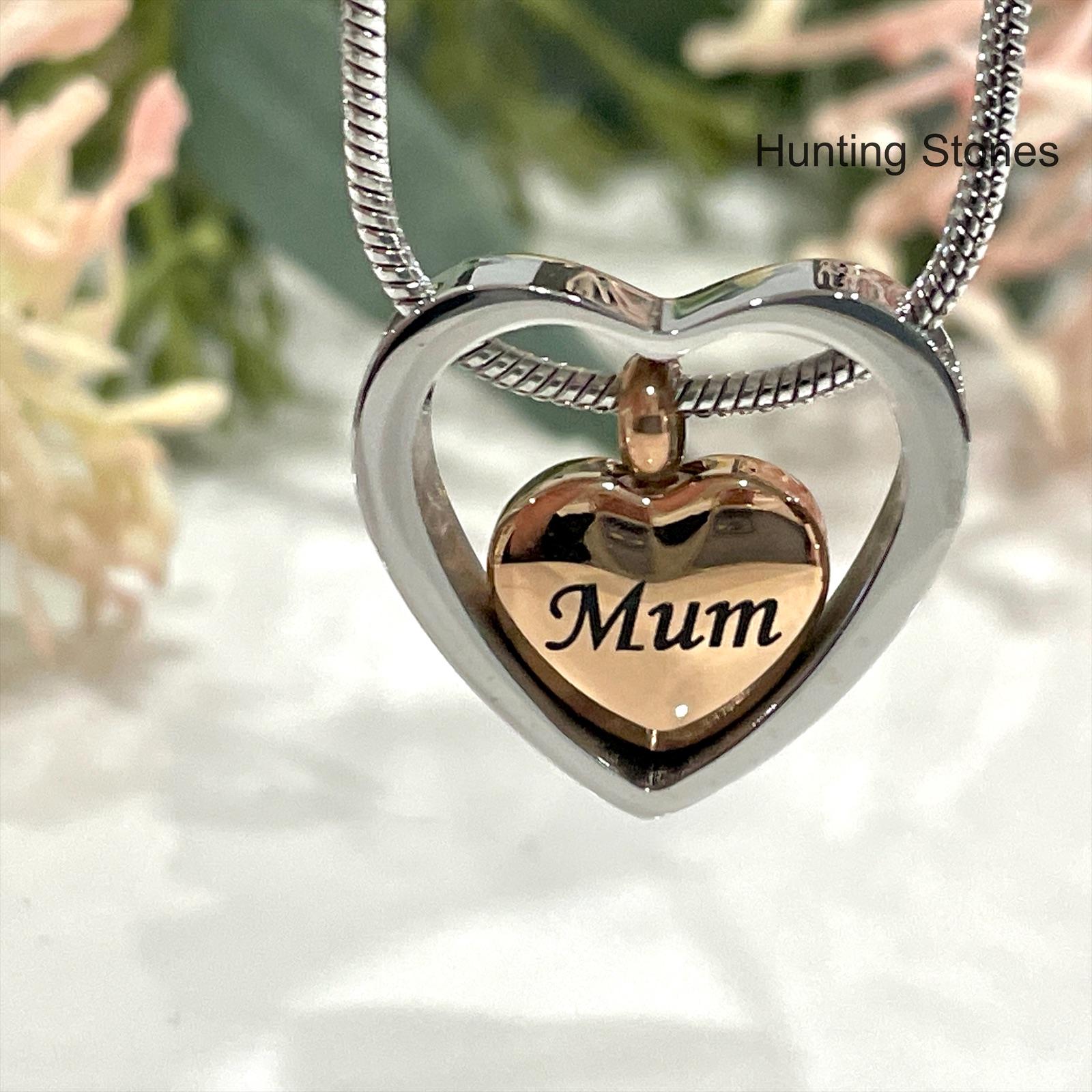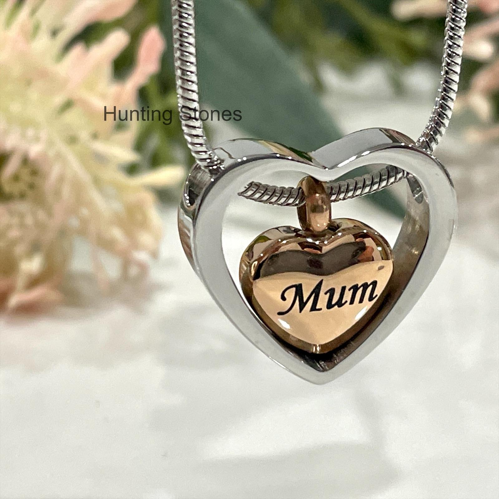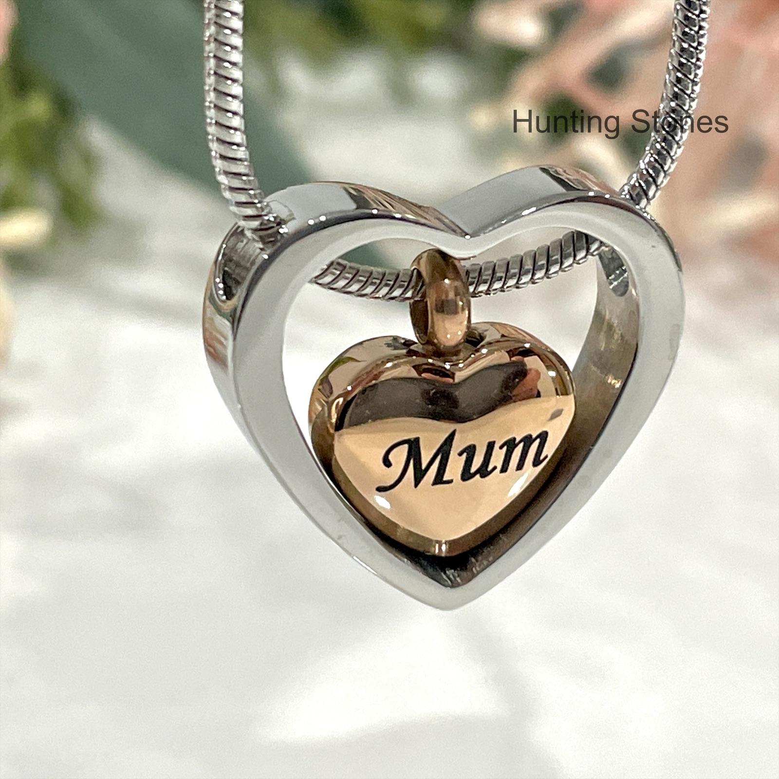 Mum Floating Heart Memorial Cremation Ashes Urn Pendant Necklace – Stainless Steel Rose Gold 20mm
