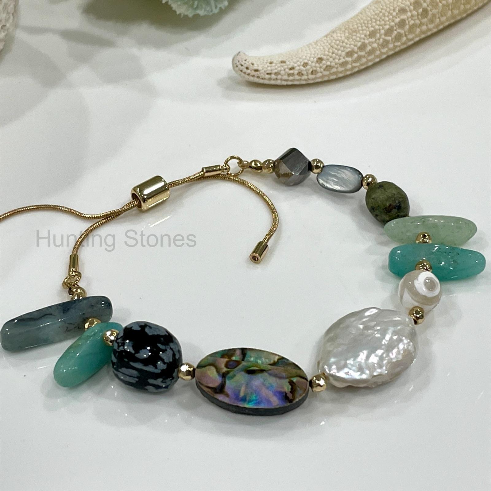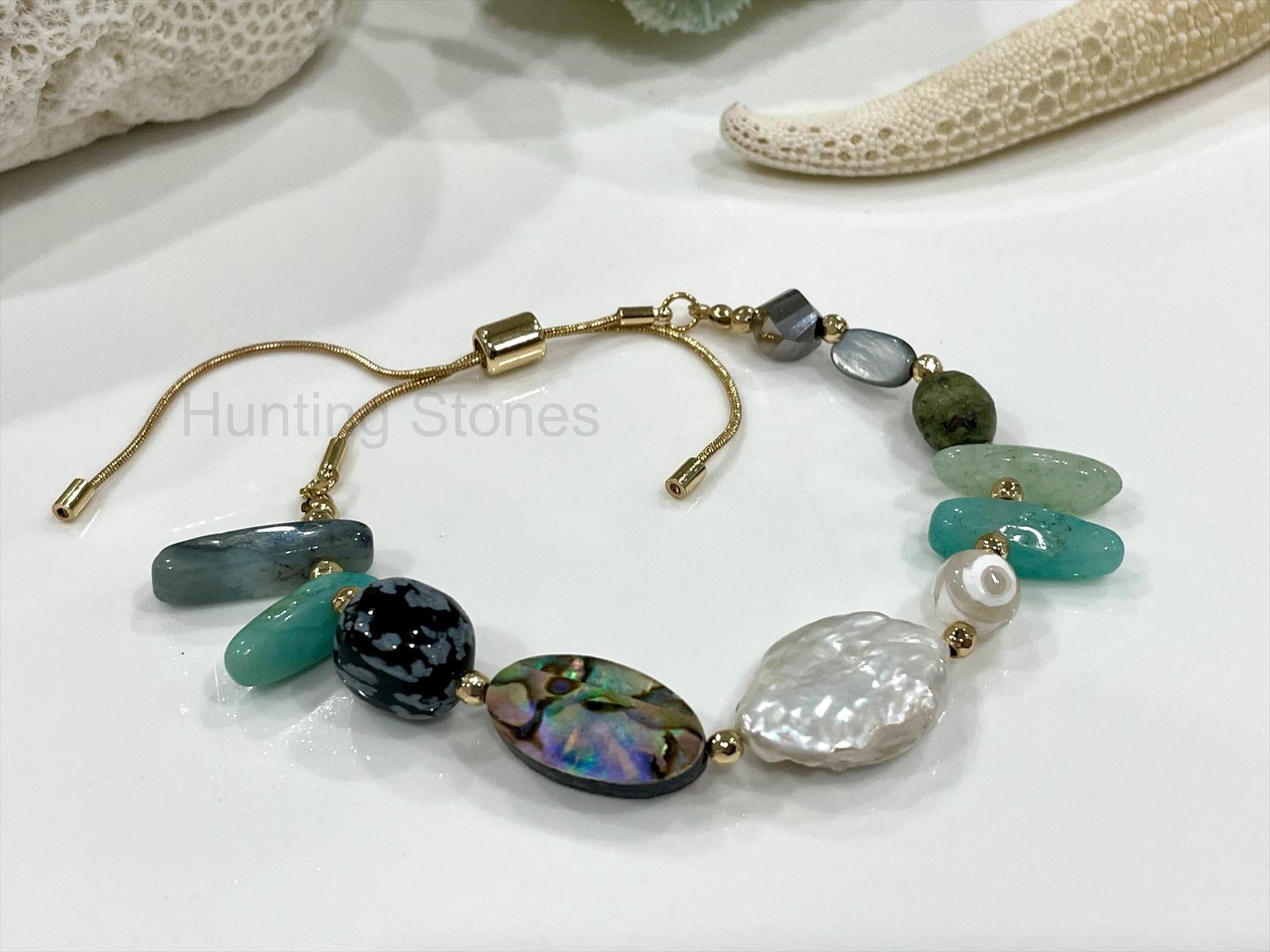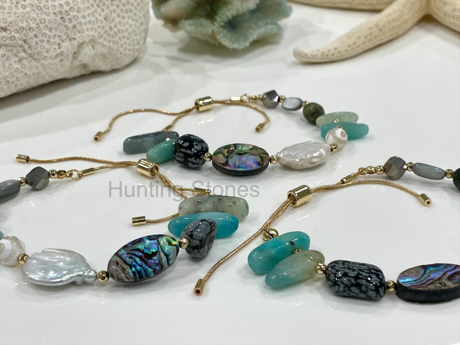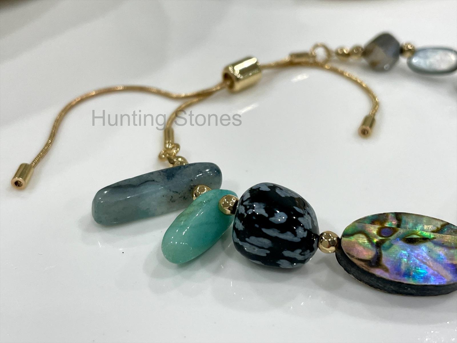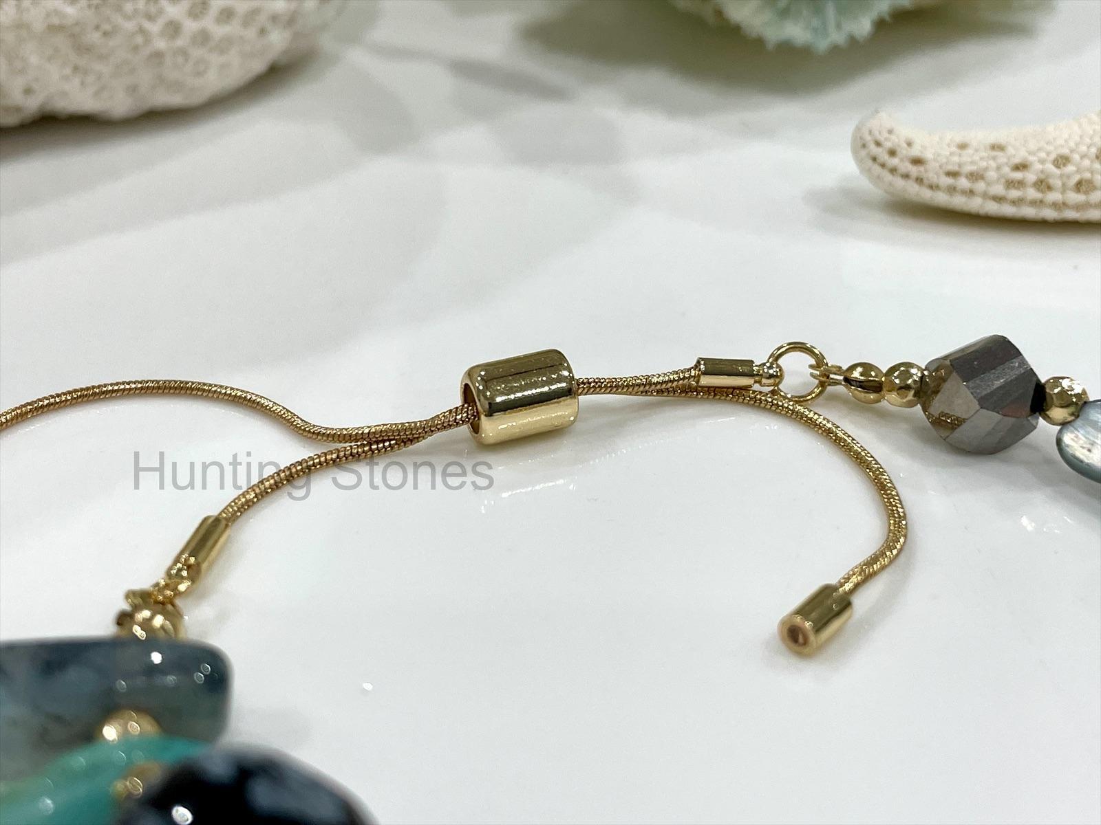Natural Amazonite and Obsidian Gemstone Bracelet – Gold Chain – slide adjustable 16 to 26cm