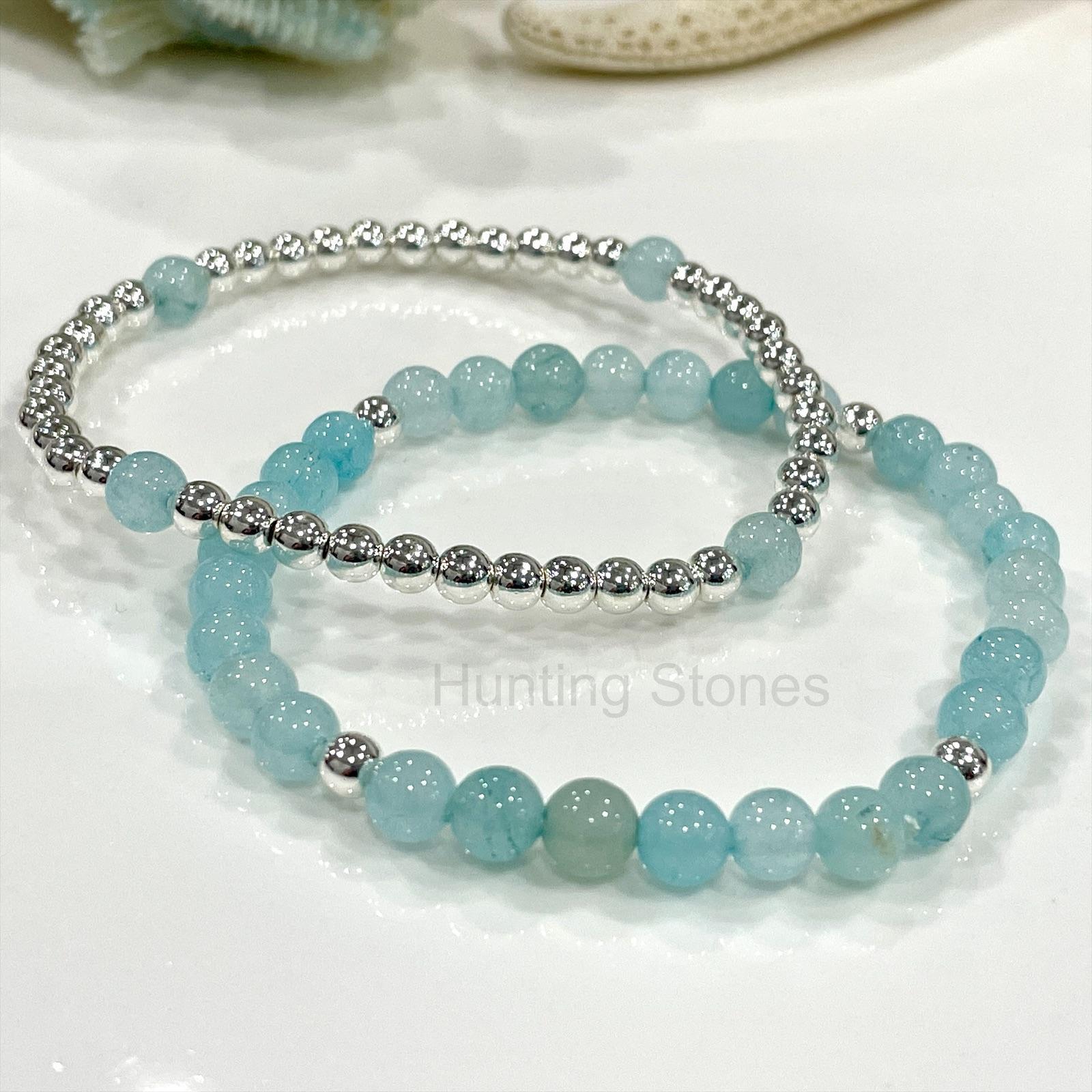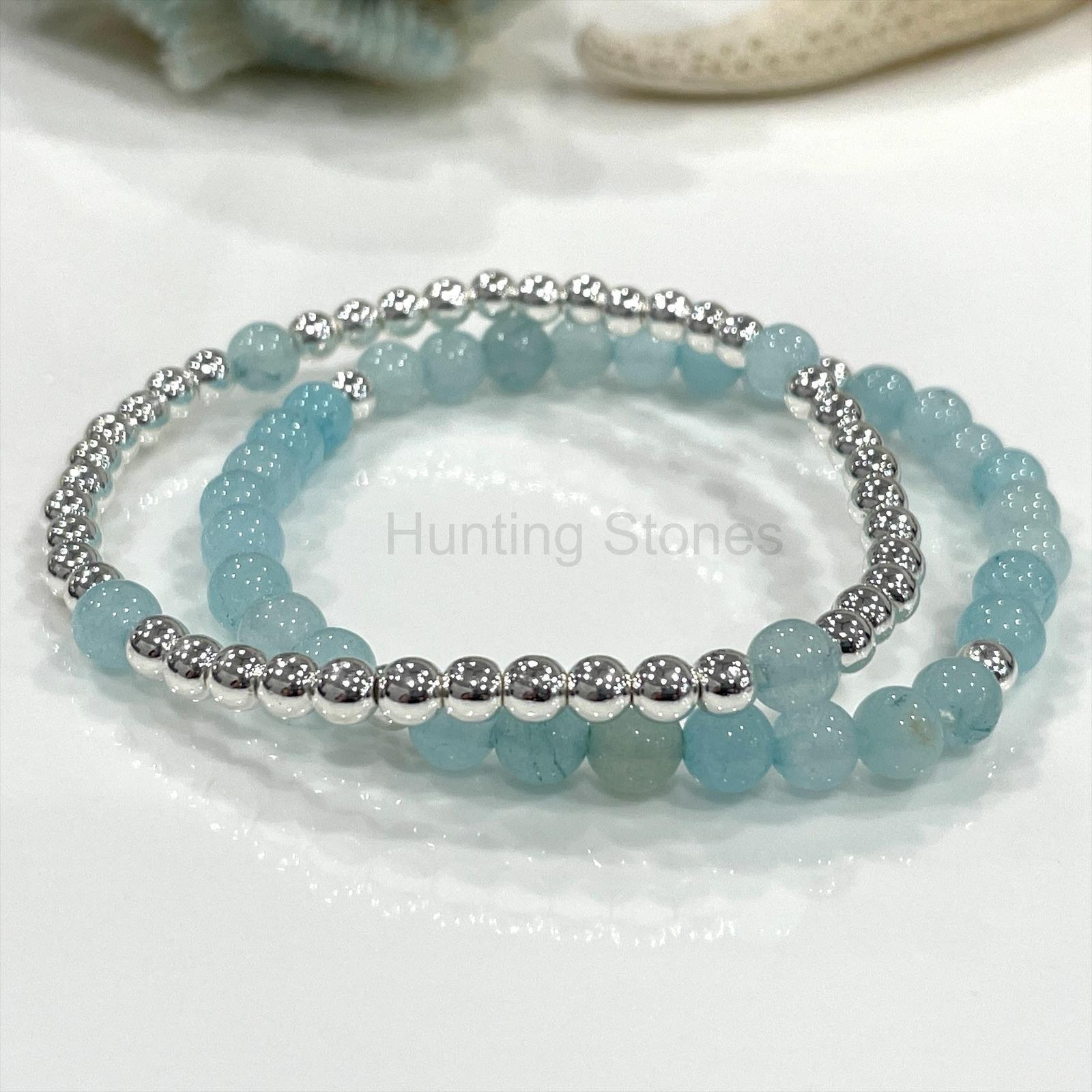 Natural Aquamarine and Silver bracelet set – 17cm stretch 6mm 4mm beads