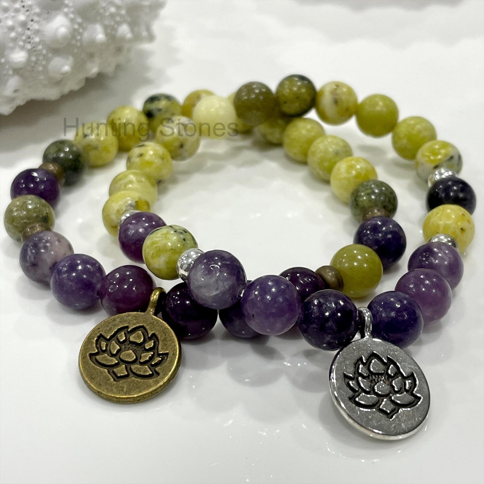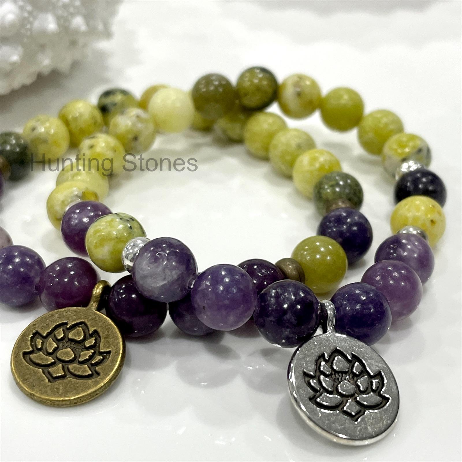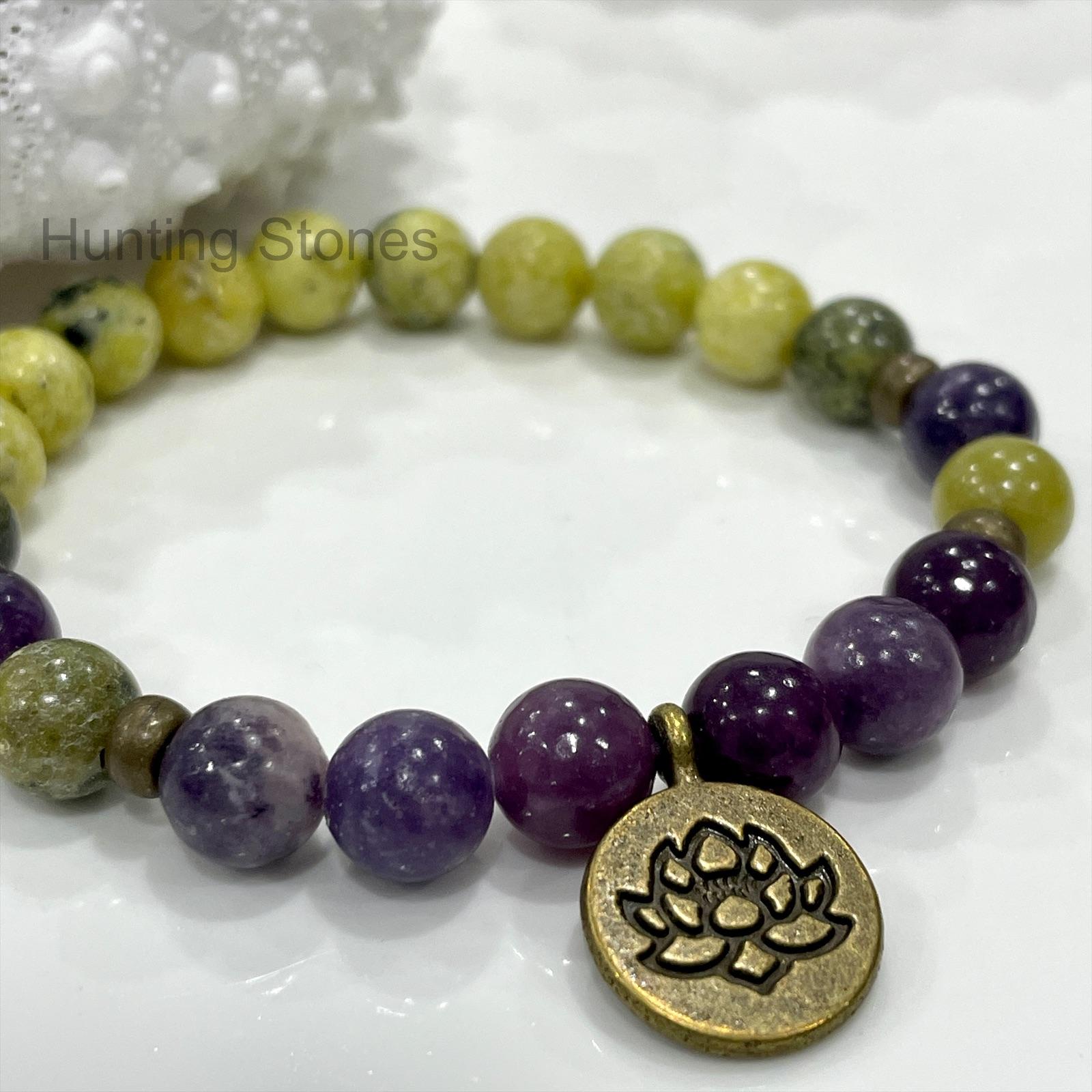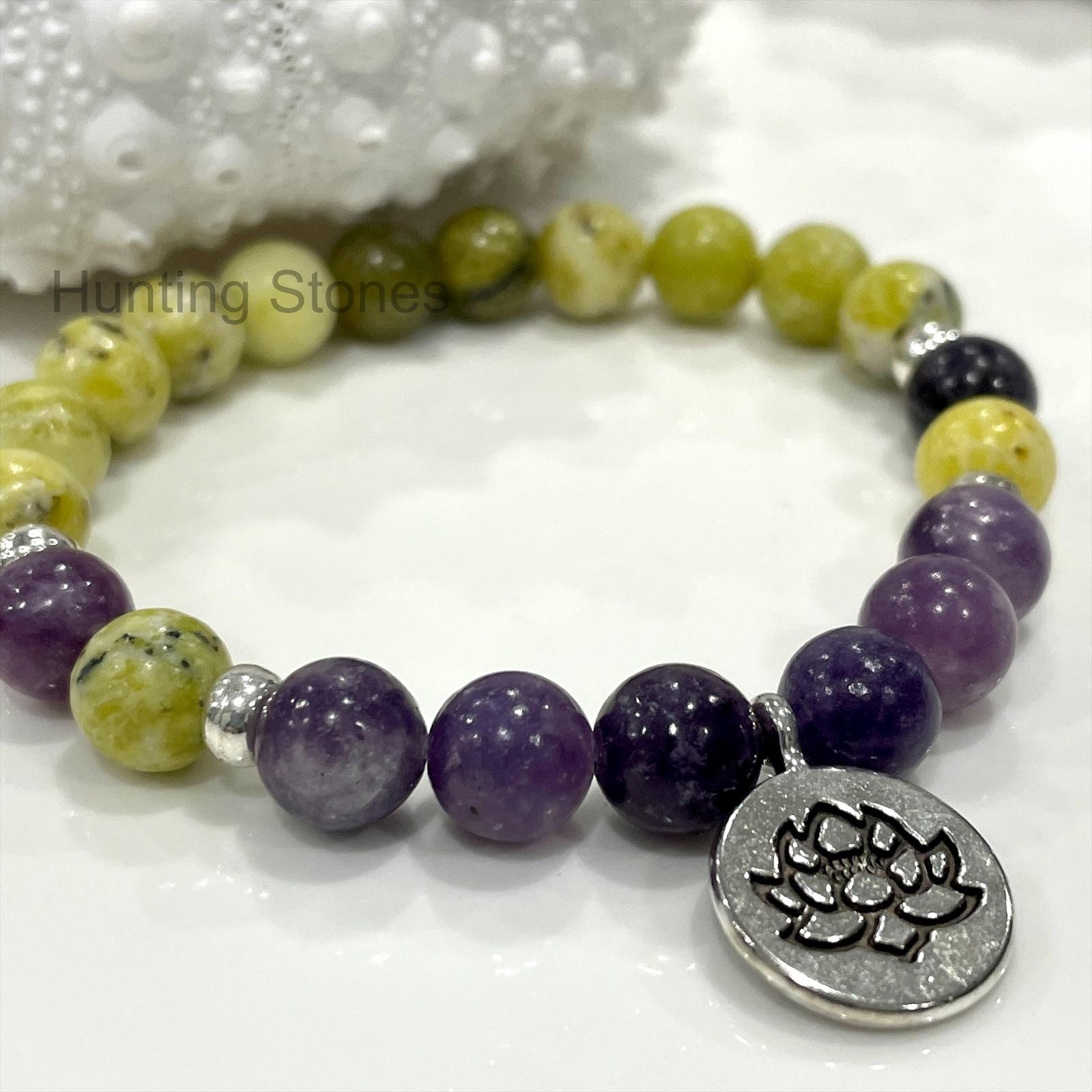Natural Lepidolite and Serpentine Jasper lotus bracelet