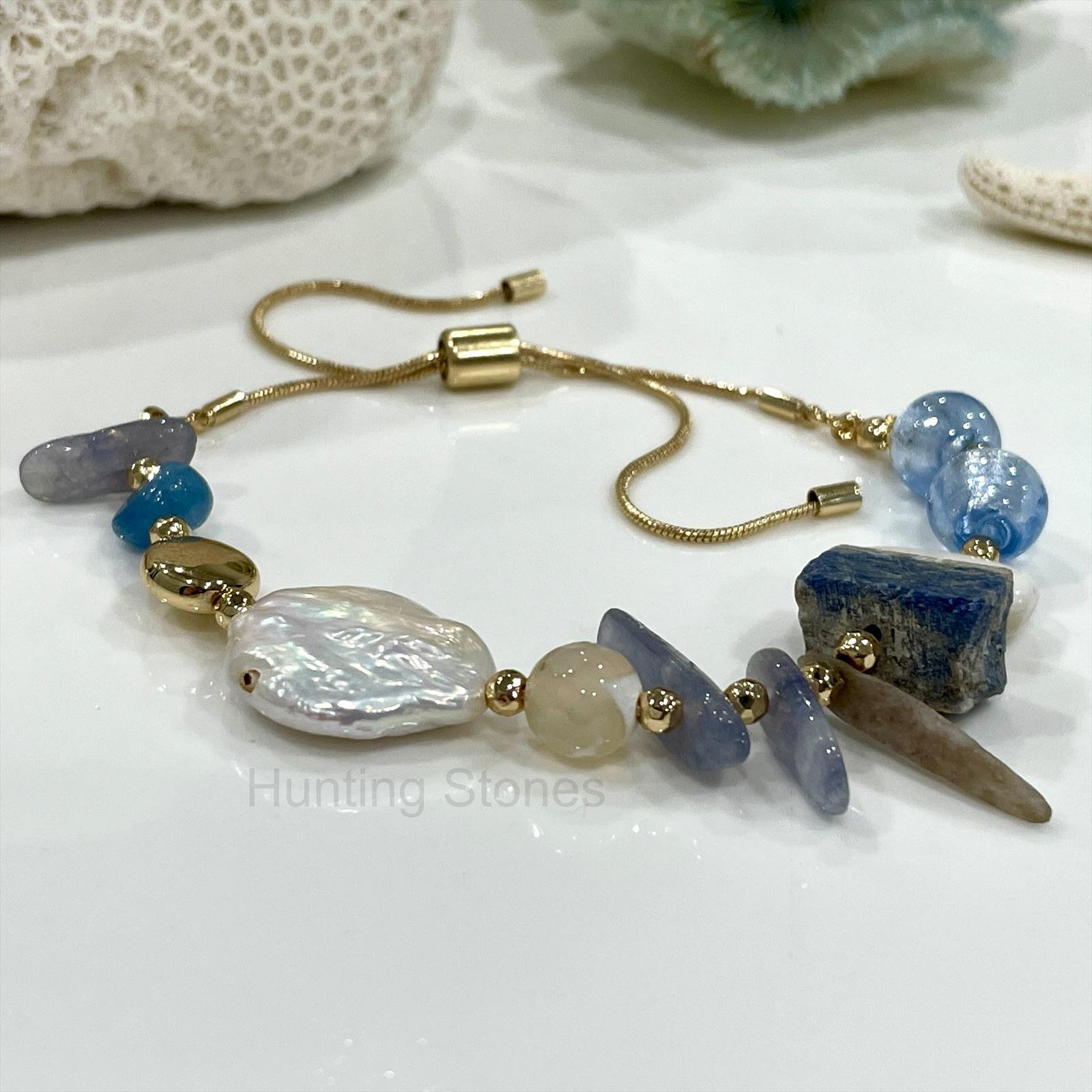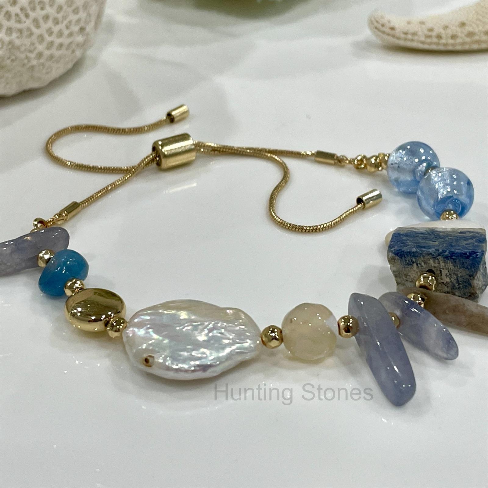 Natural Lapis Lazuli and Aquamarine Gemstone Bracelet – Gold Chain – slide adjustable 16 to 26cm