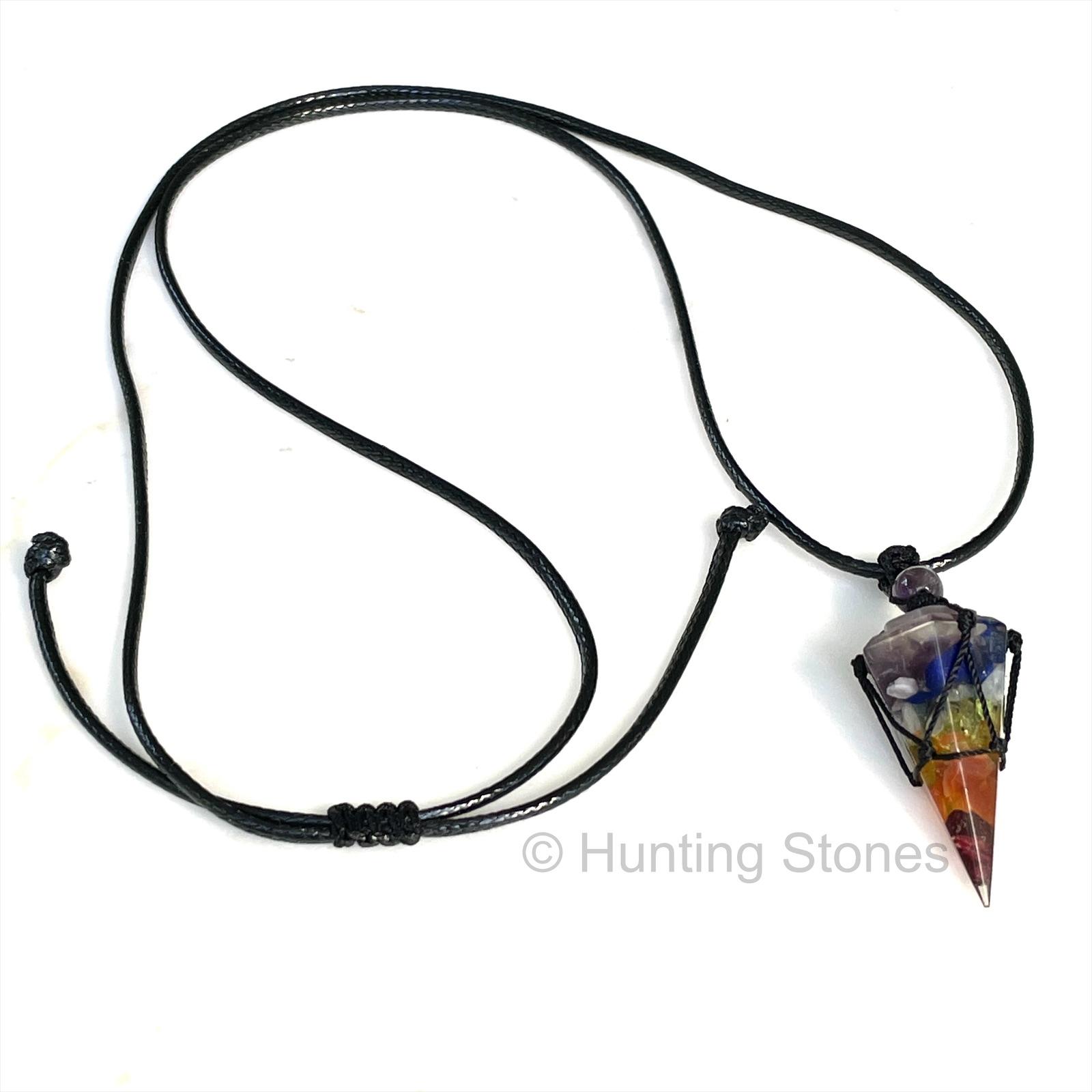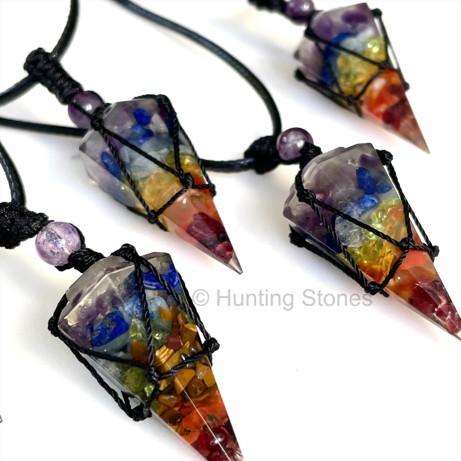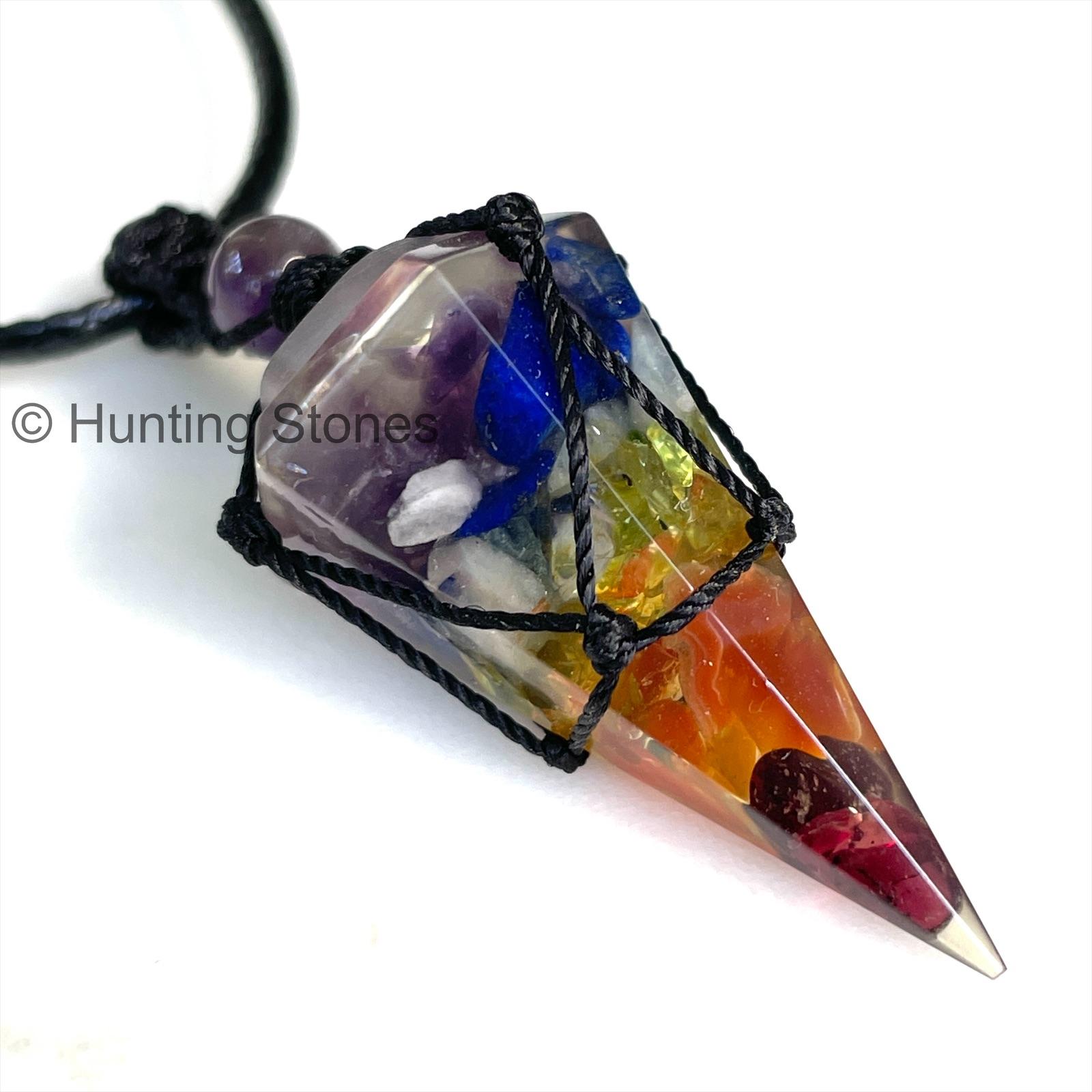 - Pendant: has a mix of mainly Amethyst, Citrine, Lapis Lazuli, Dragon Bloodstone, Tigers Eye, Aquamarine and may have at times Indian Agate, Green Aventurine or Rose Quartz. Each one is unique and stones can be mixed/stacked in various ways. The gemstone pieces are set in clear resin.