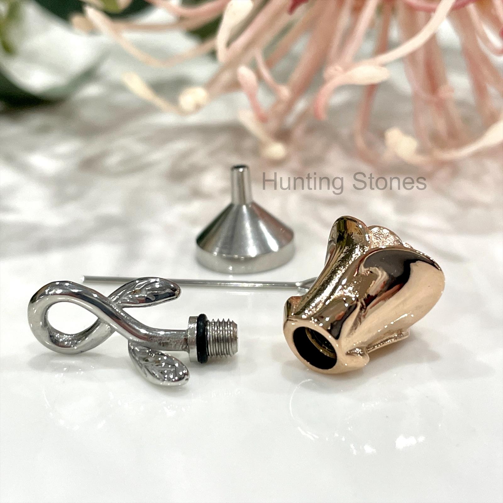 Beautiful polished stainless steel rose pendant. The flower bud is designed to hold a small amount of cremation ashes of a loved one, or you can place a small lock of hair. It can also be used to hold crushed flower petals or carry with you a small amount of soil or sand or petals from a memorable location.