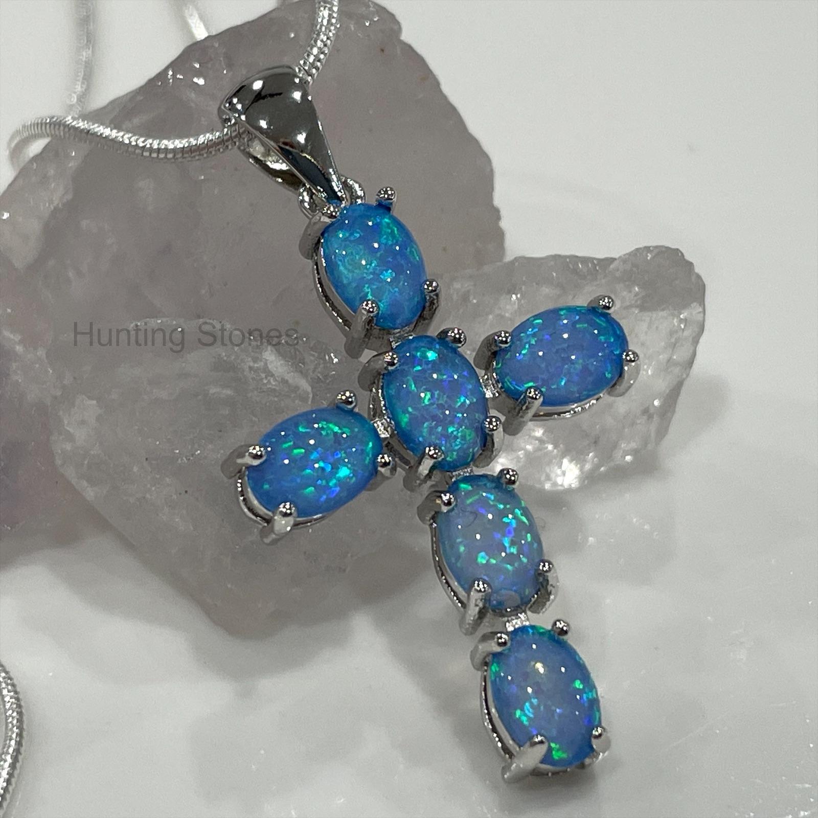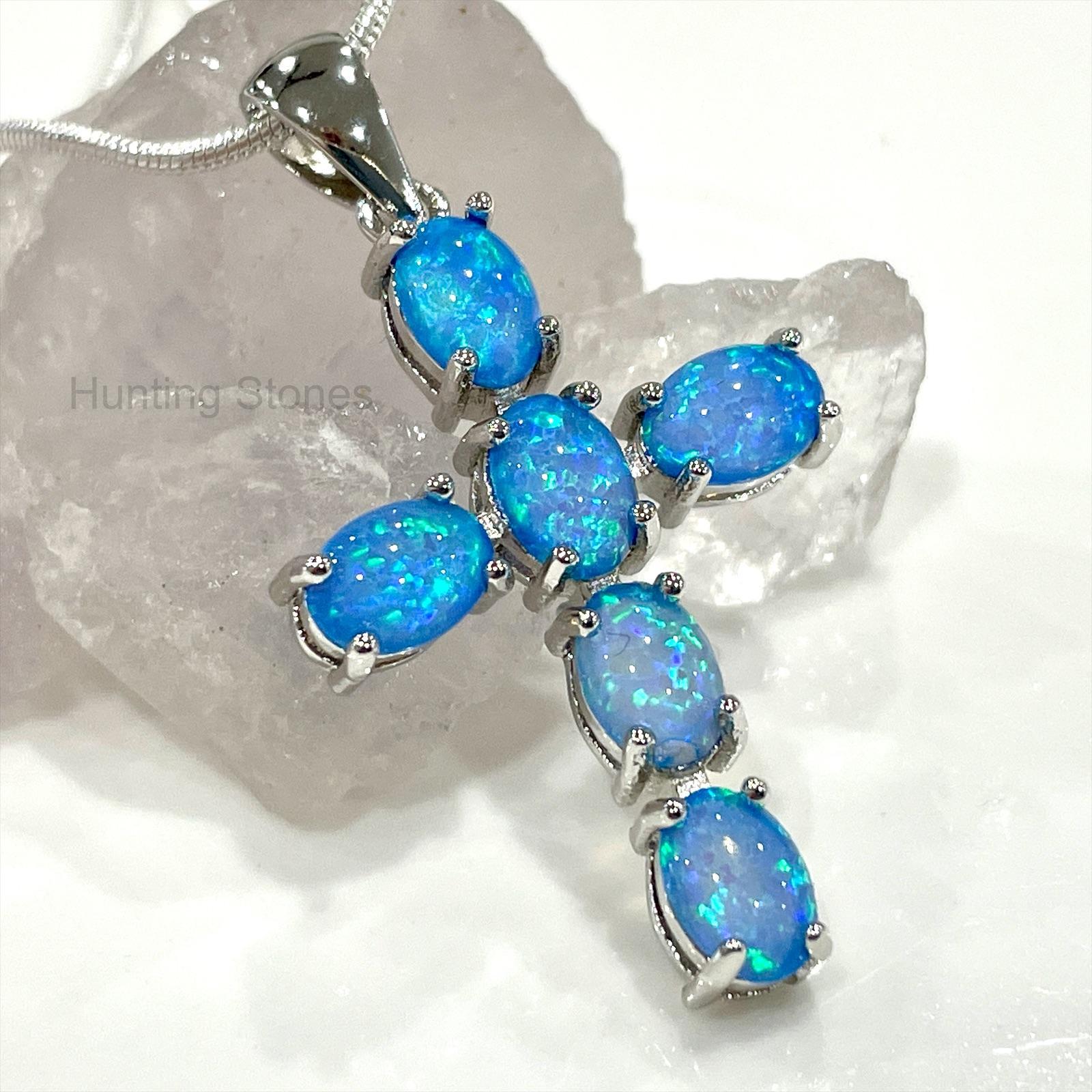 Stunning Blue Fire Opal Cross Necklace – Silver inlay 29mm