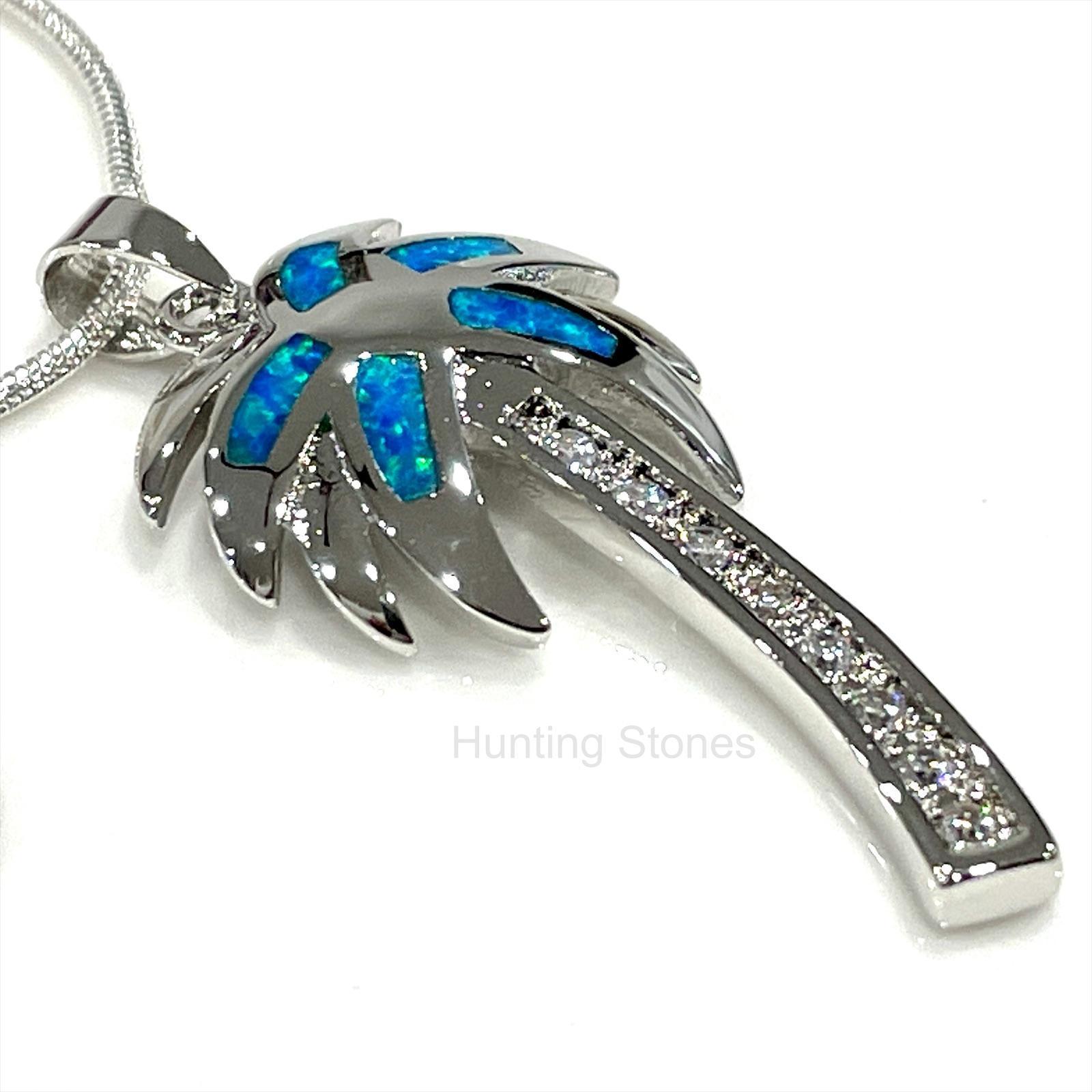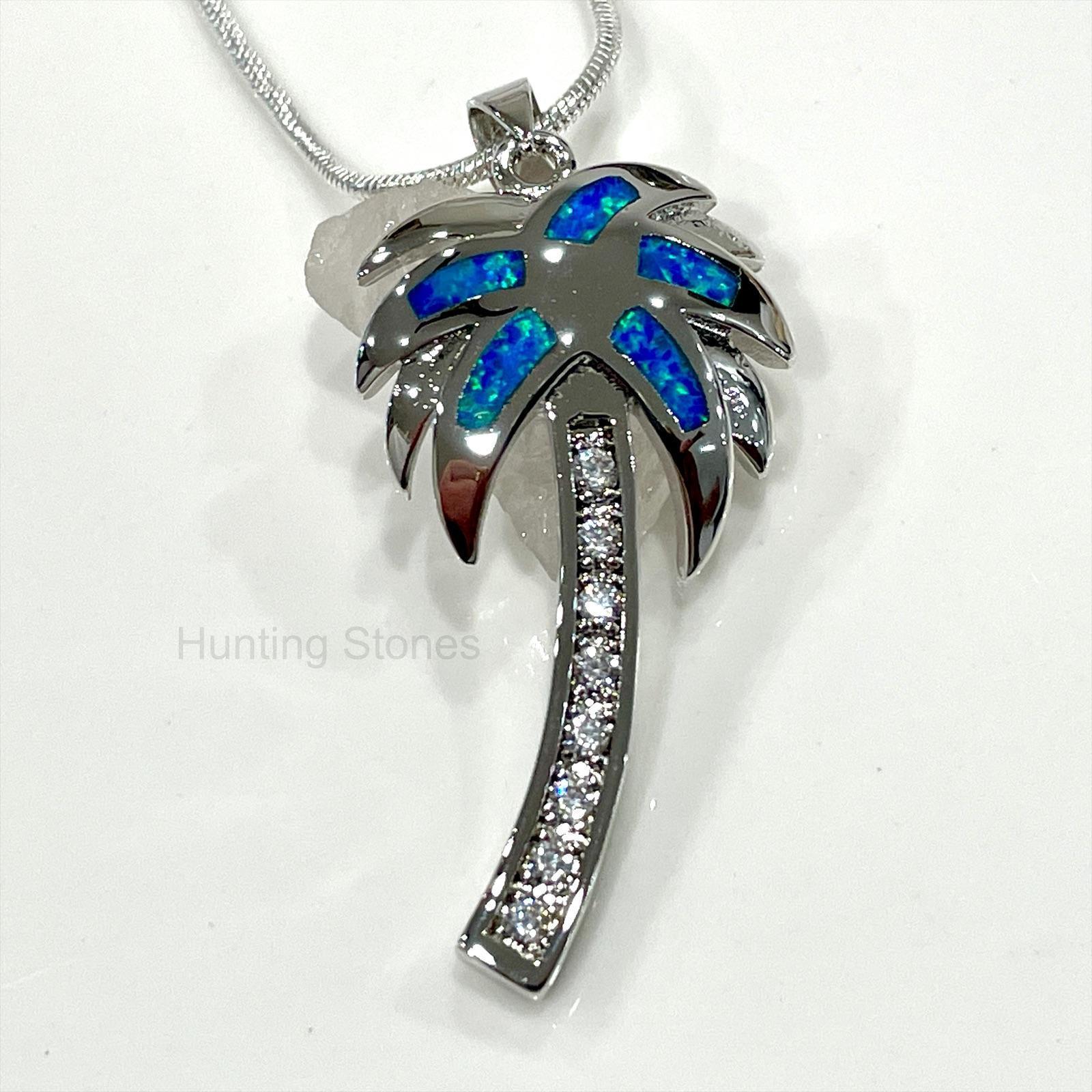 Stunning Blue Fire Opal Palm Tree with Crystals Necklace – Silver inlay 32 mm