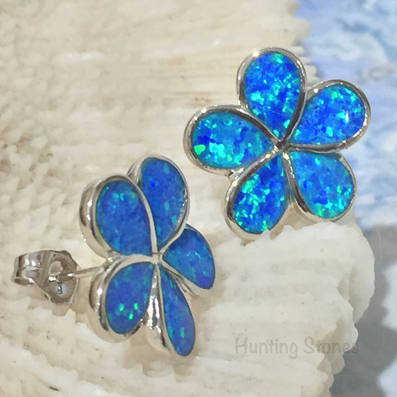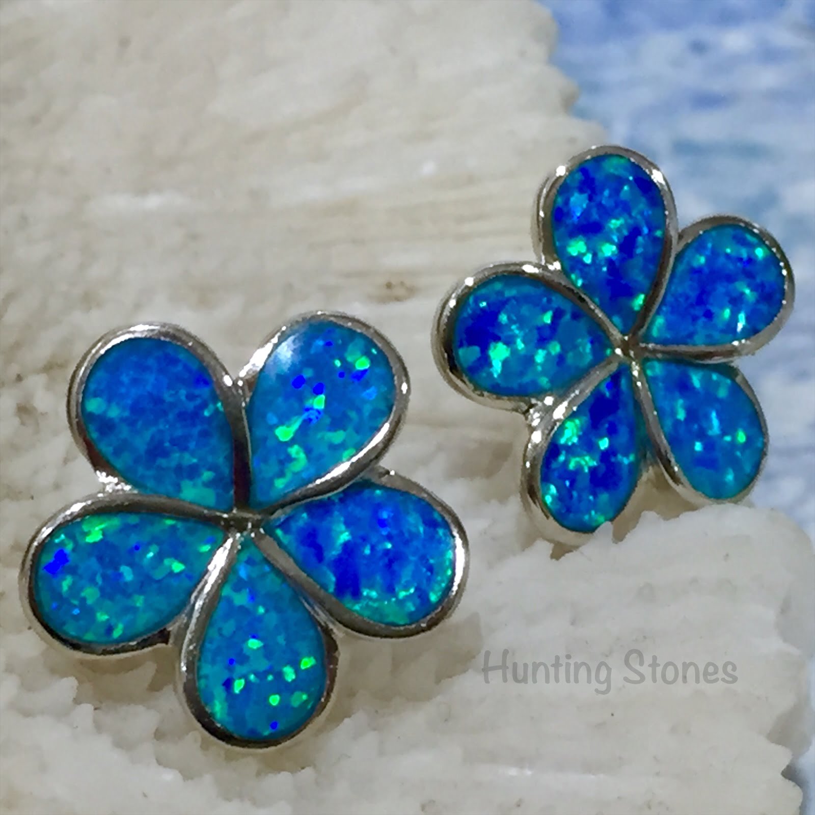 Stunning Fire Opal Flower Earrings Silver inlay 17mm Blue