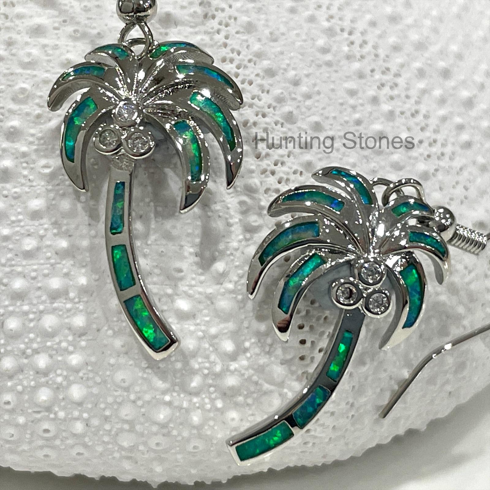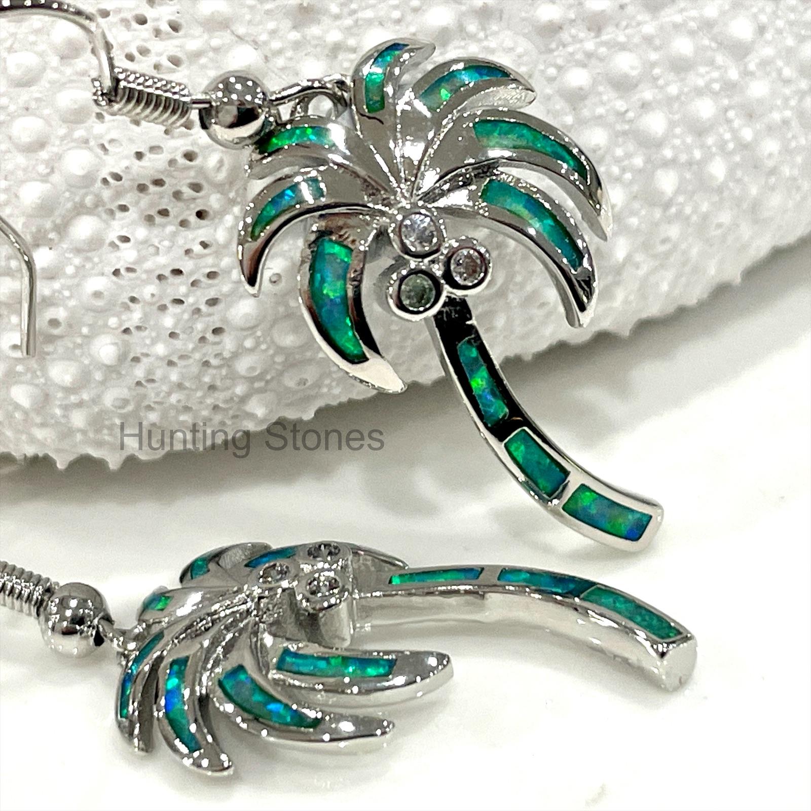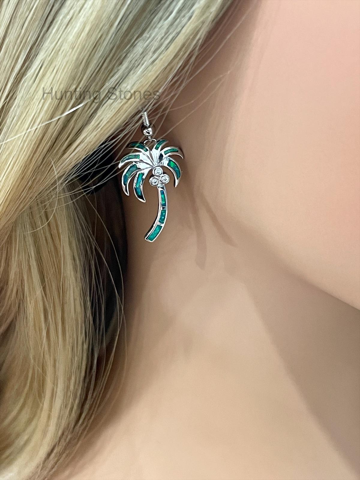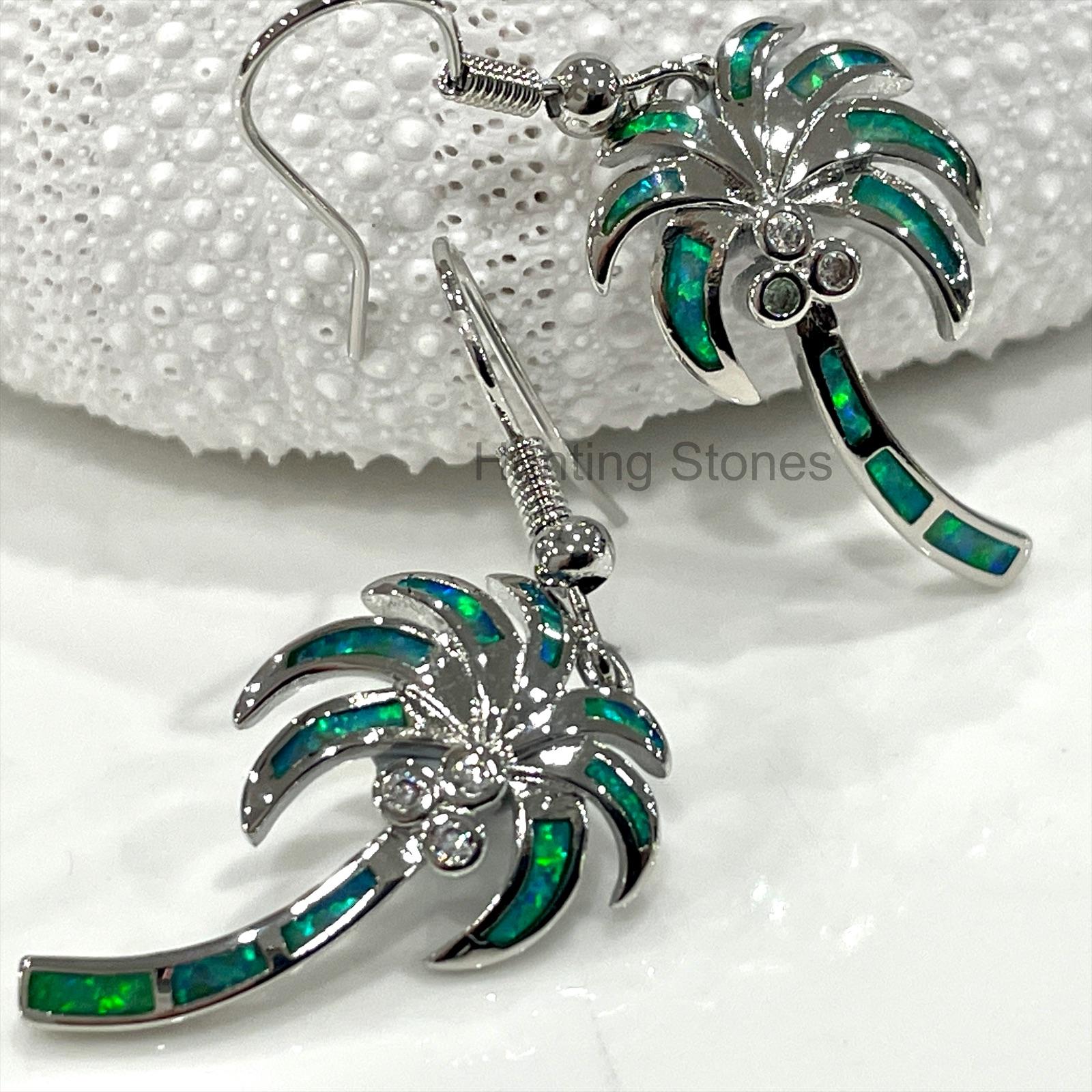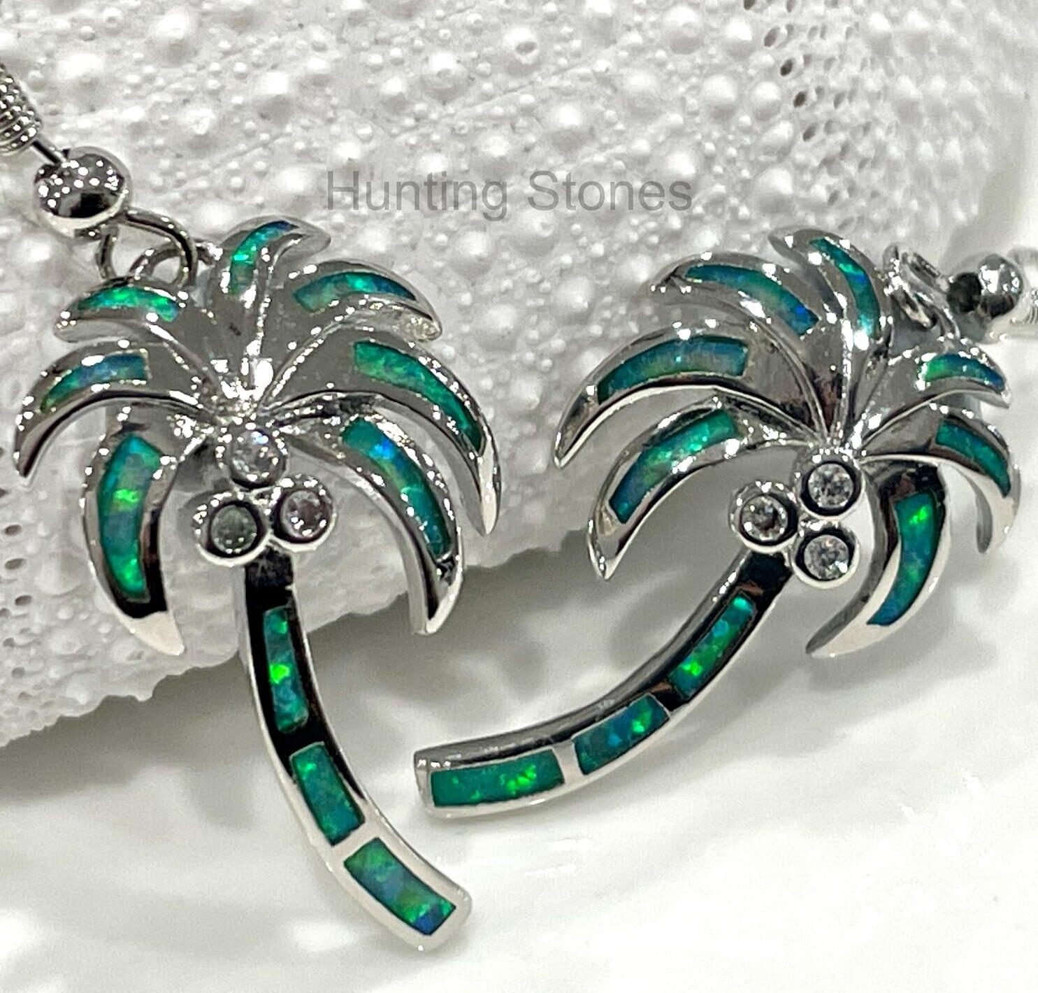 Stunning Green Fire Opal Palm Tree Crystal Earrings Silver inlay 24mm
