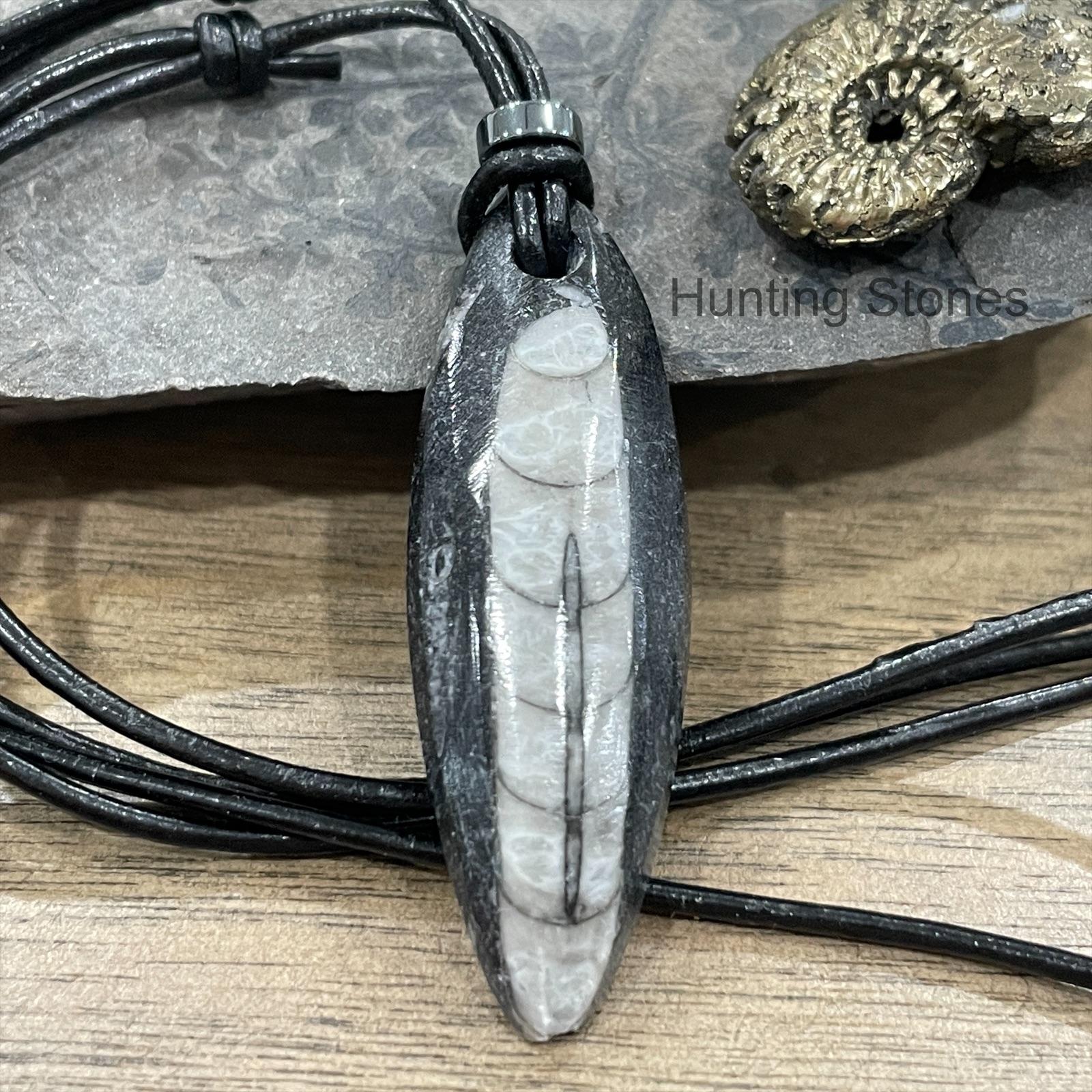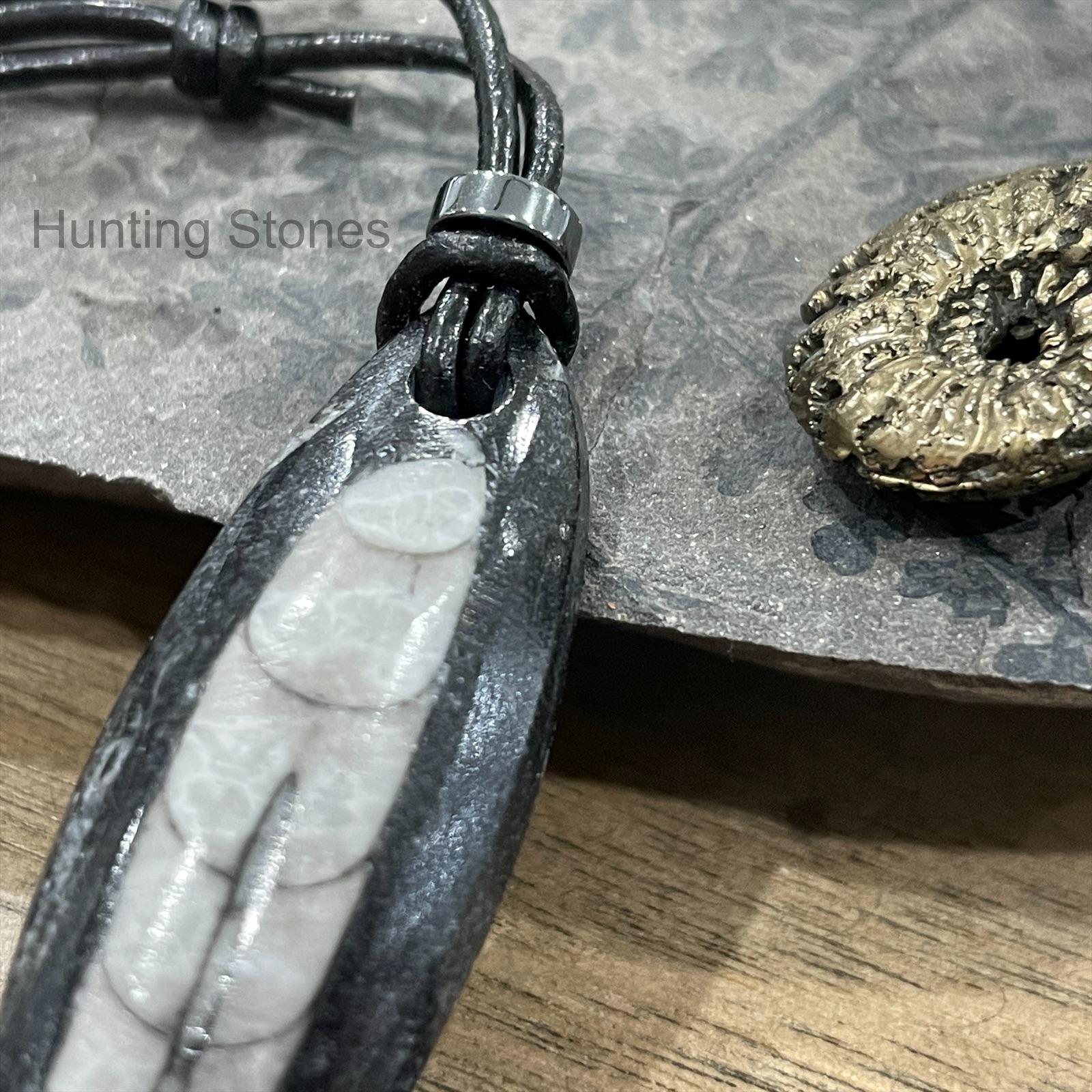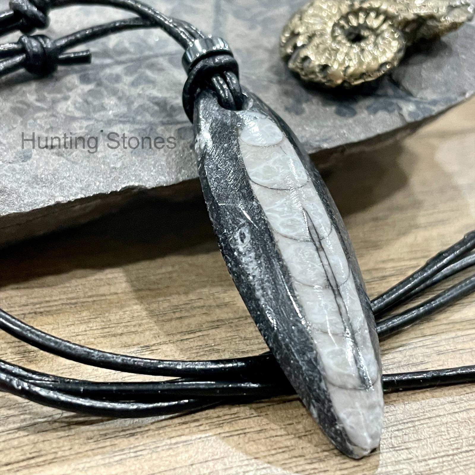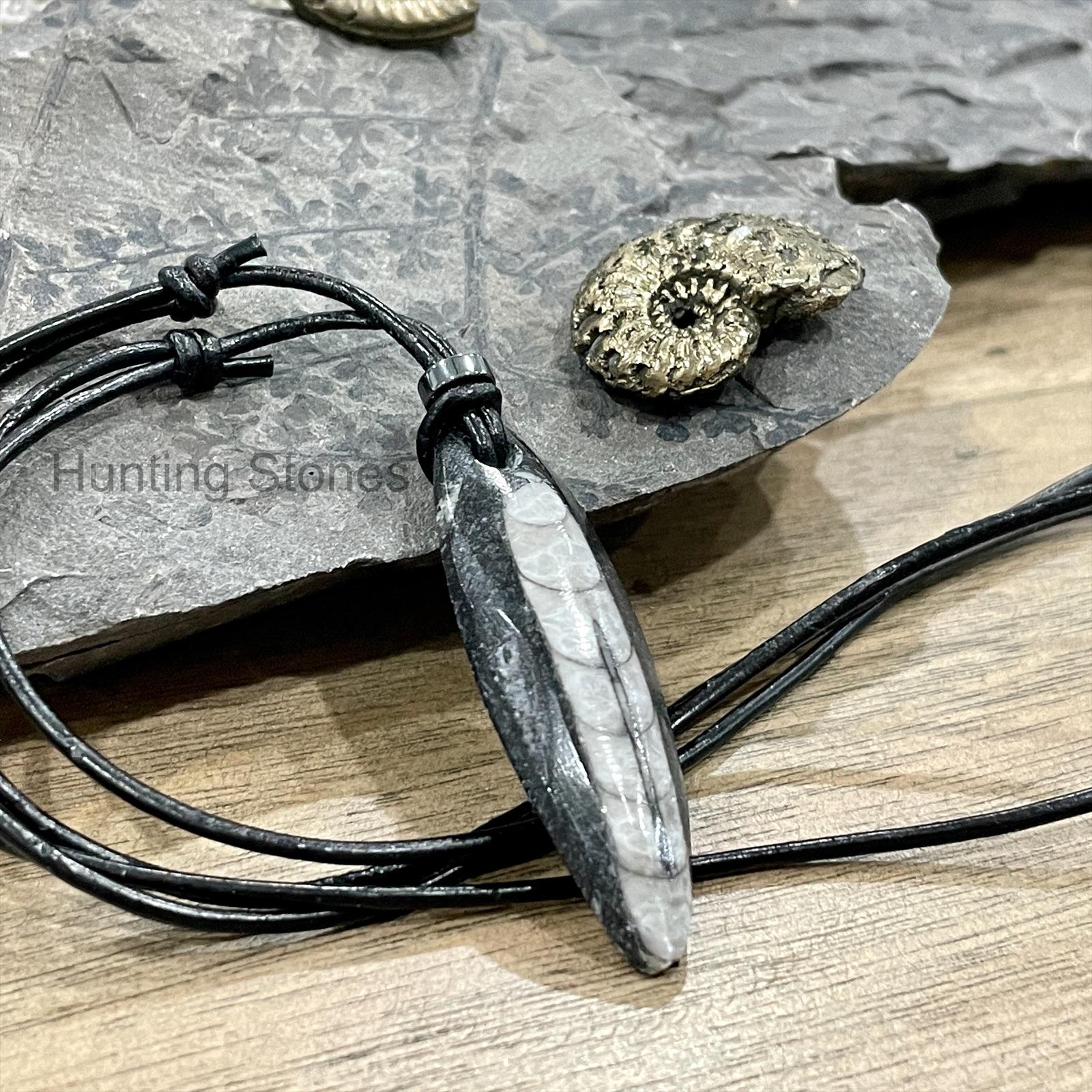 Stunning Orthoceras Fossil and Hematite necklace 4.7cm Genuine Leather