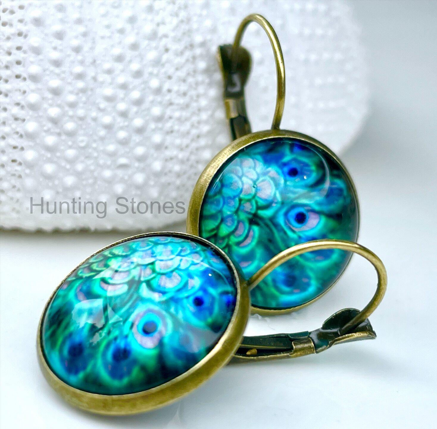 Stunning Peacock Feather Earrings – Antique Brass – Bronze 18mm Glass Cabochon