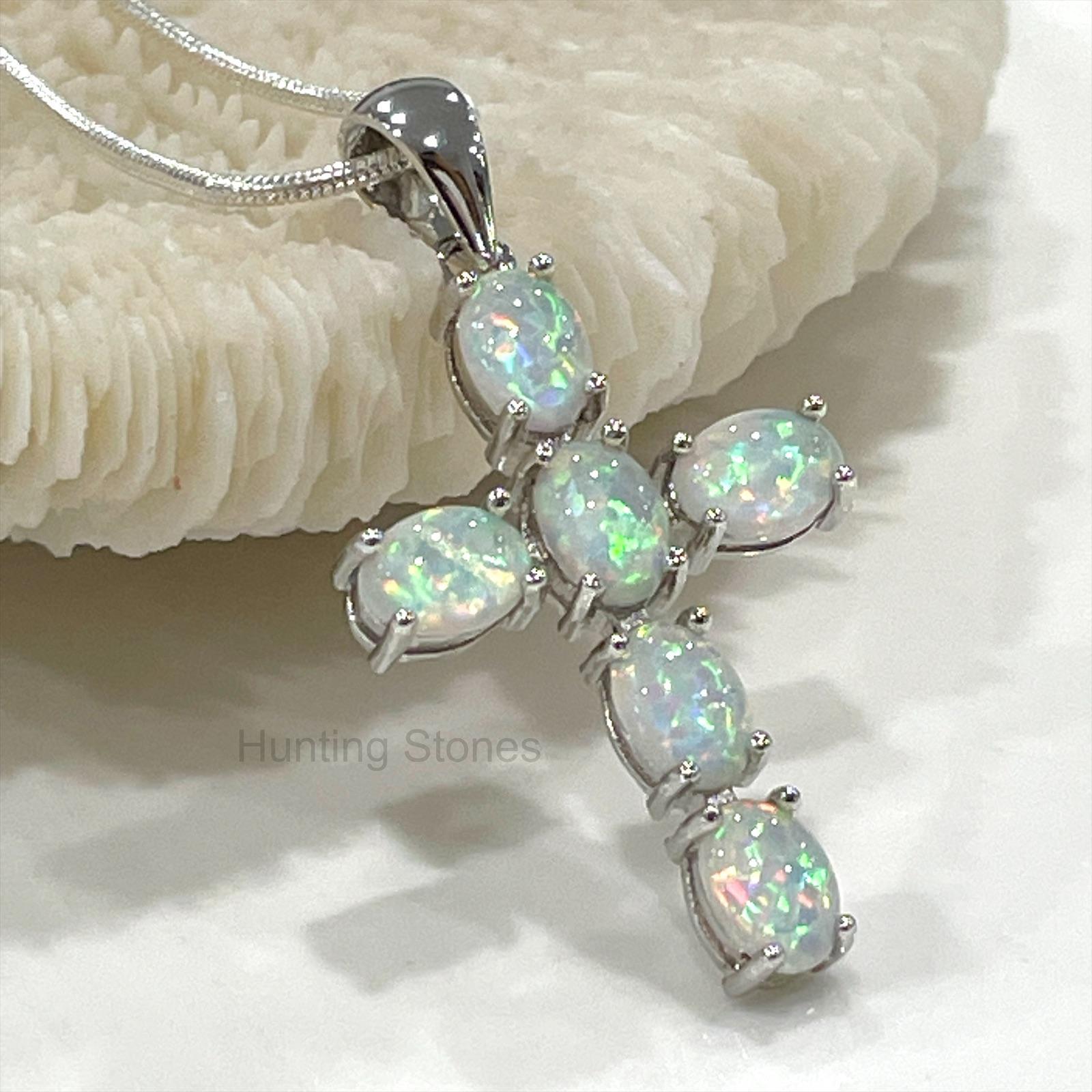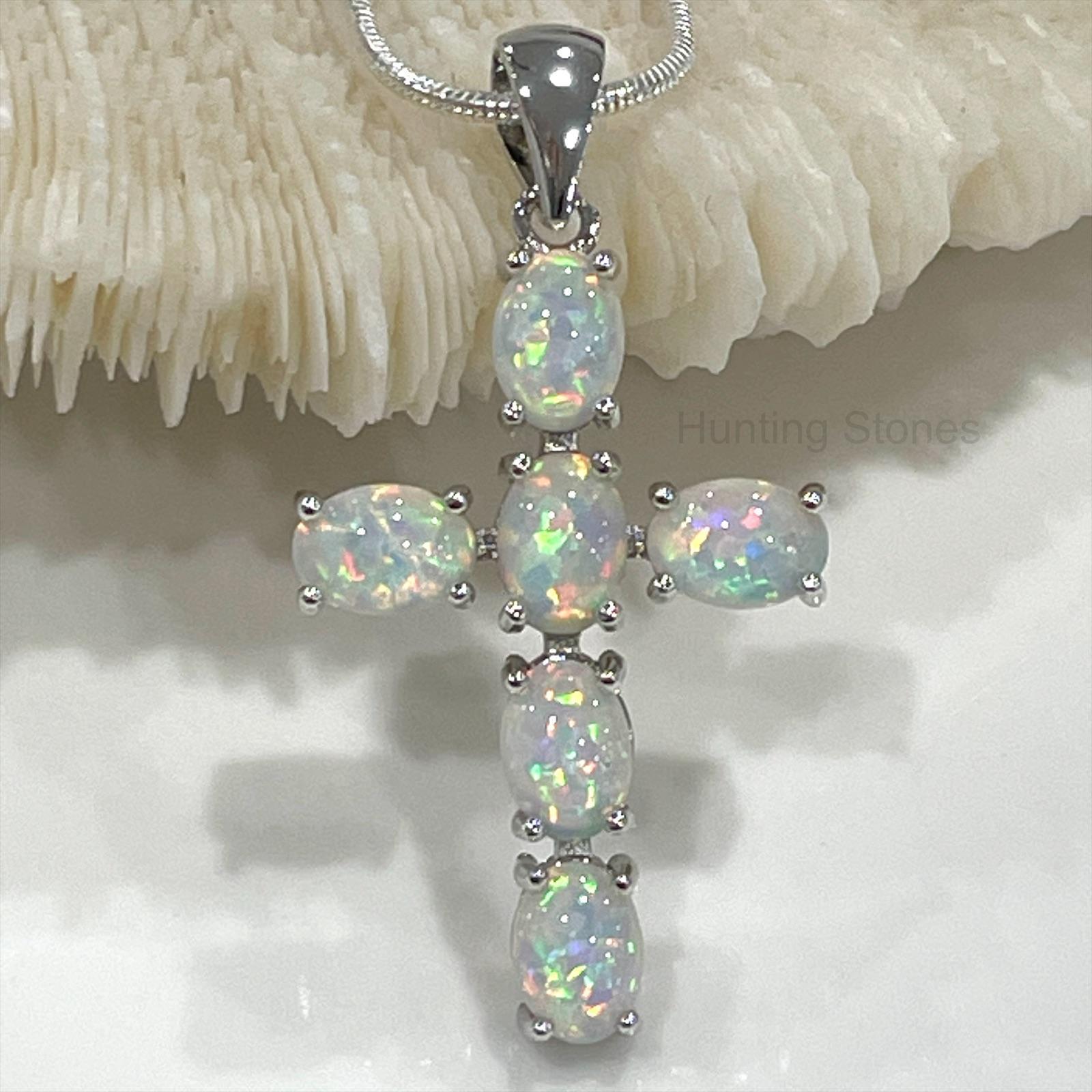 Stunning White Fire Opal Cross Necklace – Silver inlay 29mm
