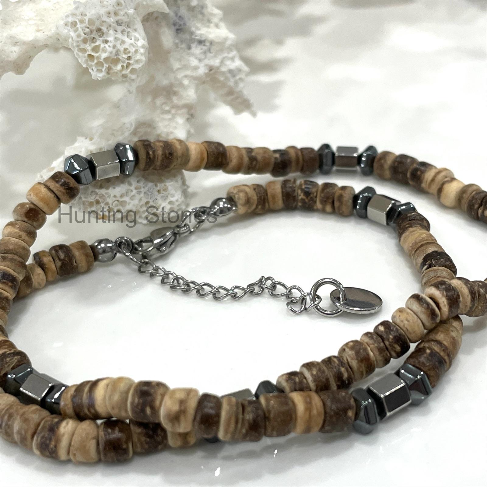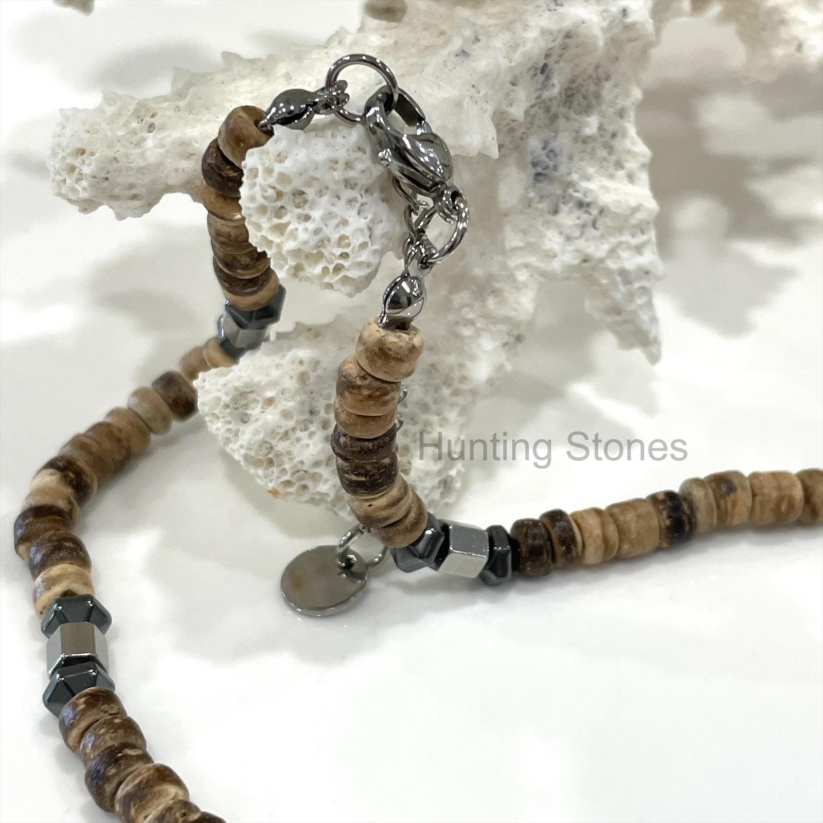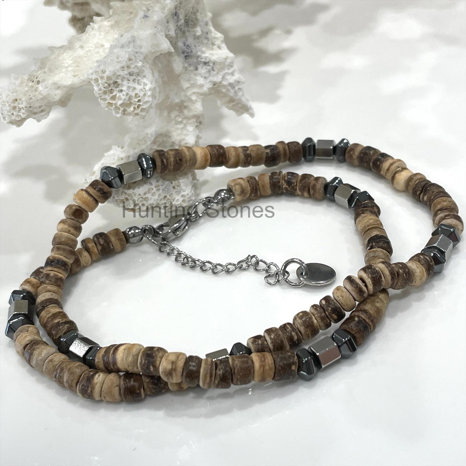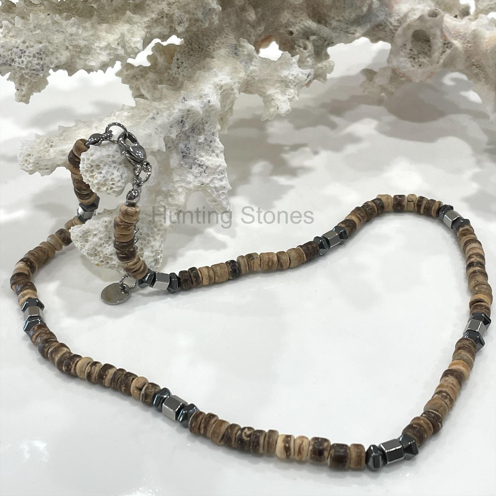 Unisex Natural Coconut Shell and Hematite Bead Necklace 45 to 60cm g