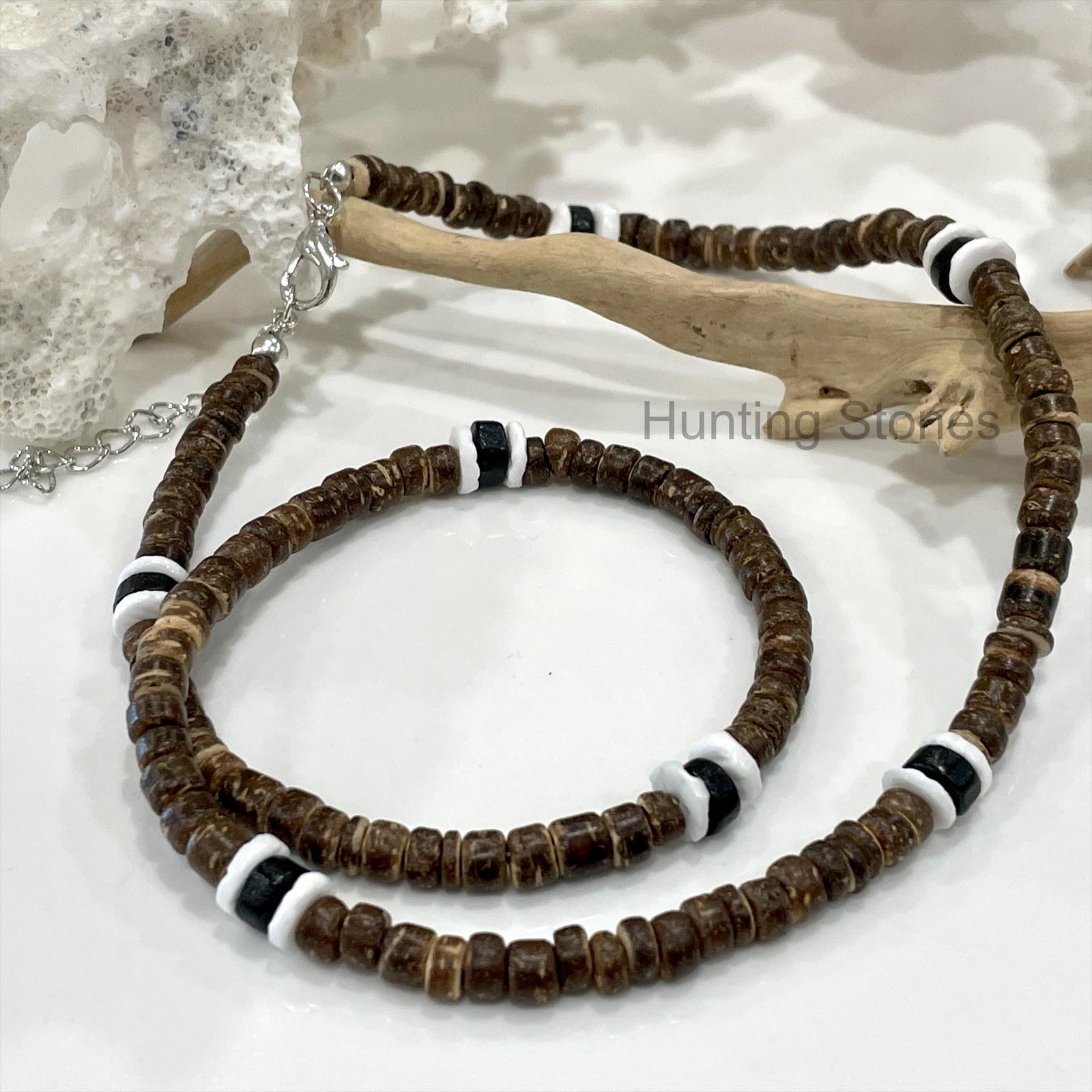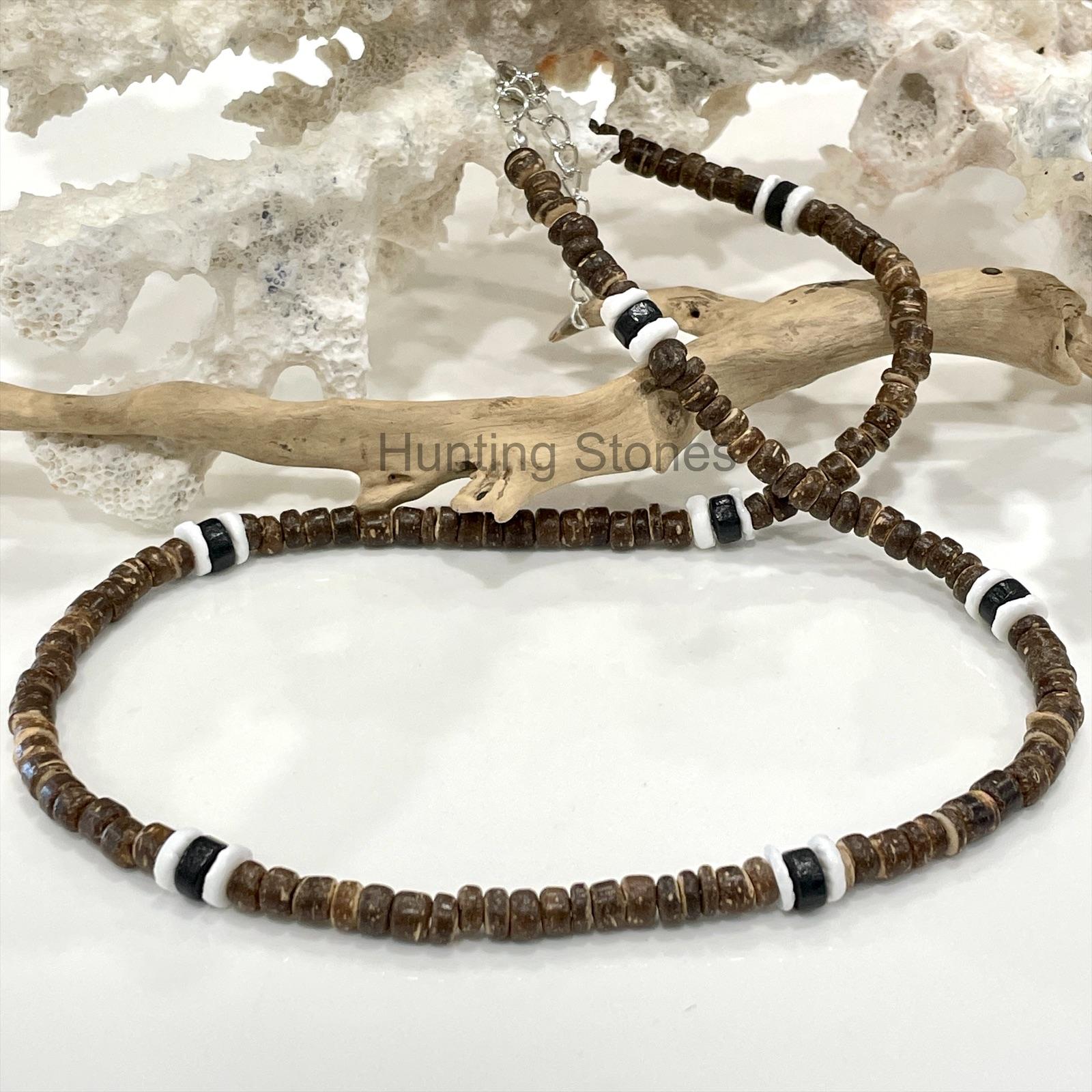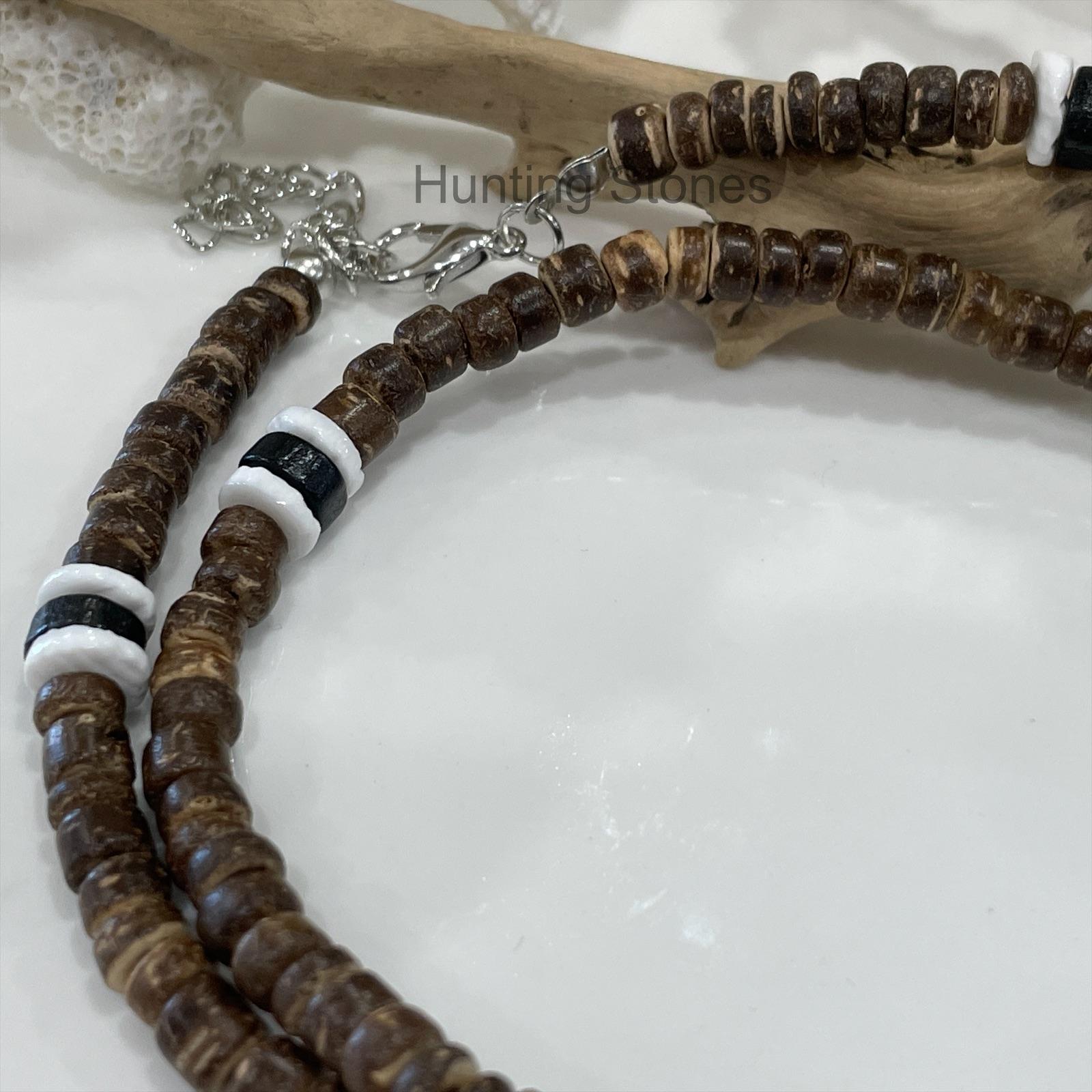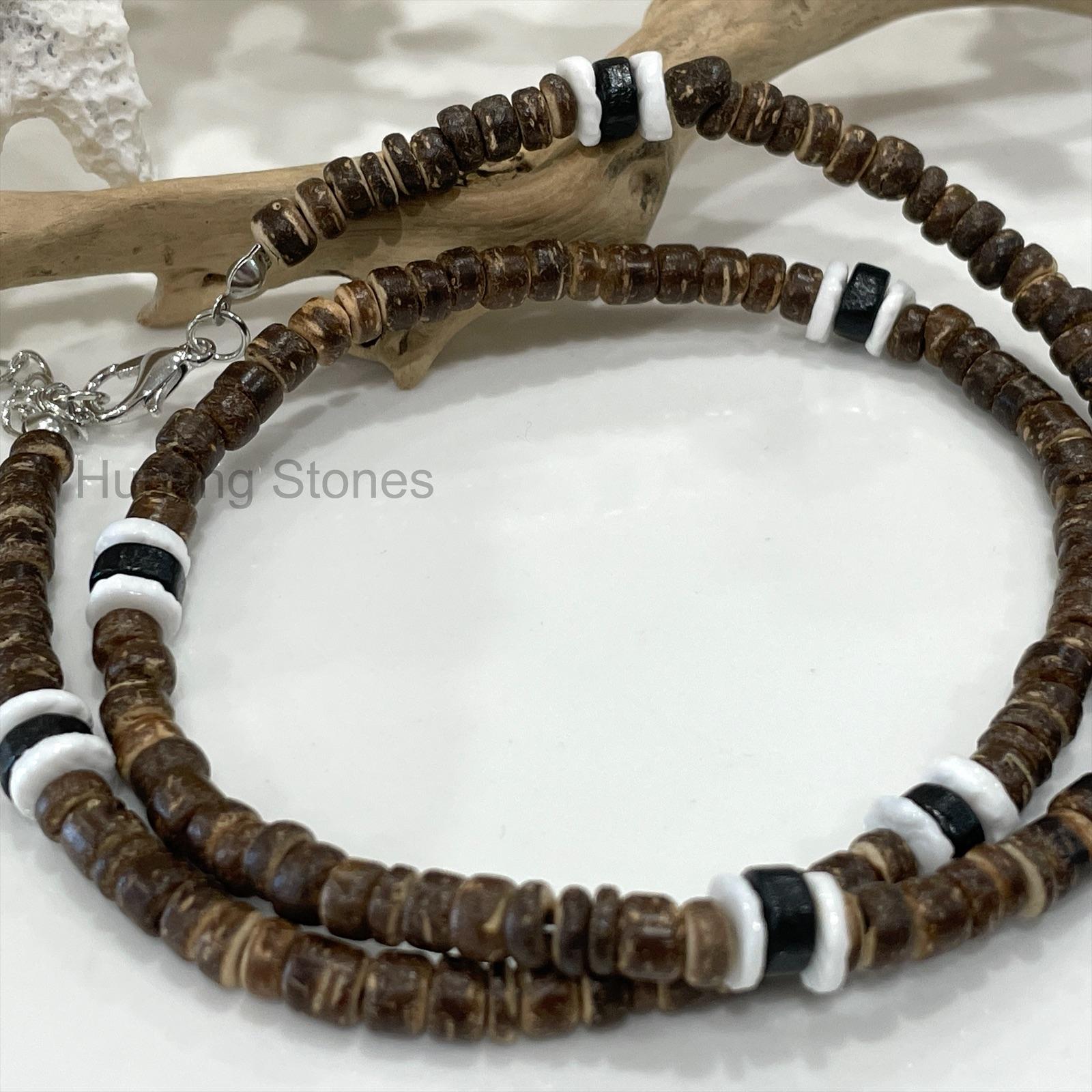 Unisex Natural Coconut Shell and Wood Heishi Bead Necklace f