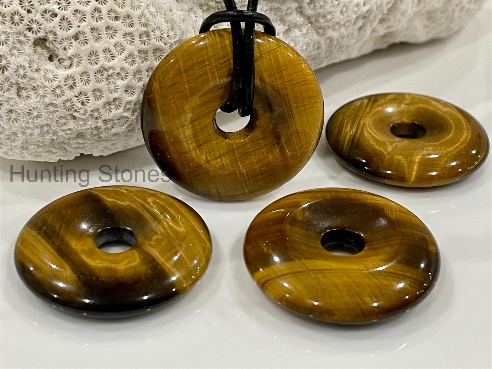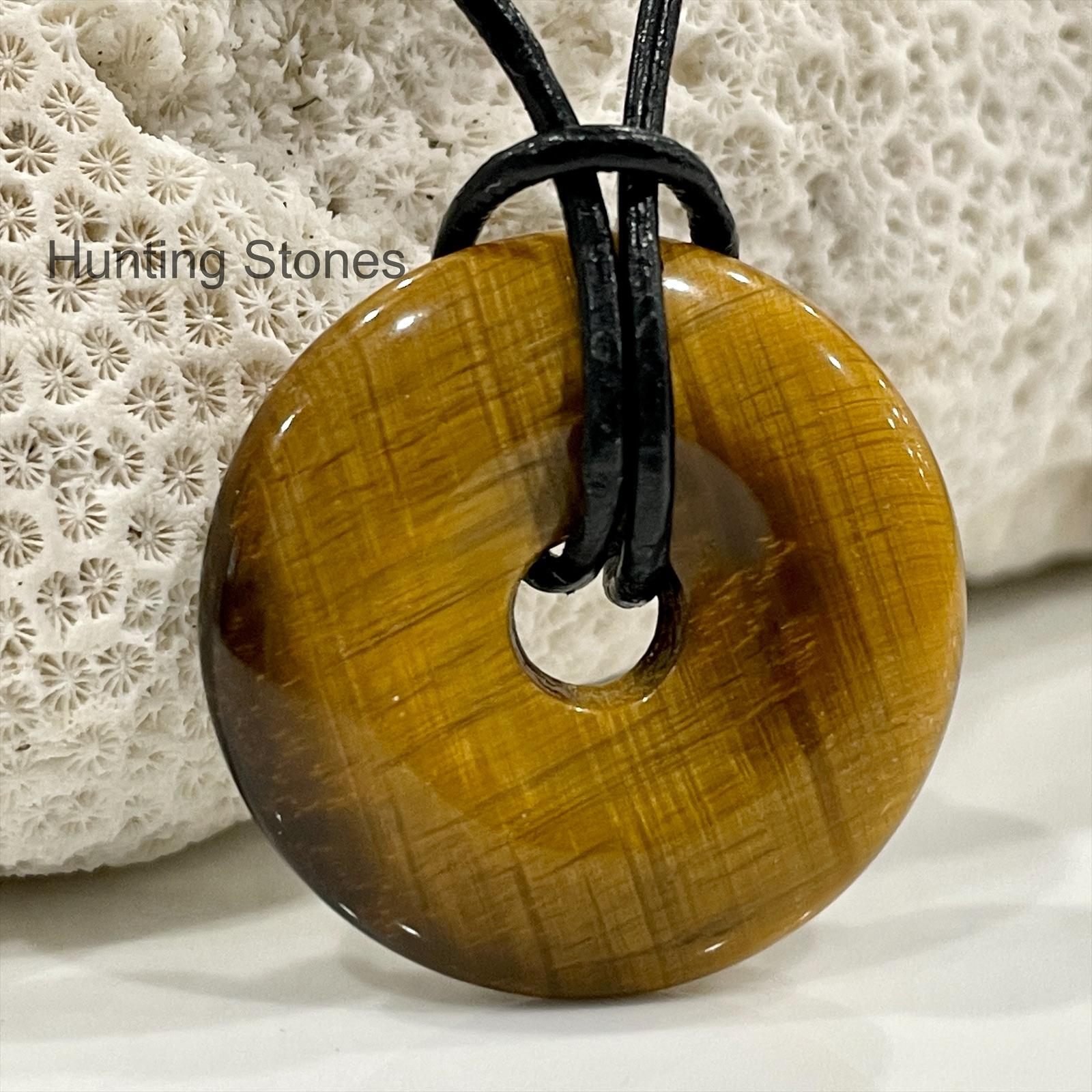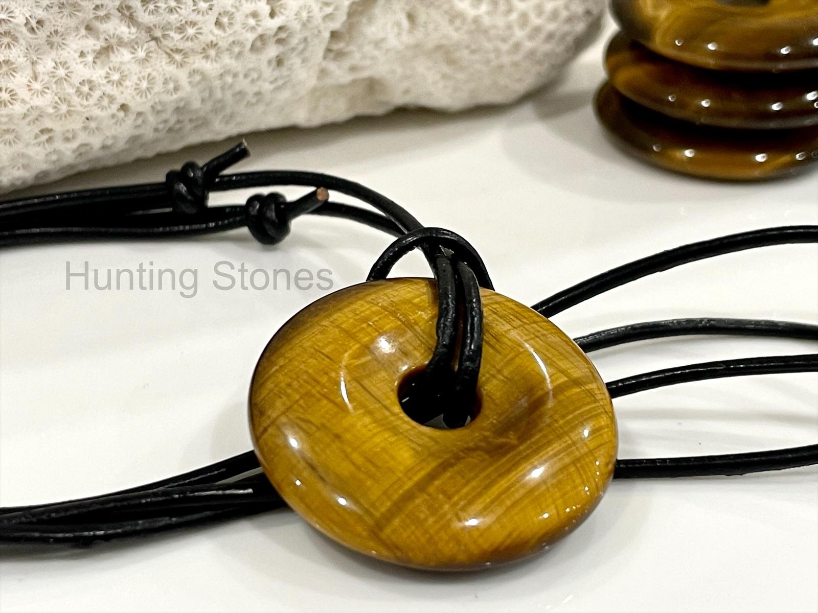 Unisex Natural Tigers Eye Gemstone Genuine Leather Necklace Golden 30mm – slide adjustable – Courage Strength Protection Focus