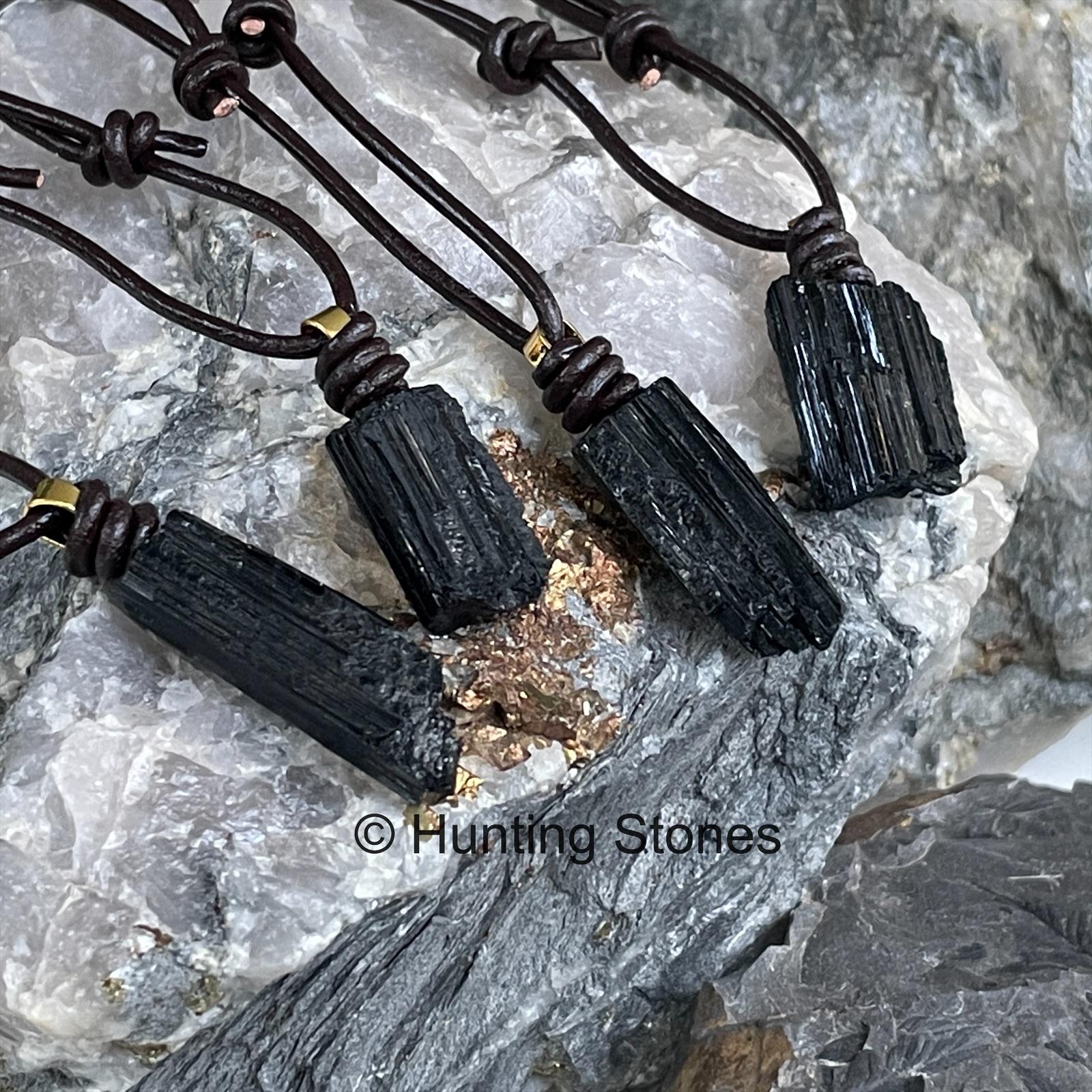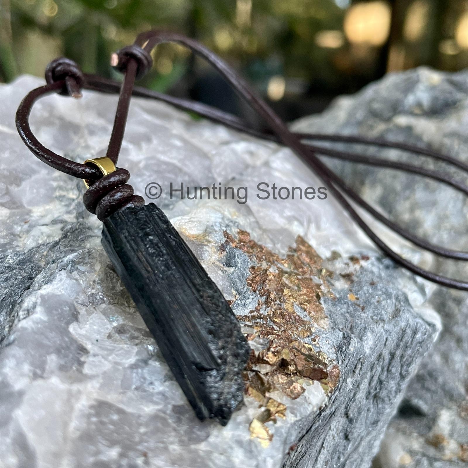 Tourmaline Natural Crystal and leather Unisex necklace – slide adjustable 35 to 60cm – Protection Focus Cleansing